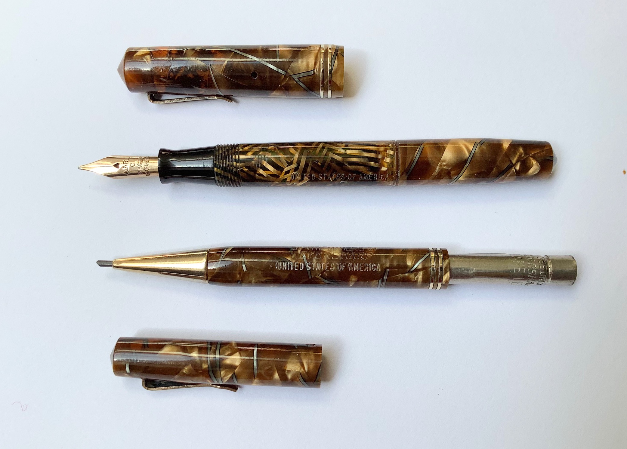 Questo è il set penna e matita nella livrea in celluloide venata Topaz Pearl , a richiamare le tonalità della splendida pietra topazio imperiale , e si distingue per la poco comune doppia veretta fine (di norma la penna ha una sola vera più alta ed ancora meno comune con tre verette fini).