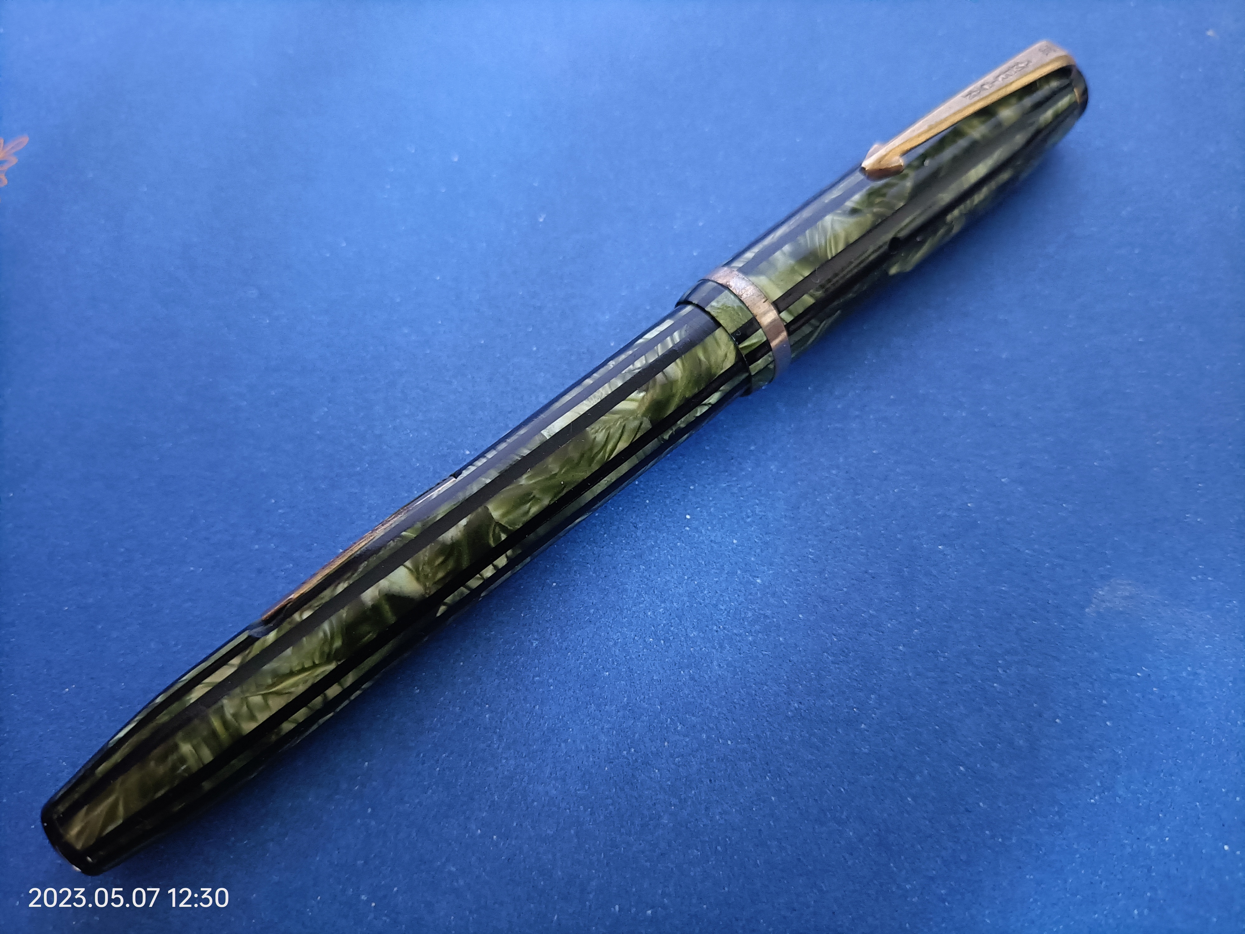 La prima che vi presento è una American, marchio su cui non ho trovato informazioni, dato che non sembra essere affine alle All-American, sottomarca di Conklin (magari!...). Si tratta comunque di una bella celluloide rigata, che a me piace molto. Levetta e clip, military style, sono in metallo solido che alla lucidatura ha dato un risultato molto soddisfacente. Inoltre l'ho pagata veramente poco, meno di 20€ spedizione inclusa.