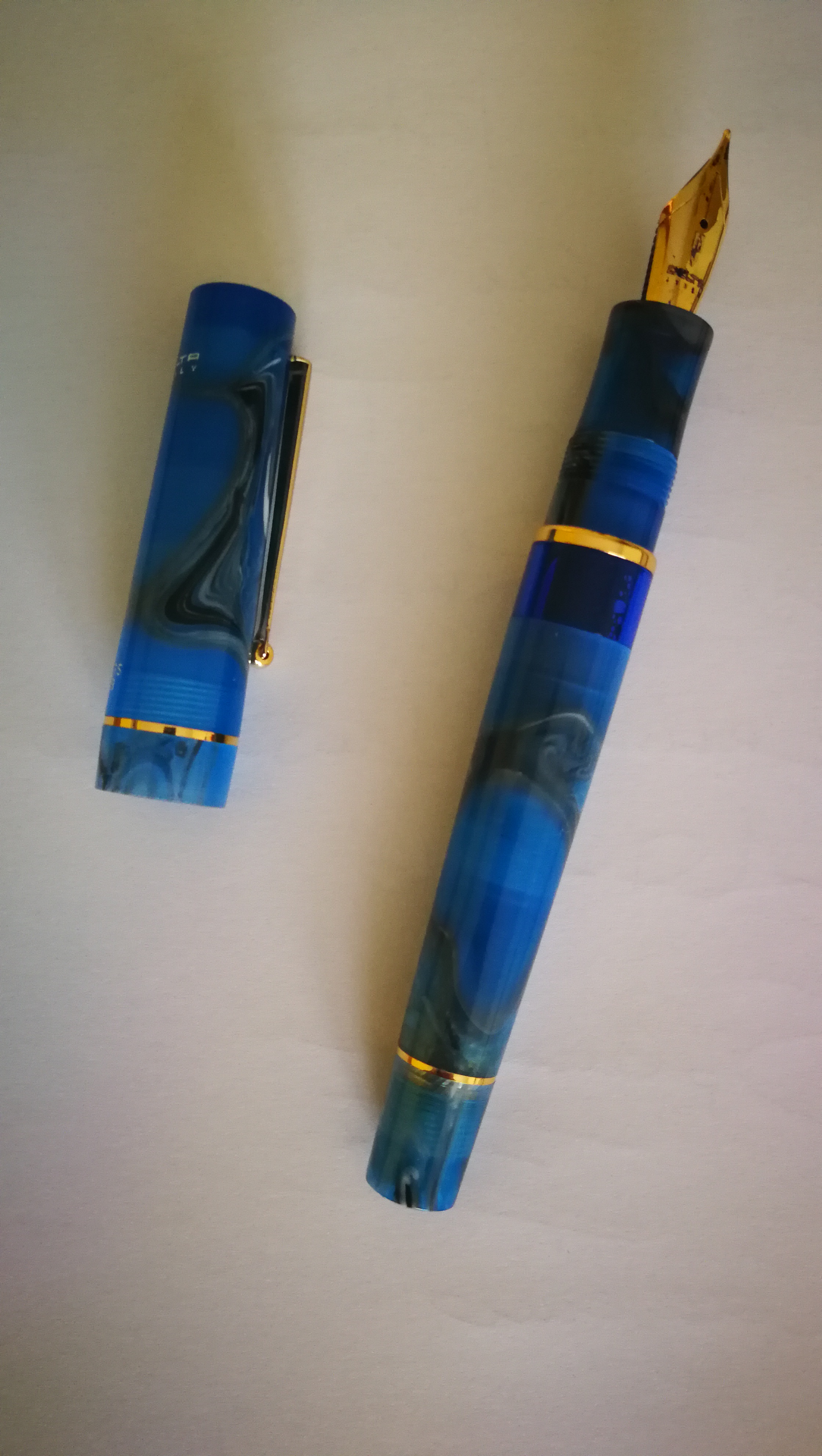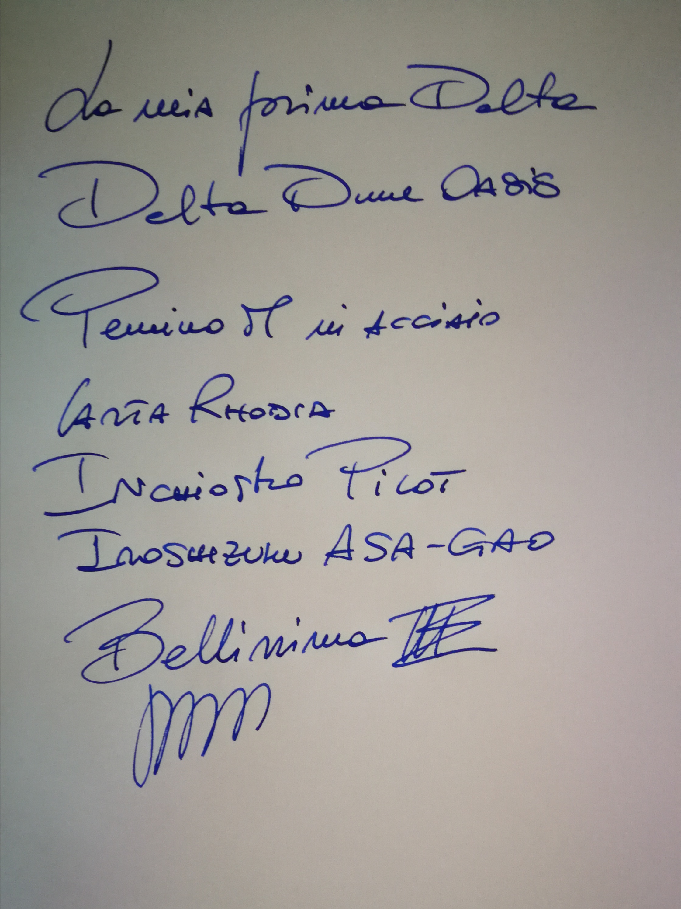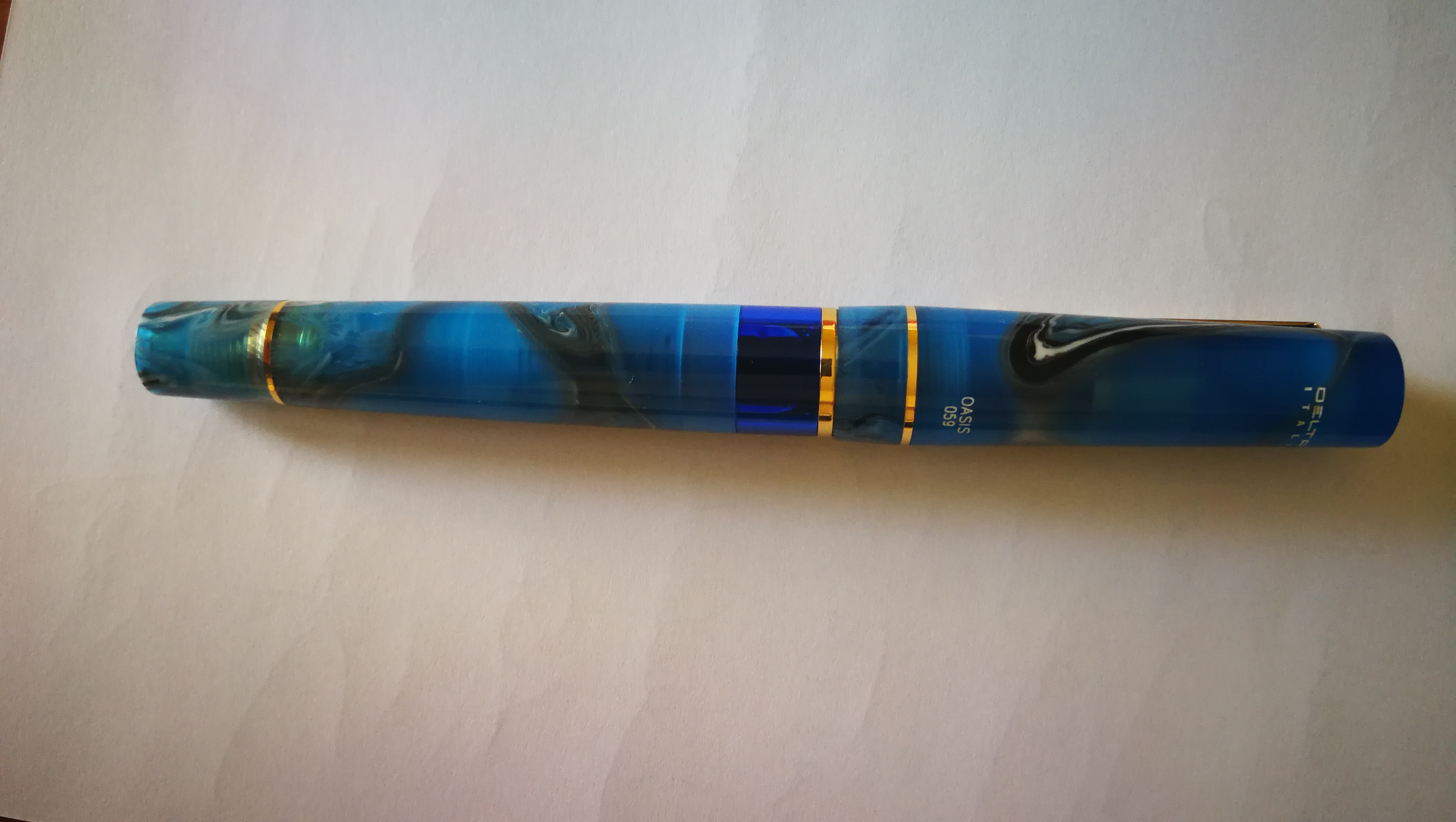 "Meine damen und herren, mes dames et messieurs, ladies and gentlemen" (cit.) ecco a voi la mia prima Delta. Certo non si tratta di una storica ma di un modello del rinato marchio. È la Delta Dune Oasis. Esteticamente è molto bella, tra le più belle che possiedo. Pennino M in acciaio, morbido e scorrevole, la scrittura è fluida. Il caricamento è a stantuffo, la penna è maneggevole. Veramente molto contento di questo acquisto. Allego foto di rito.