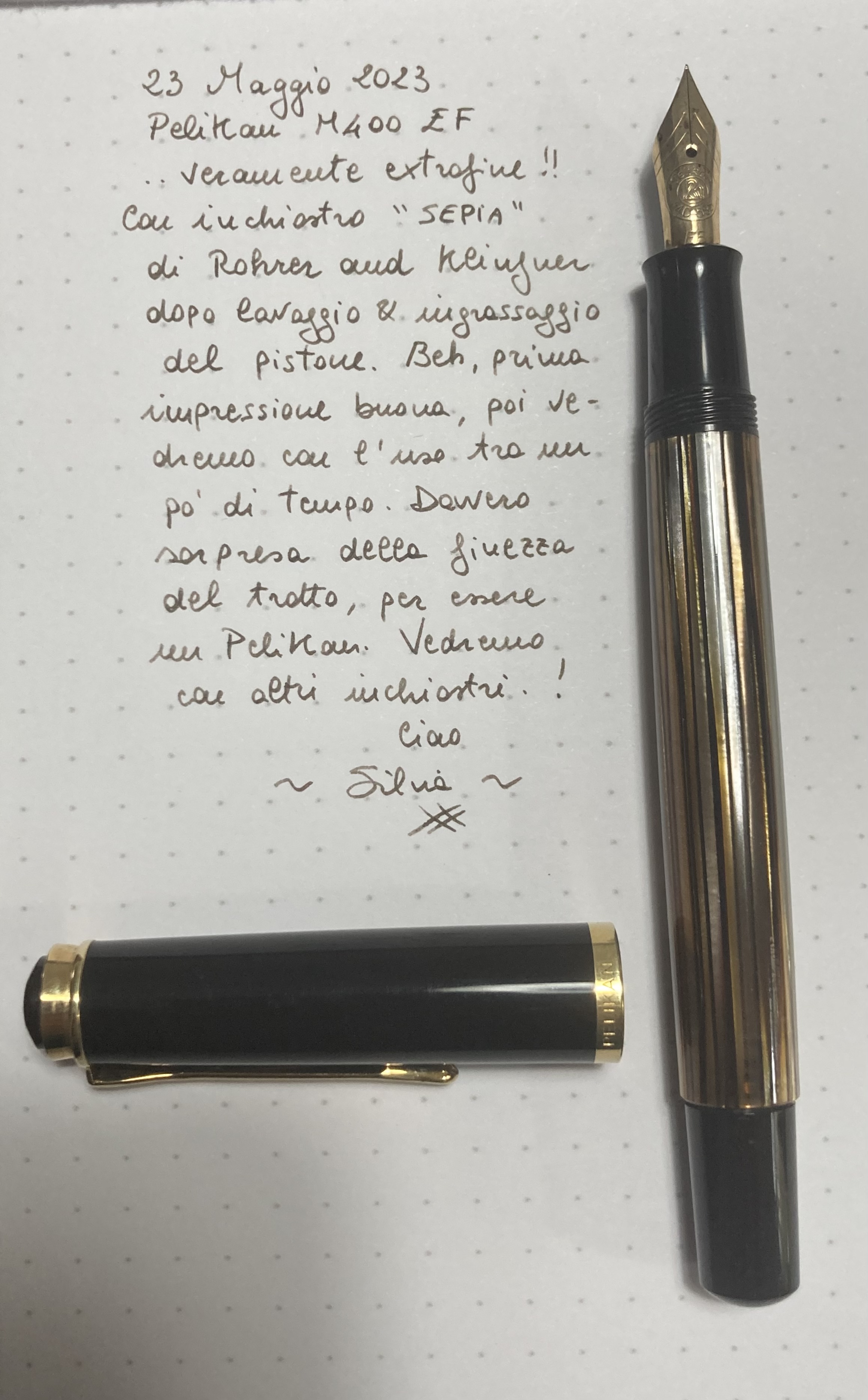 Per una serie di eventi, alla fine è stata lei, tra due simili, ad approdare al mio scrittoio. EF di nome e di fatto! Non mi aspettavo un tratto così fine da una Pelikan, anche se ero stata avvertita che i modelli non proprio recenti avevano il tratto più “contenuto”. A me va benissimo, vista la mia grafia ed anche perché di penne più “succose” ne ho già