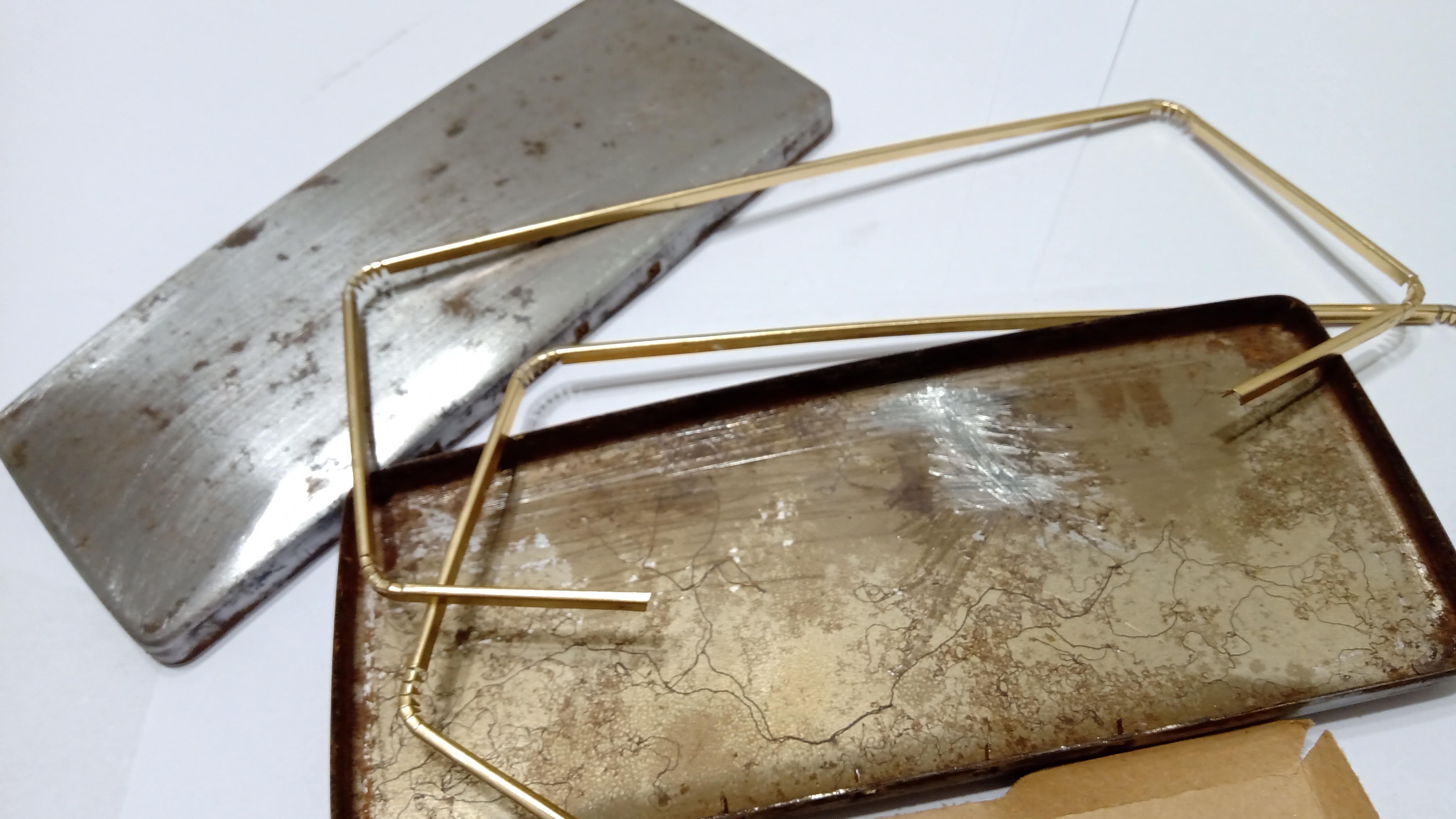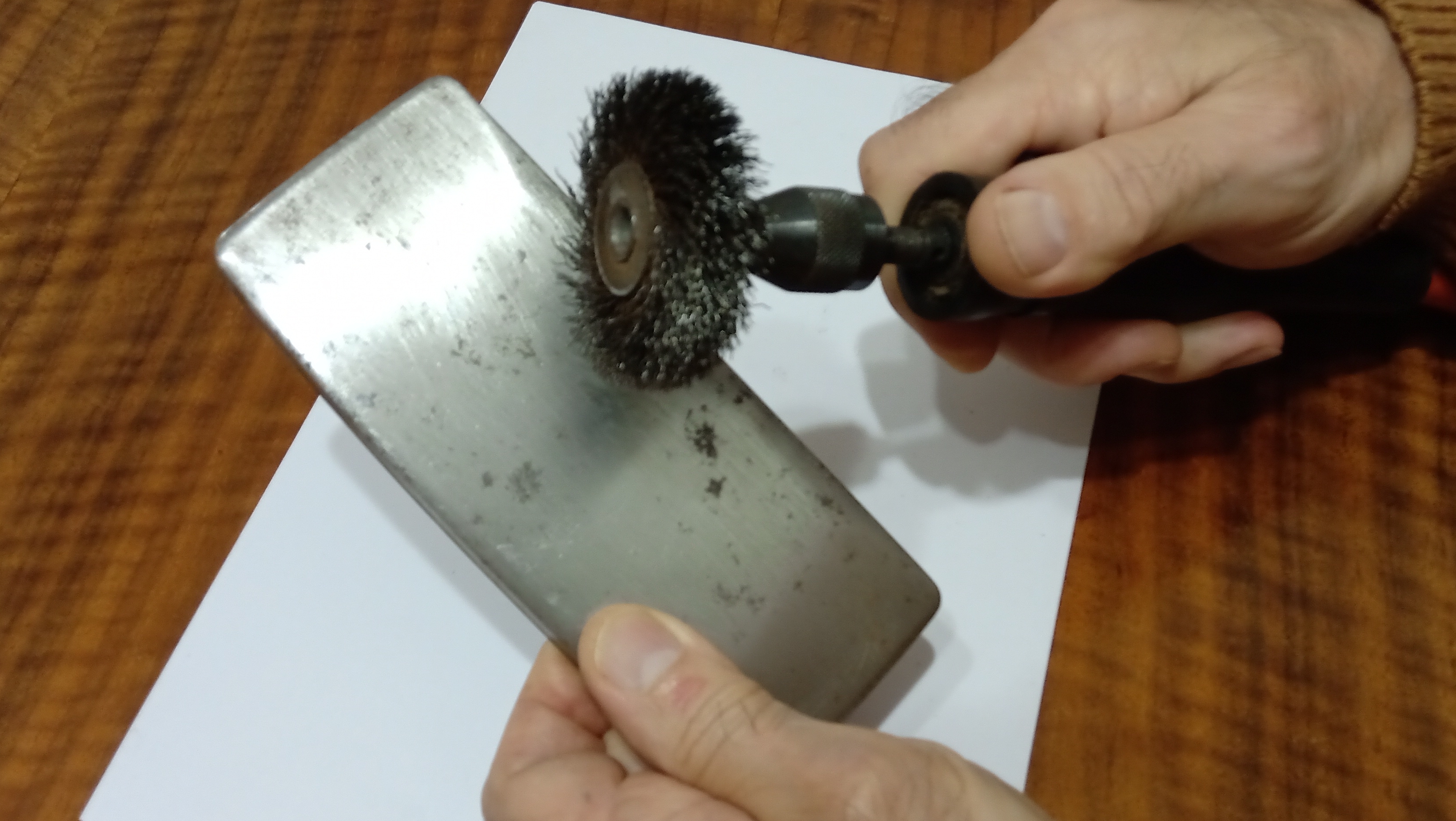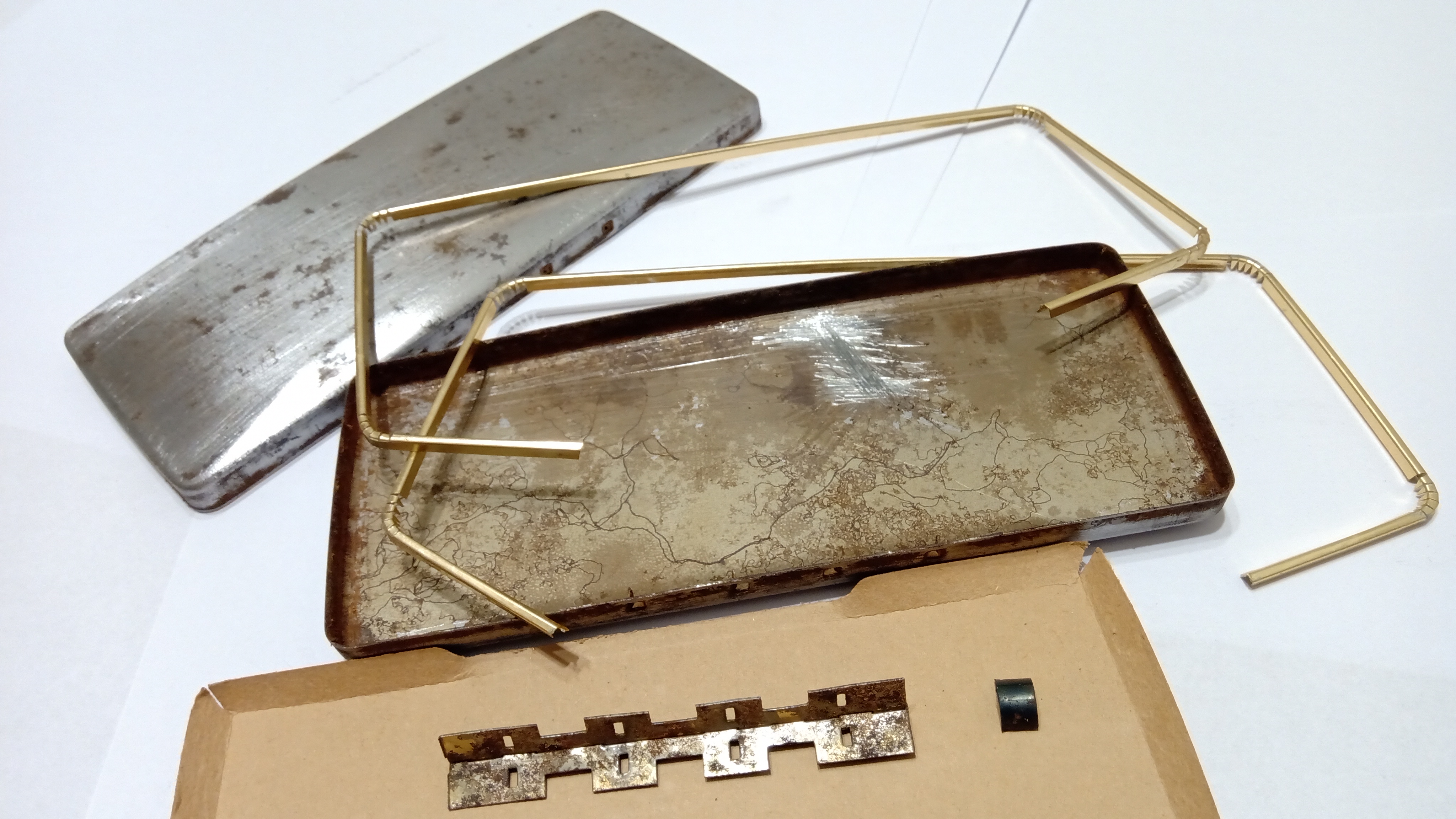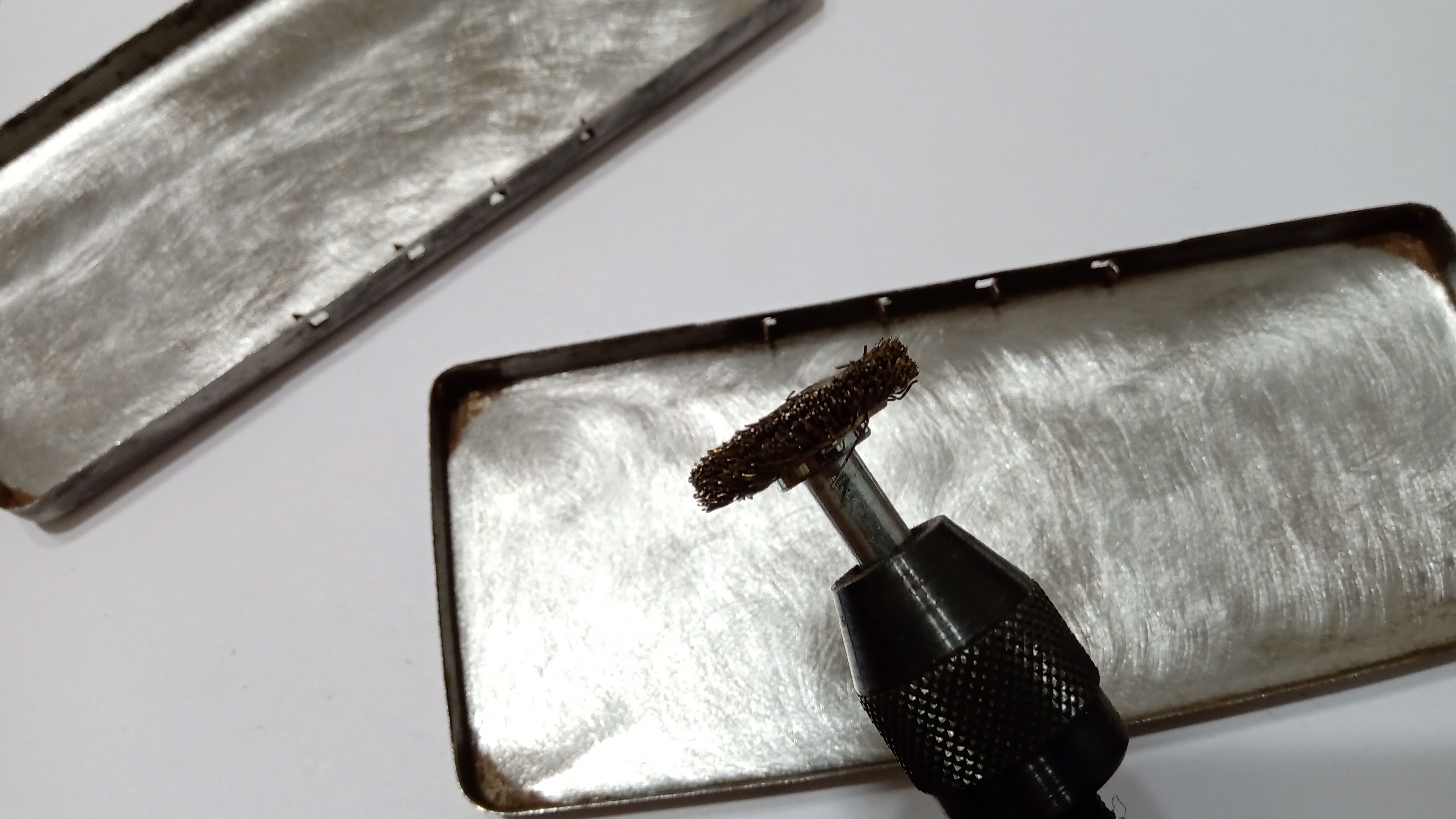 Poi è arrivato il momento di togliere tutto o gran parte dell'ossido dalla lamiera, cosa che è stata fatta con una spazzola d'acciaio e altre più piccole di bronzo per gli angoli più difficili...