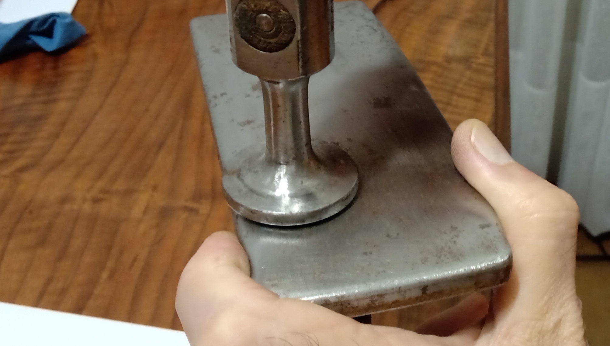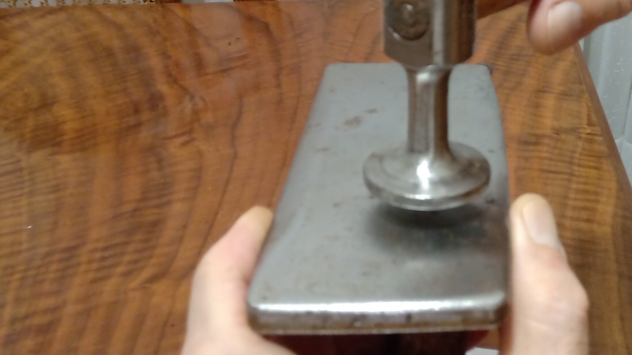 Successivamente, e usando un martello da calzolaio piatto e un blocco di legno come supporto, ho iniziato a rimuovere le piccole ammaccature e ammaccature che aveva l'impiallacciatura.