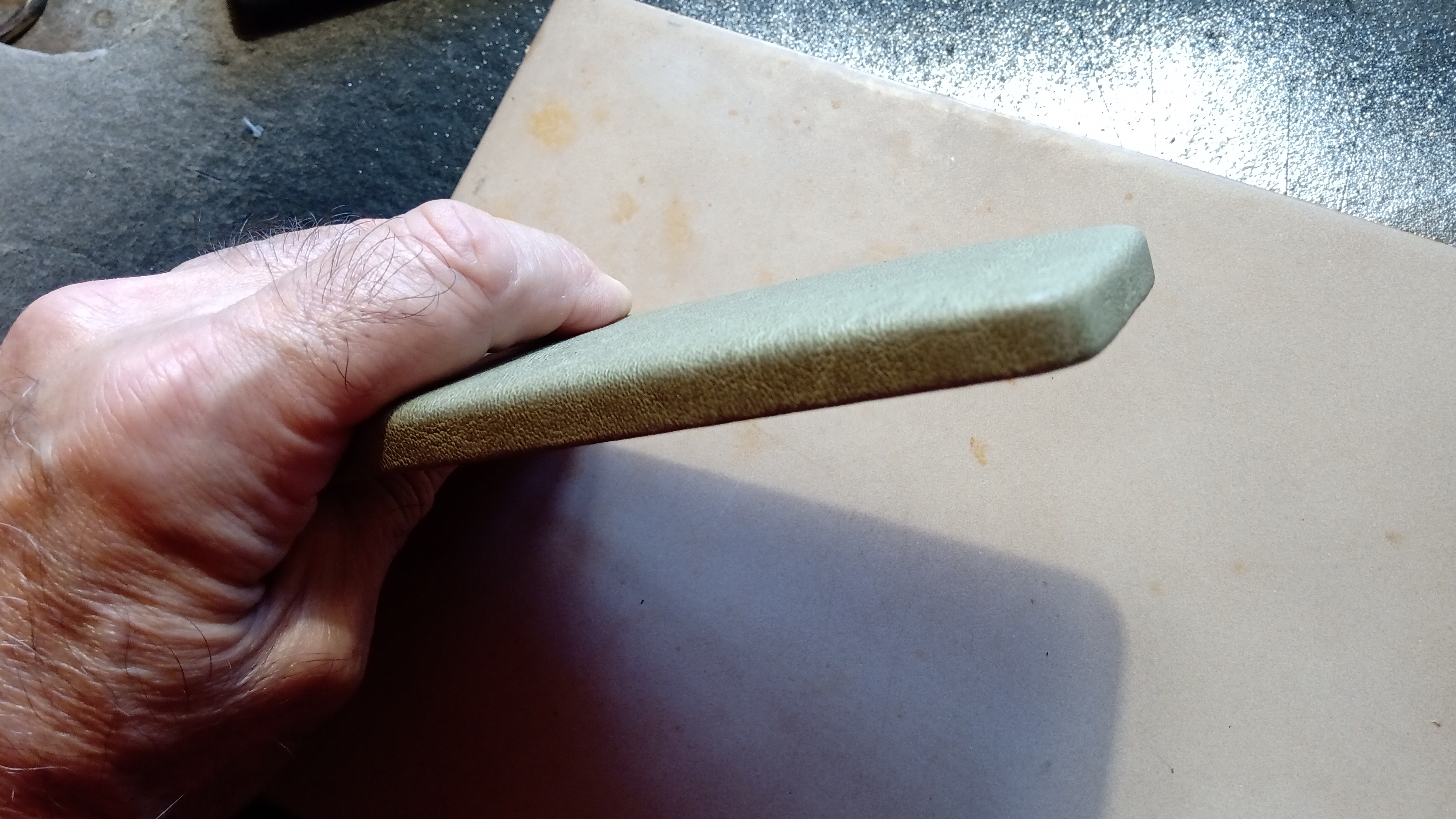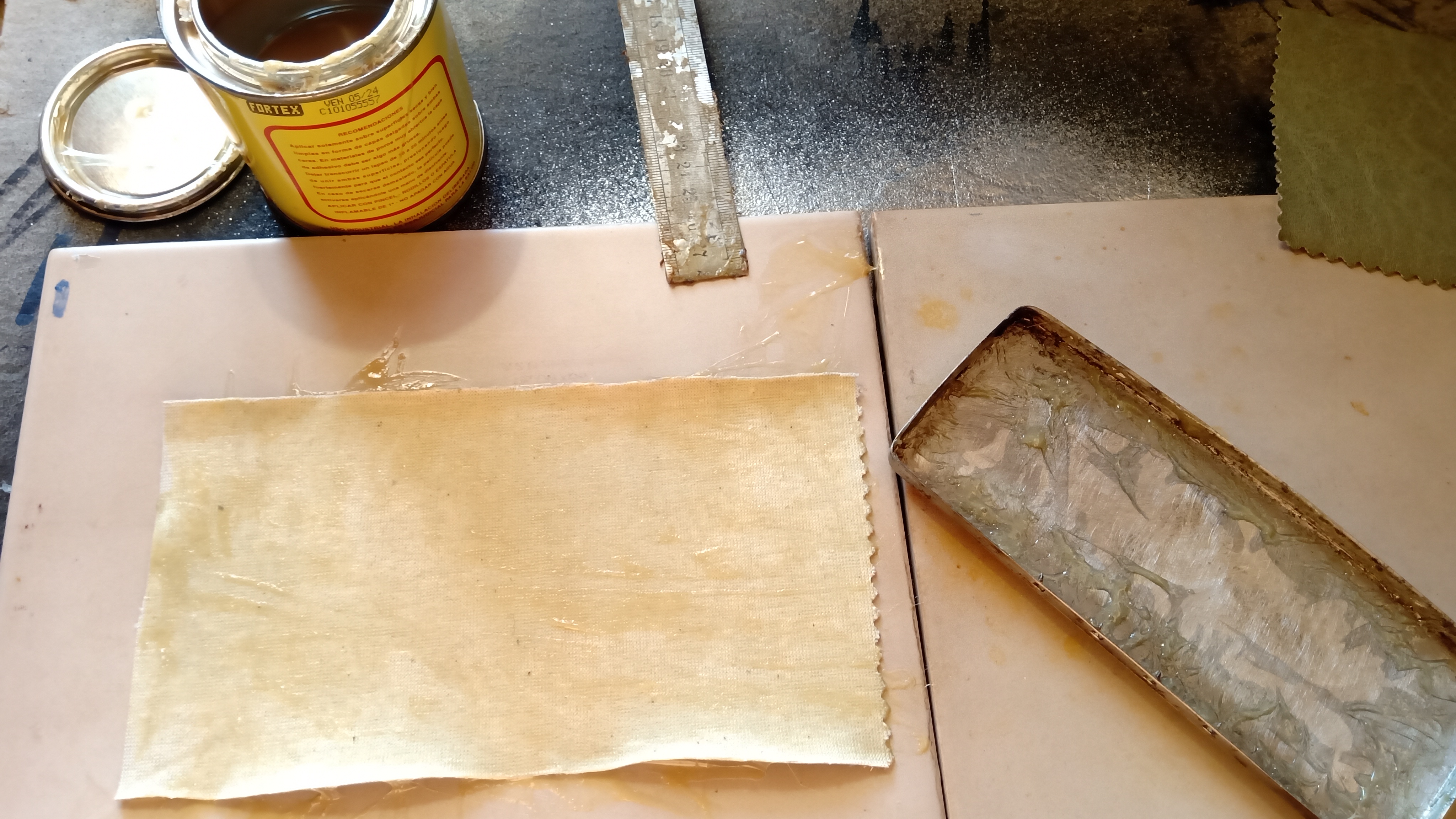 Il cemento di contatto favorisce l'operazione, poiché ammorbidisce il materiale in similpelle e ci permette di allungarlo negli angoli e nei bordi, ma dobbiamo stare attenti a non allungarlo troppo e finire per rompere il materiale.