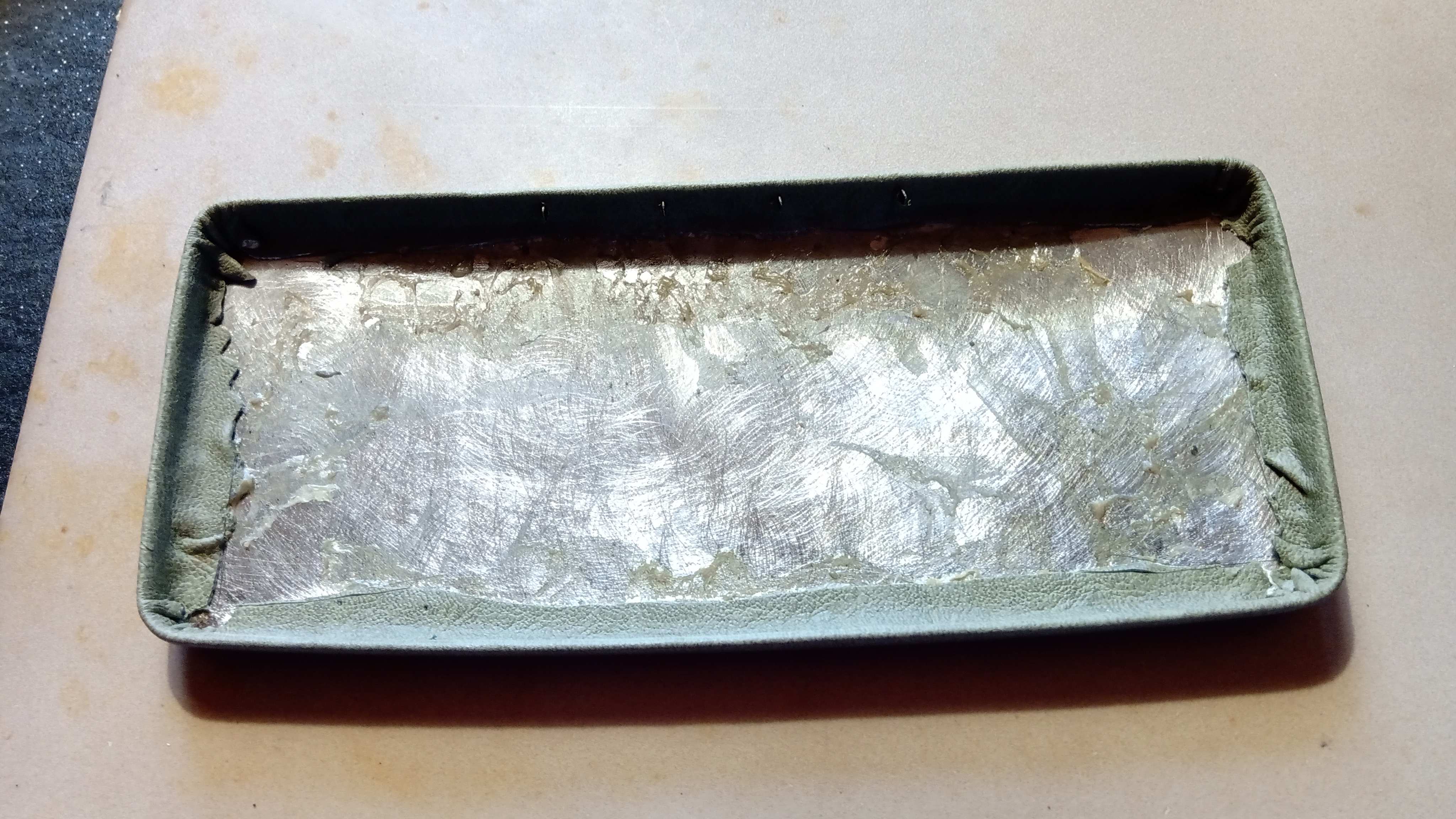 Veniamo ora al momento di rivestire la culla del coperchio, centrata, e con la tensione corrispondente per generare quei bei riflessi che avevano dentro le vecchie scatole di Sheaffer...