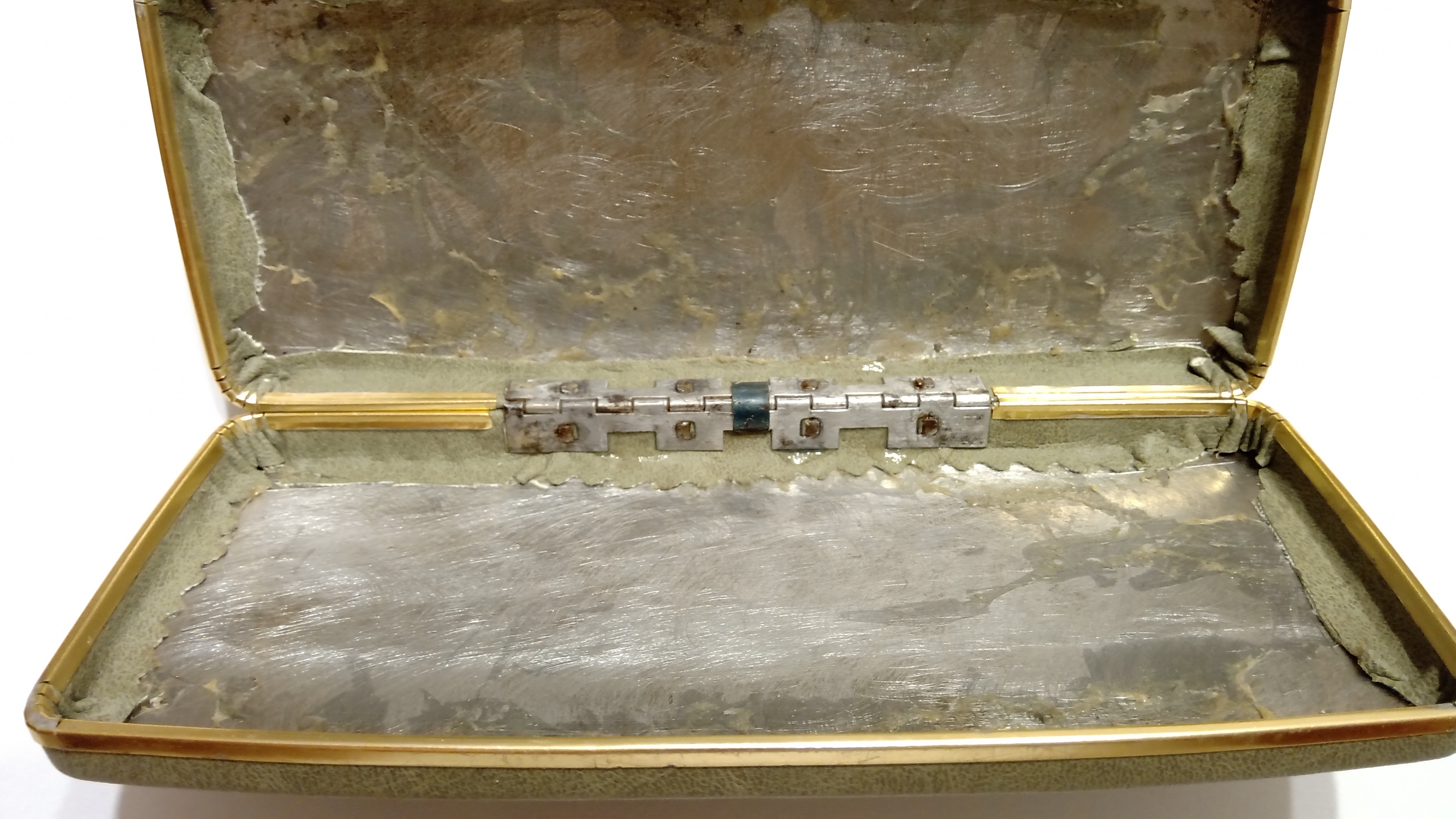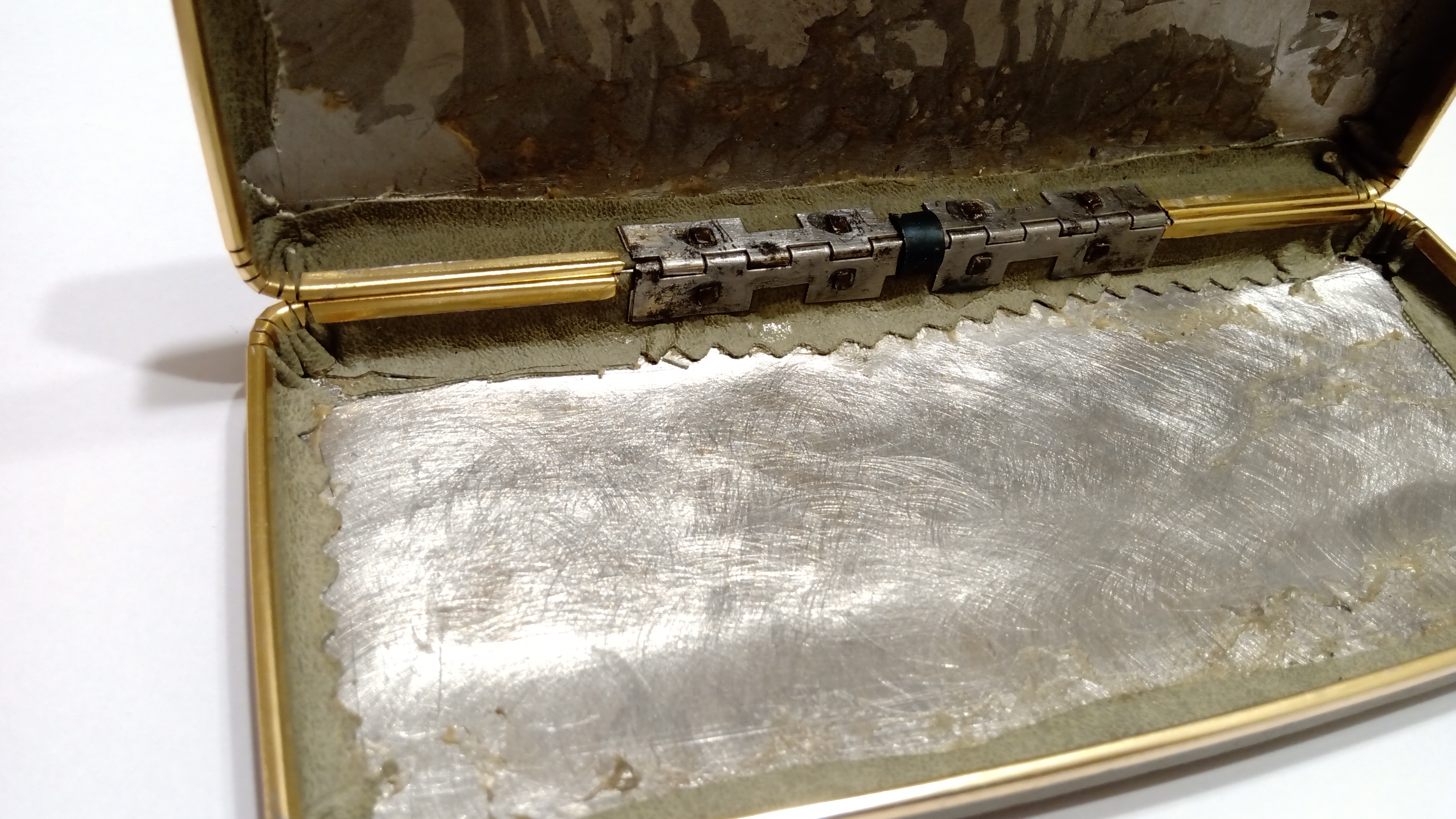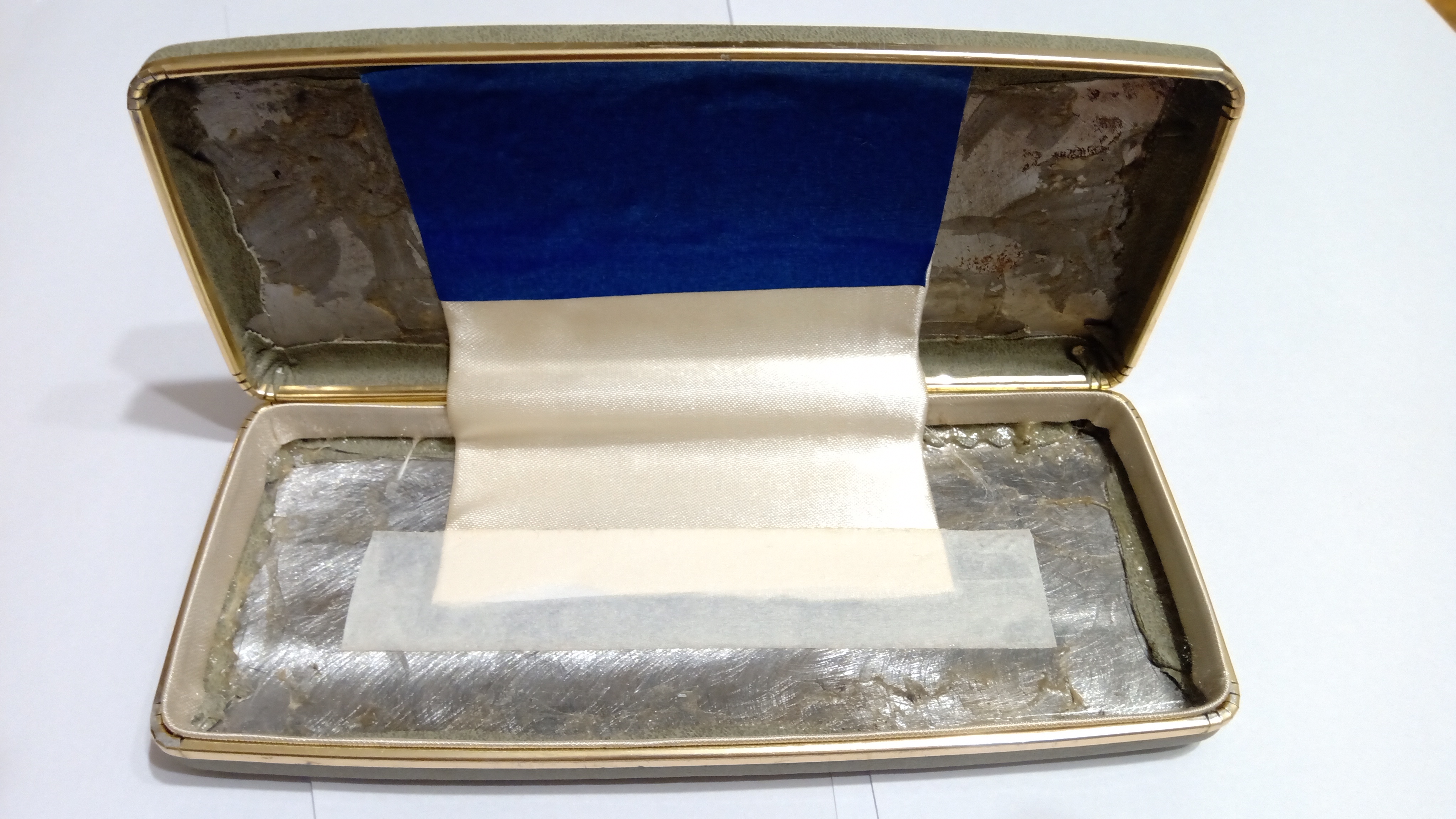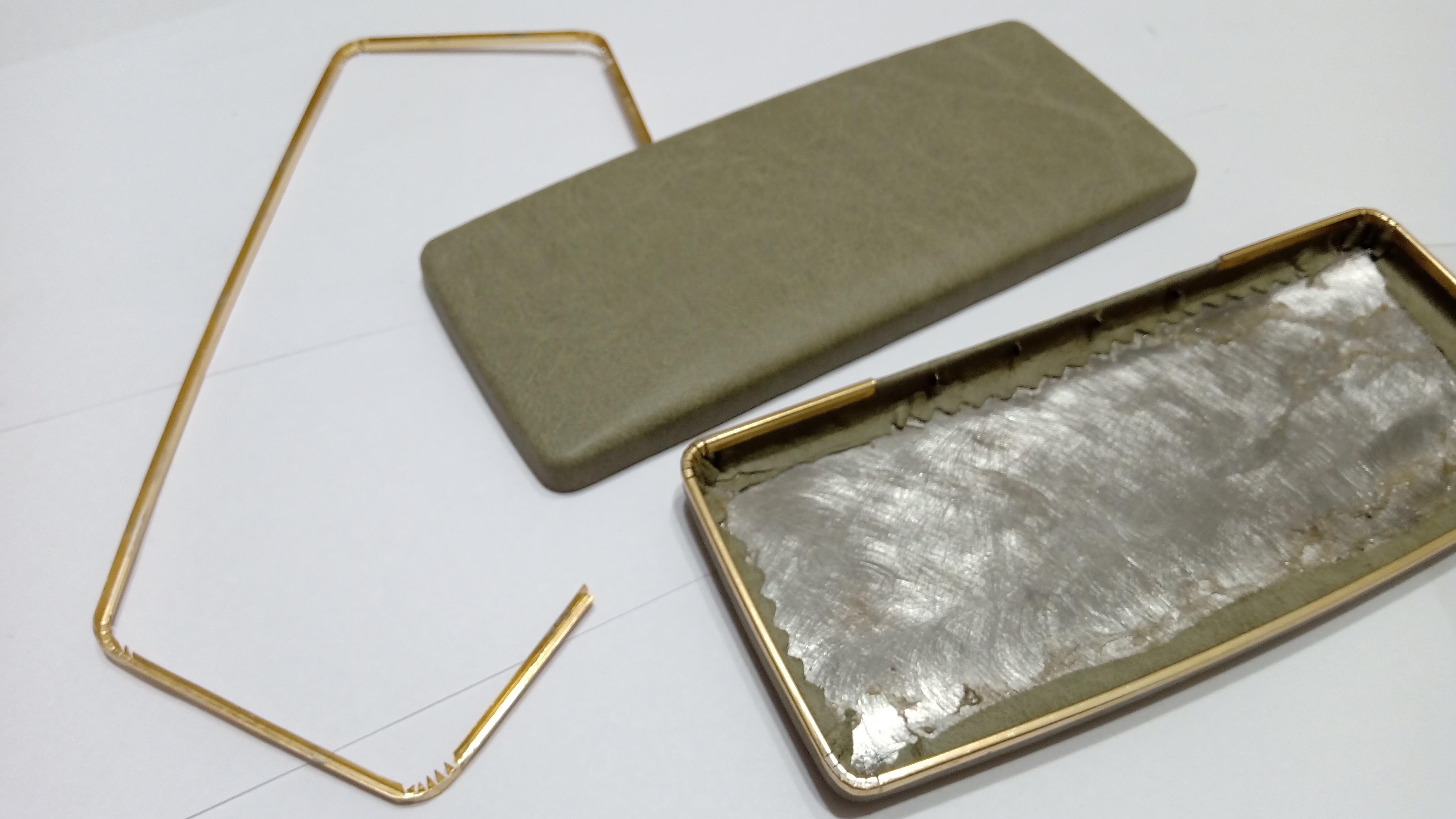 Il primo di tutti i passaggi è stato quello di rimuovere le culle di cartone foderate di raso, mal trattate e macchiate di inchiostro, quindi rimuovere la cerniera completamente arrugginita, dispiegando le falde di lamiera.