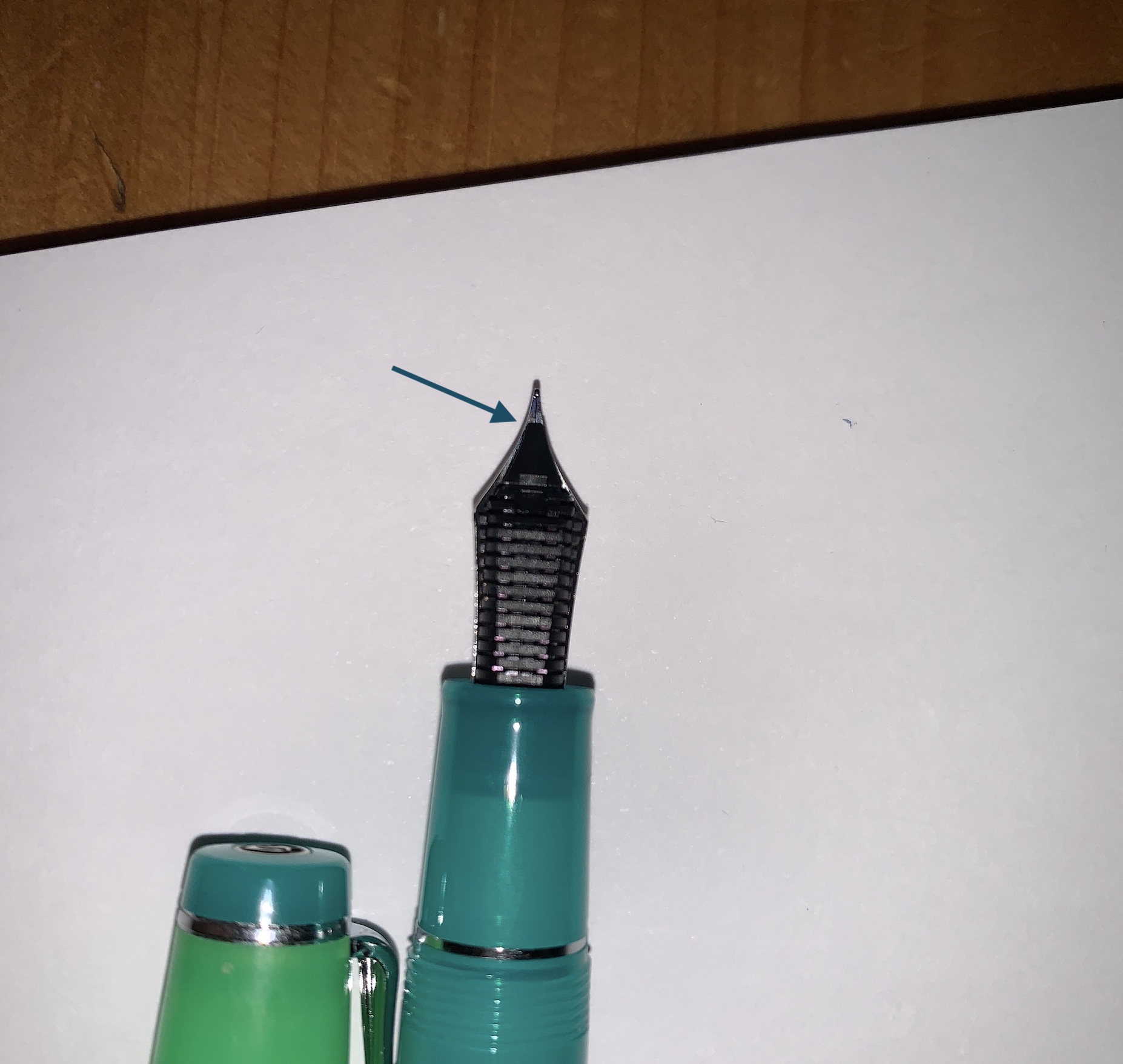Appena arrivata la penna ho fatto delle foto al pennino e, per quello che almeno mi sembra di vedere, questo presenta un piccolissimo spazio tra i rebbi attraverso i quali si vede il foglio (foto con freccia), ed inoltre nel lato posteriore mi sembra che l'alimentatore non sia perfettamente allineato con il pennino.
