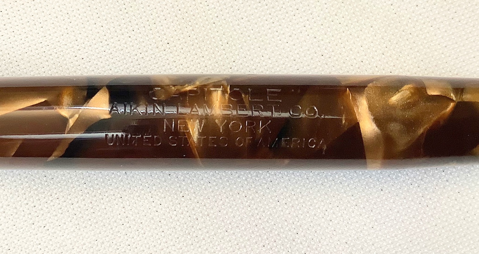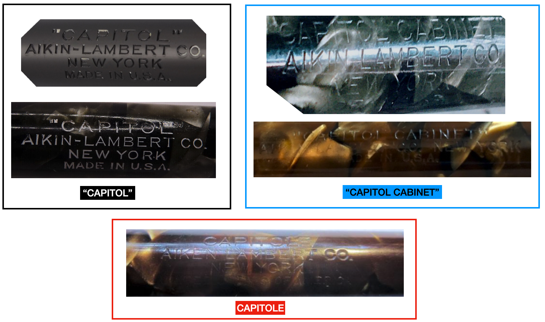 Perché a qualcuno non sarà sfuggito che la penna in questione è una Aikin Lambert CAPITOLE , non una "CAPITOL" e nemmeno una "CAPITOL CABINET" . Stessa penna in celluloide , stesso periodo ma nomi leggermente diversi. Poi c'è l'inghippo che alcune CAPITOLE sono marcate AIKEN LAMBERT CO , per le quali si pensa possano essere delle copie belle e buone delle originali AIKIN Lambert .