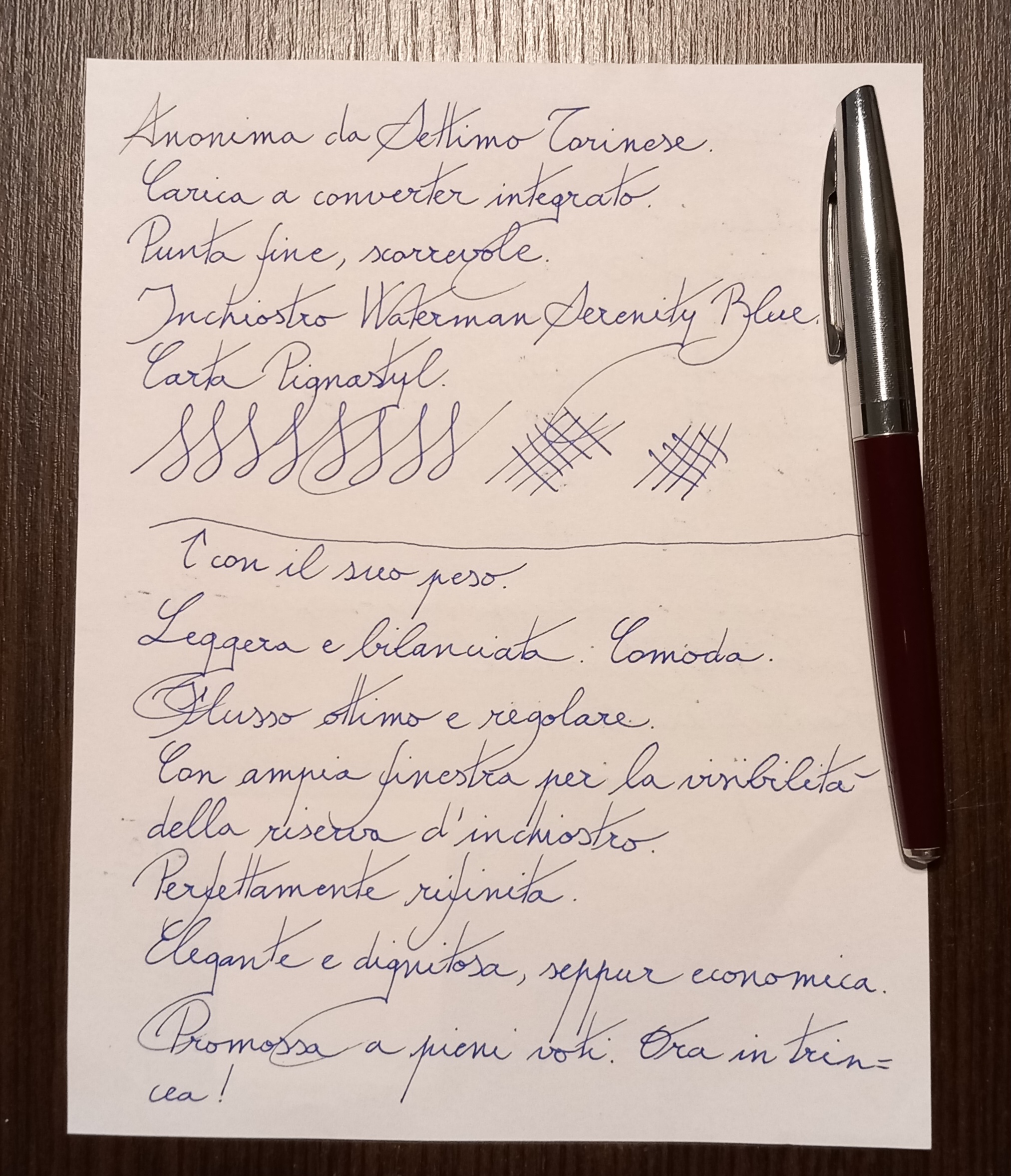 Maneggiandolo e provandolo a secco, mi sono reso conto delle sue potenzialità ed ho deciso di dargli una possibilità: una prova d’aspirazione d’acqua, con ottimi risultati, e via con una carica di Waterman Serenity Blue.