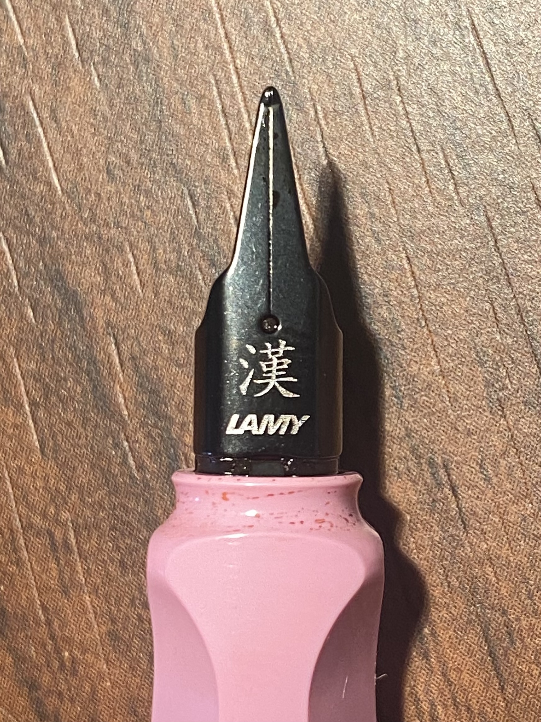 Mi ci sono imbattuto quasi per caso e preso dalla curiosità di provare qualcosa di diverso da uno stub…. Poi il kanji inciso ha un suo fascino e sulla mia lamy rosa fa molto ‘oriente cartone animato’ ed ho fatto click!