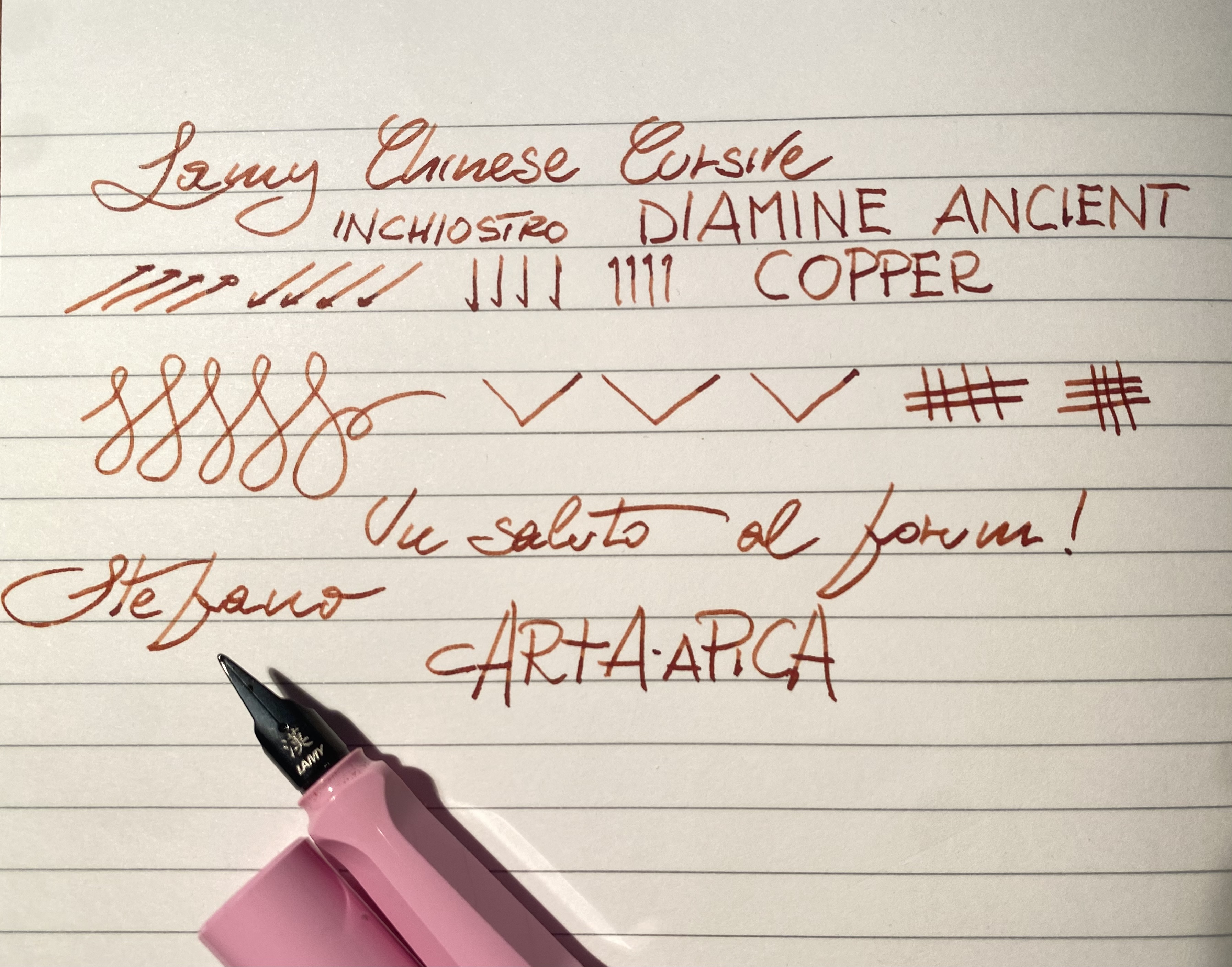 Il pennino corsivo Lamy è diverso da quello che potrebbe farci pensare il nome, infatti non è per nulla uno stub (che già a sua volta non è un italico corsivo) ne un corsivo italico: infatti si chiama ‘chinese cursive’ (hanzi nib nel mercato asiatico). Per prima cosa questo ha la pallina, non è tagliato piatto come stub ed italici corsivi.