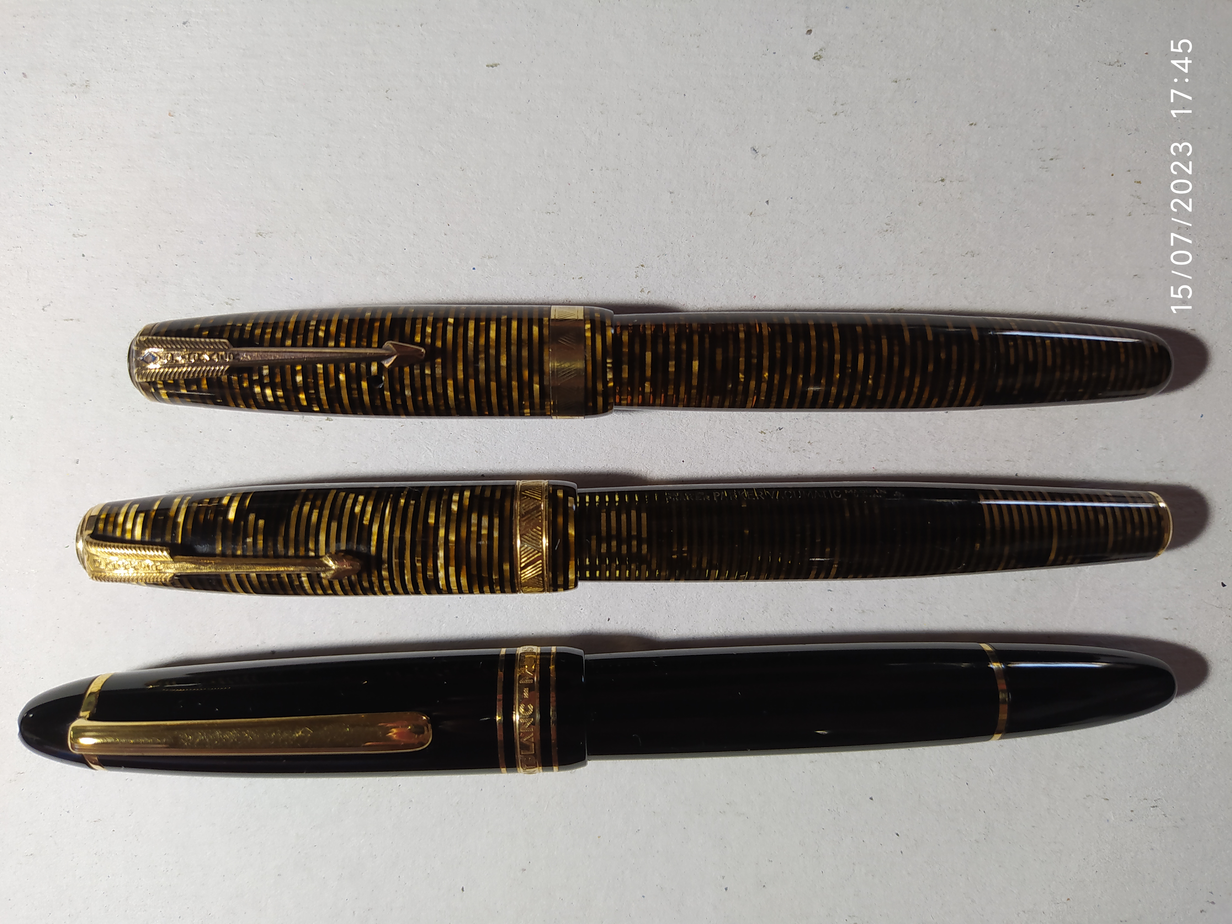 Le penne in foto sono allineate alla base. Come potrai vedere senza cappuccio, ad eccezione delle dimensioni del pennino e naturalmente del diametro. non c'è differenza tra la MB 146 e La Parker Slender Maxima .