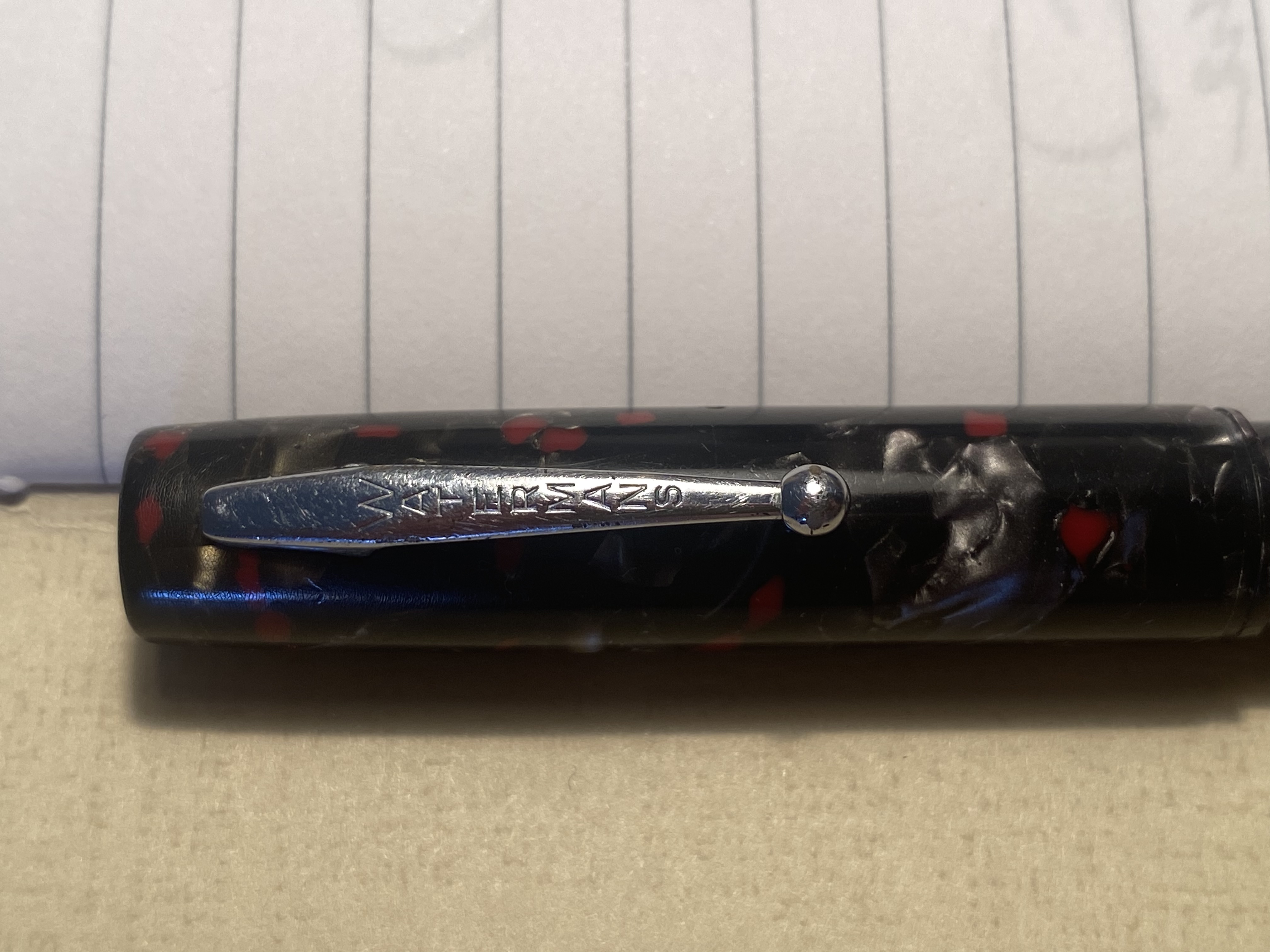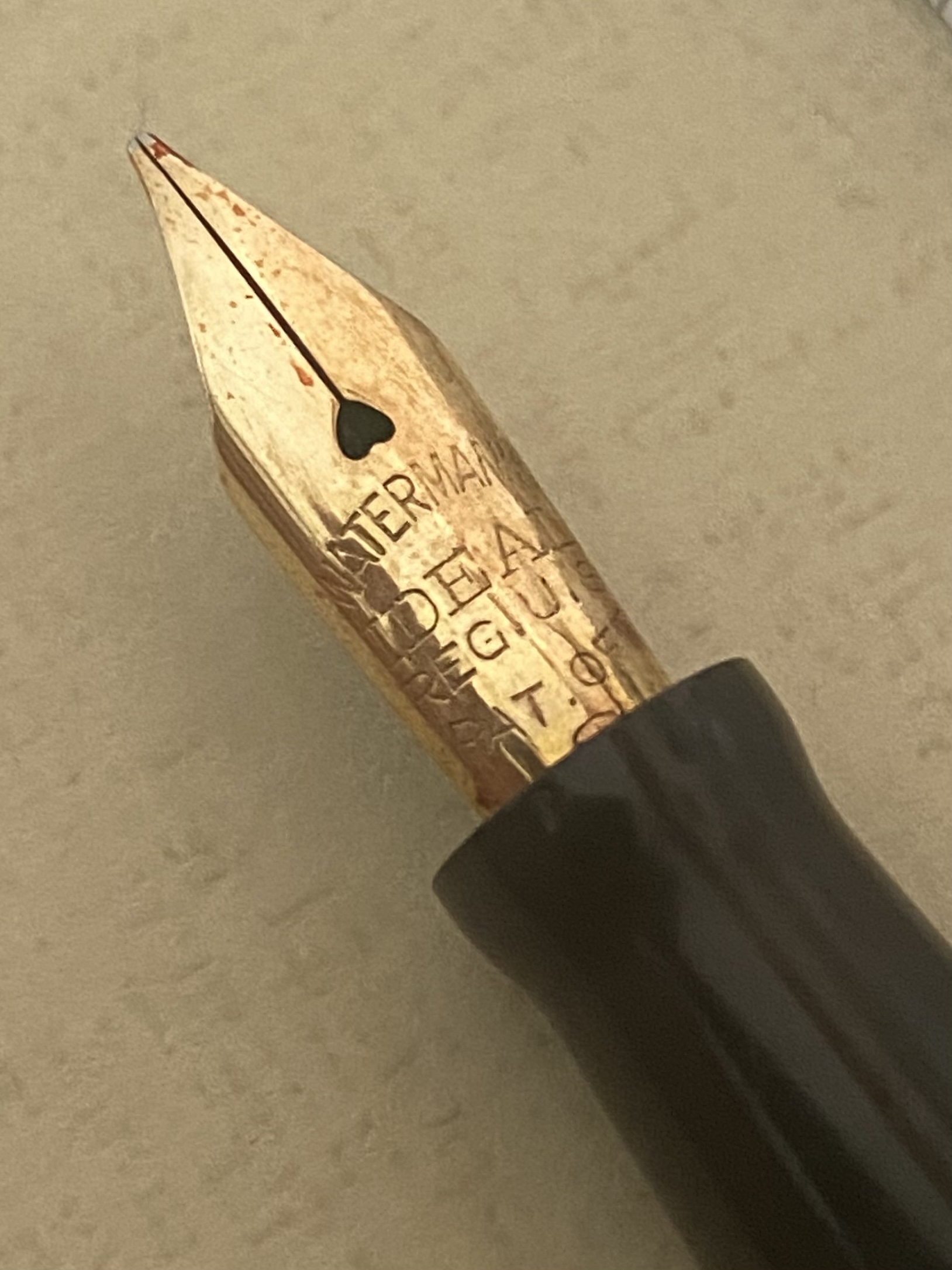Il pennino è l’ideal n. 2 in oro e il caricamento è a levetta come tutta la serie, alimentatore in ebonite, corpo e cappuccio in celluloide.