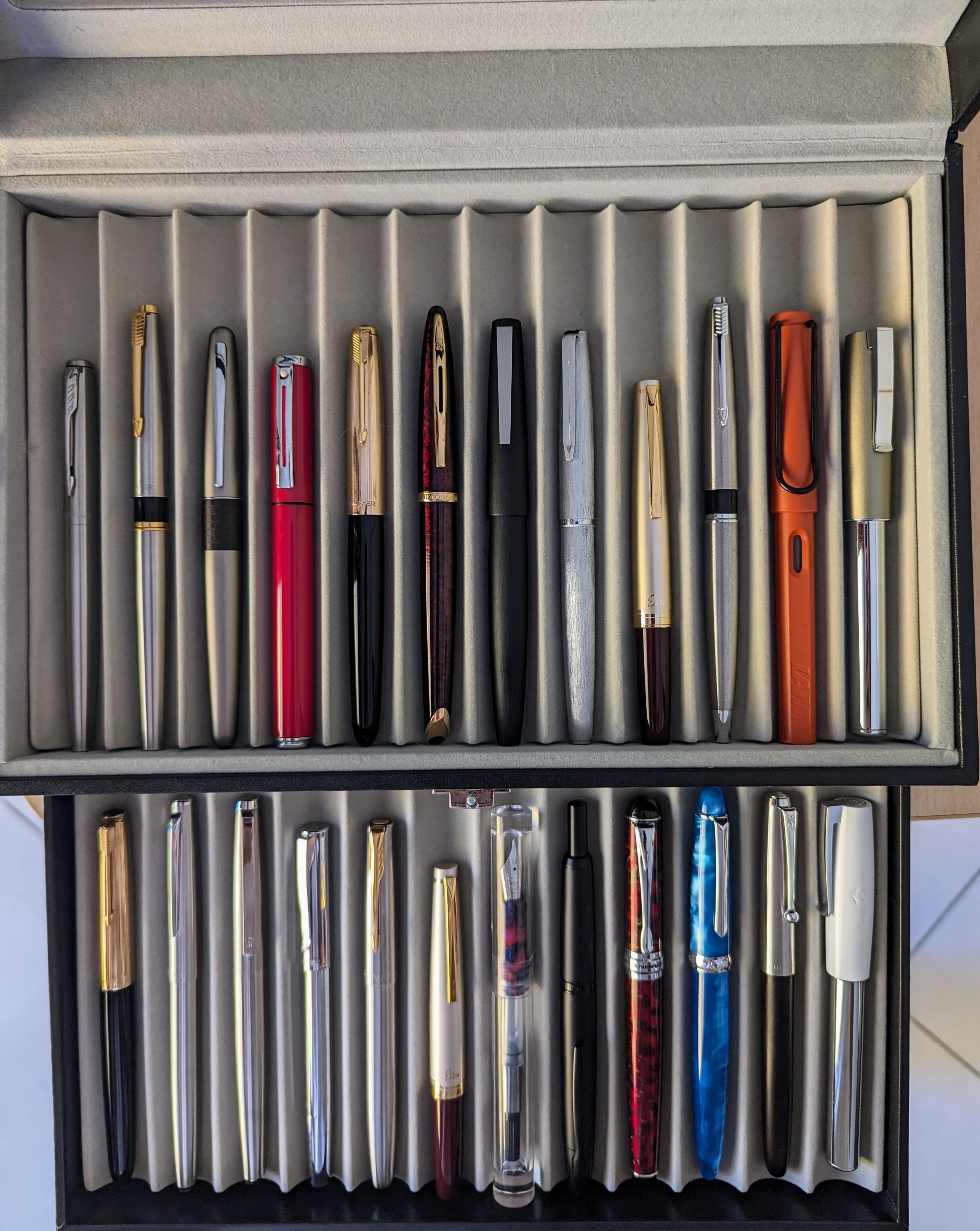 Parker Jotter; Parker 45 M; Pilot MR; Sheaffer POP; Parker 51; Waterman Caréne; Lamy 2000; Aurora 98 archivi storici; Pilot E95S M; Parker 45 EF; Lamy Safari; Faber Castell Loom F; Parker 51 F; Jinhao 992; Hongdian 517S; Waterman Allure vintage (1970?); Parker Frontier; Pilot E95S F; Moonman C1; Moonman A1; Jinhao X750; Penbbs 308; Jinhao 51a; FC Loom M.