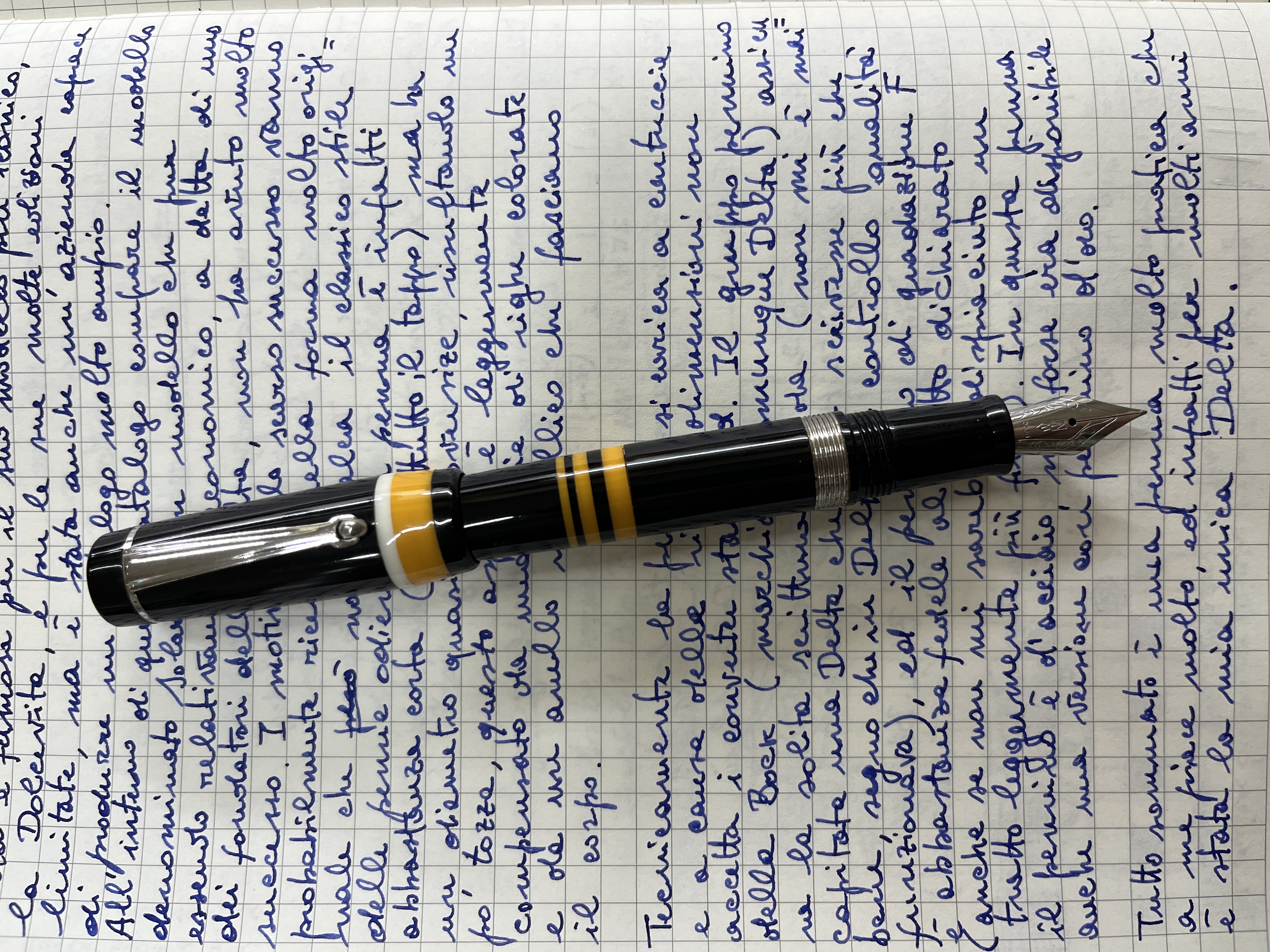 Tecnicamente la penna si carica a cartuccia e a causa delle dimensioni ridotte non accetta i converter standard. Il gruppo pennino della Bock (marchiato comunque Delta) assicura la solita scrittura fluida (non mi è mai capitata una Delta che scrivesse male). Il pennino di gradazione F è abbastanza fedele al tratto dichiarato (anche se a me non sarebbe dispiaciuto un tratto leggermente più fine).
