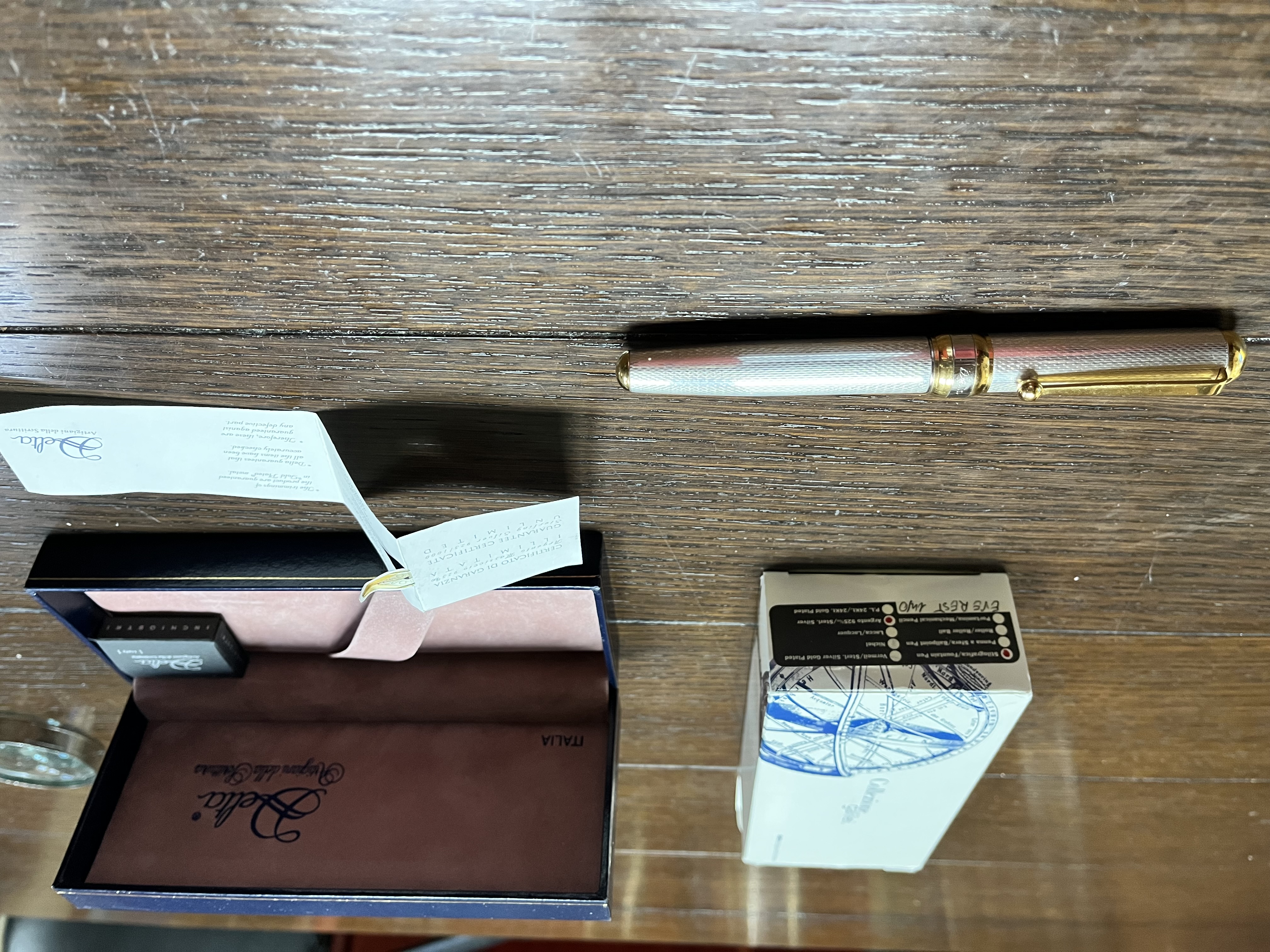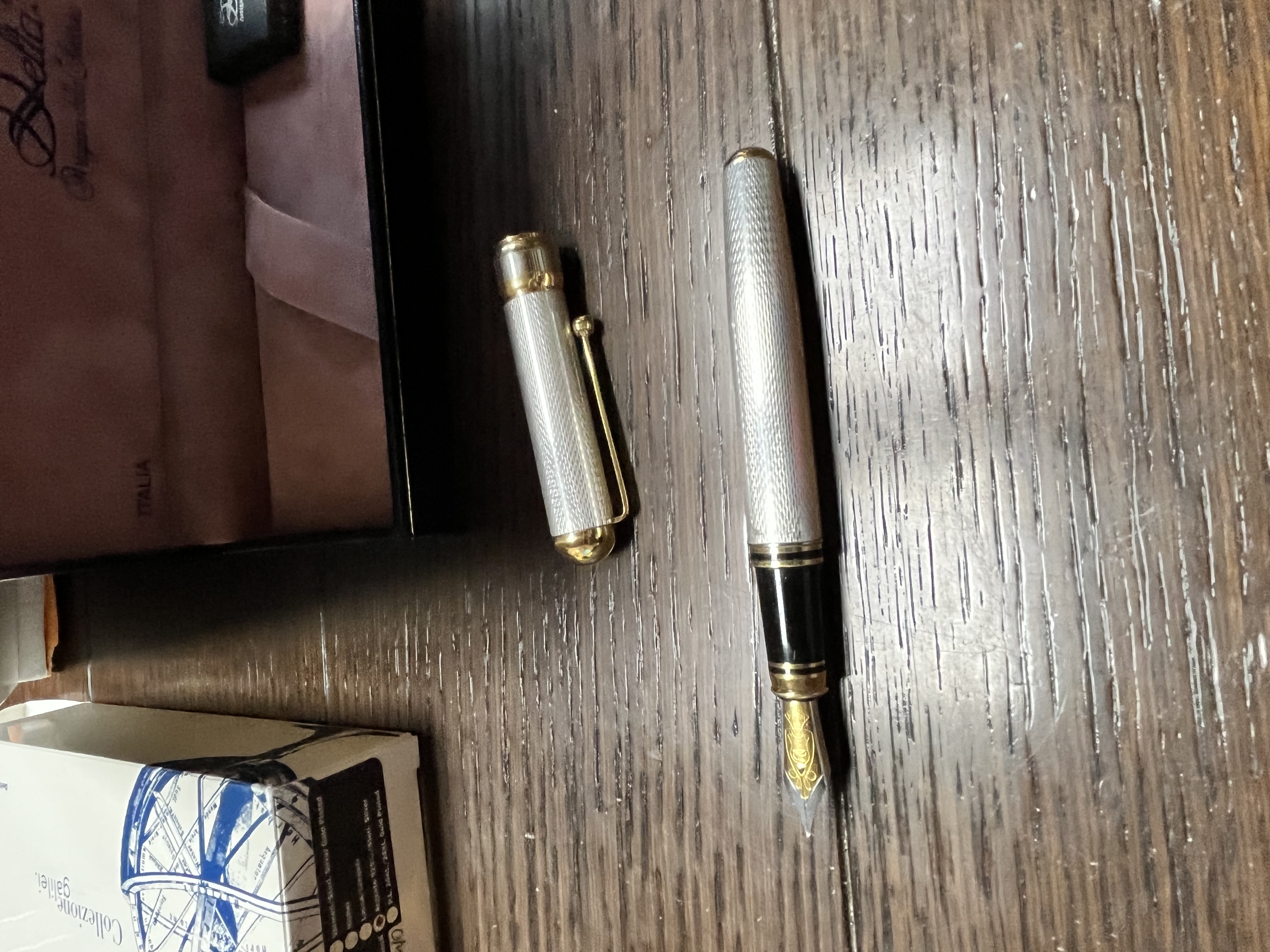 Buonasera, mi hanno appena regalato questa vecchia Delta in argento, mai usata (ancora per poco). Sono rimasto sorpreso dal fatto che pur essendo tutta in argento massicciò, tranne i particolari placcati in oro, il pennino sembrerebbe essere di acciaio. Qualcuno conosce la penna? Può darmi informazioni? So’ di sicuro solo che si tratta di una Everest 14.