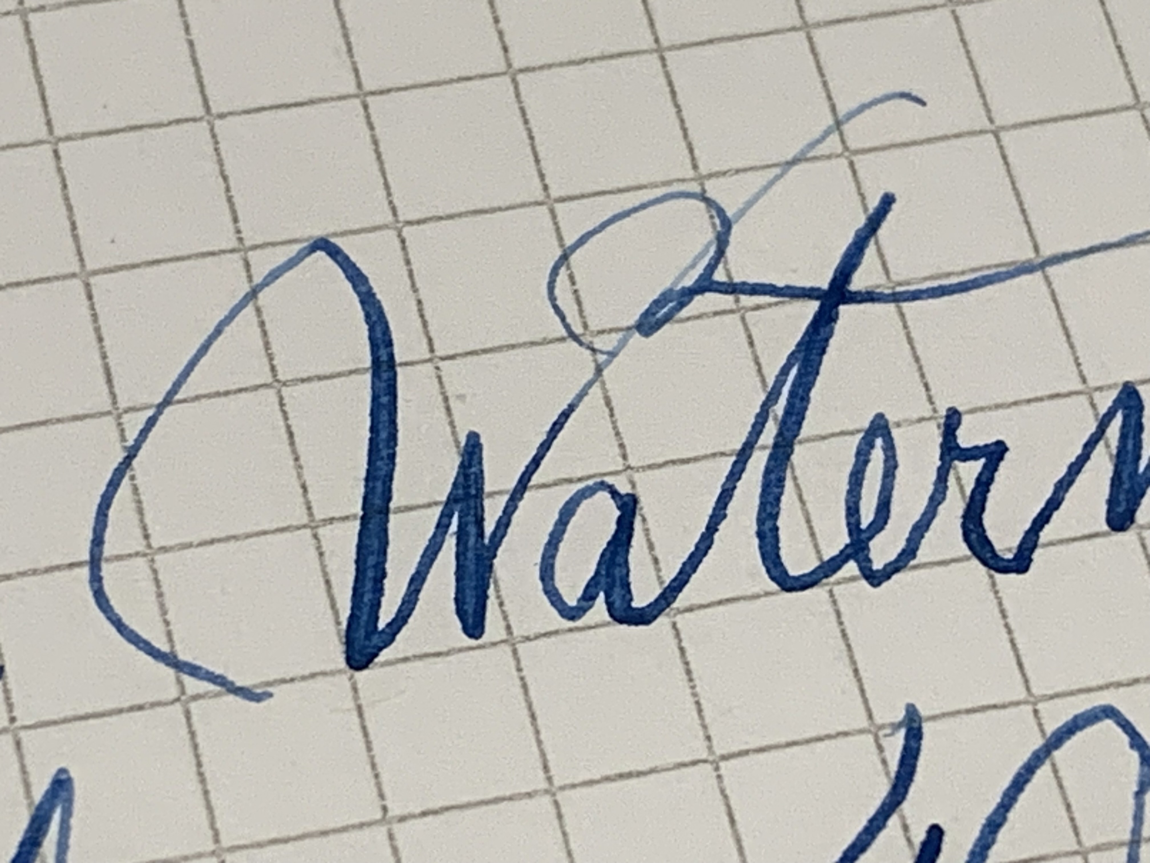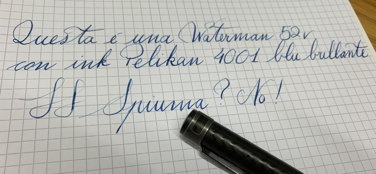 Con una Waterman 52v flex, la carta è una normalissima Pigna Style da bloc notes, niente di eccezionale, l'inchiostro è il Pelikan 4001 blu brillante (fuori produzione), ma confermo che il BlueBlack (al netto del colore molto più grigio) si comporta esattamente uguale.