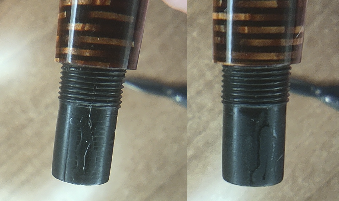 Considerata ormai "agonizzante" questa penna viewtopic.php?p=384726#p384726 , ho deciso di sperimentare quanto segue , al fine di rendere più solida e robusta la riparazione al gruppo porta-stantuffo che presenta due rotture con crepe che corrono lungo le riseghe del cilindro all'interno del quale lo stantuffo si muove .