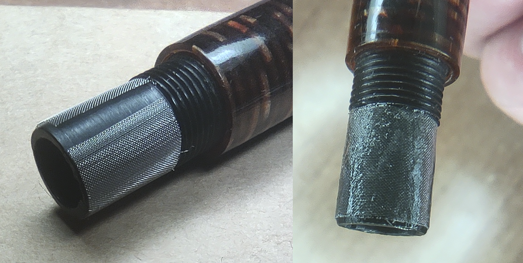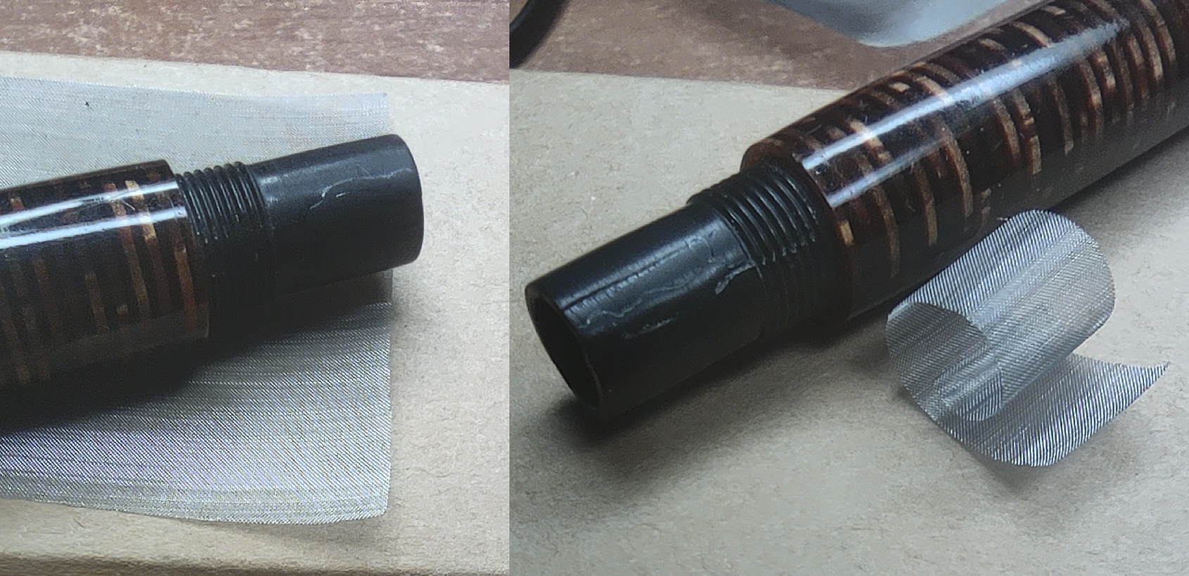 Ho così deciso di provare a creare una sorta di camicia di forza da incollare sul corpo esterno del cilindro porta stantuffo, utilizzando un "foglio" di fili sottilissimi di acciaio inox intrecciati tra loro (mesh) ; i fili di acciaio sono così sottili che lo spessore del foglio è di qualche decina di micro (0,03-0,04 mm) e generano una trama di circa 200 forellini per pollice quadro.