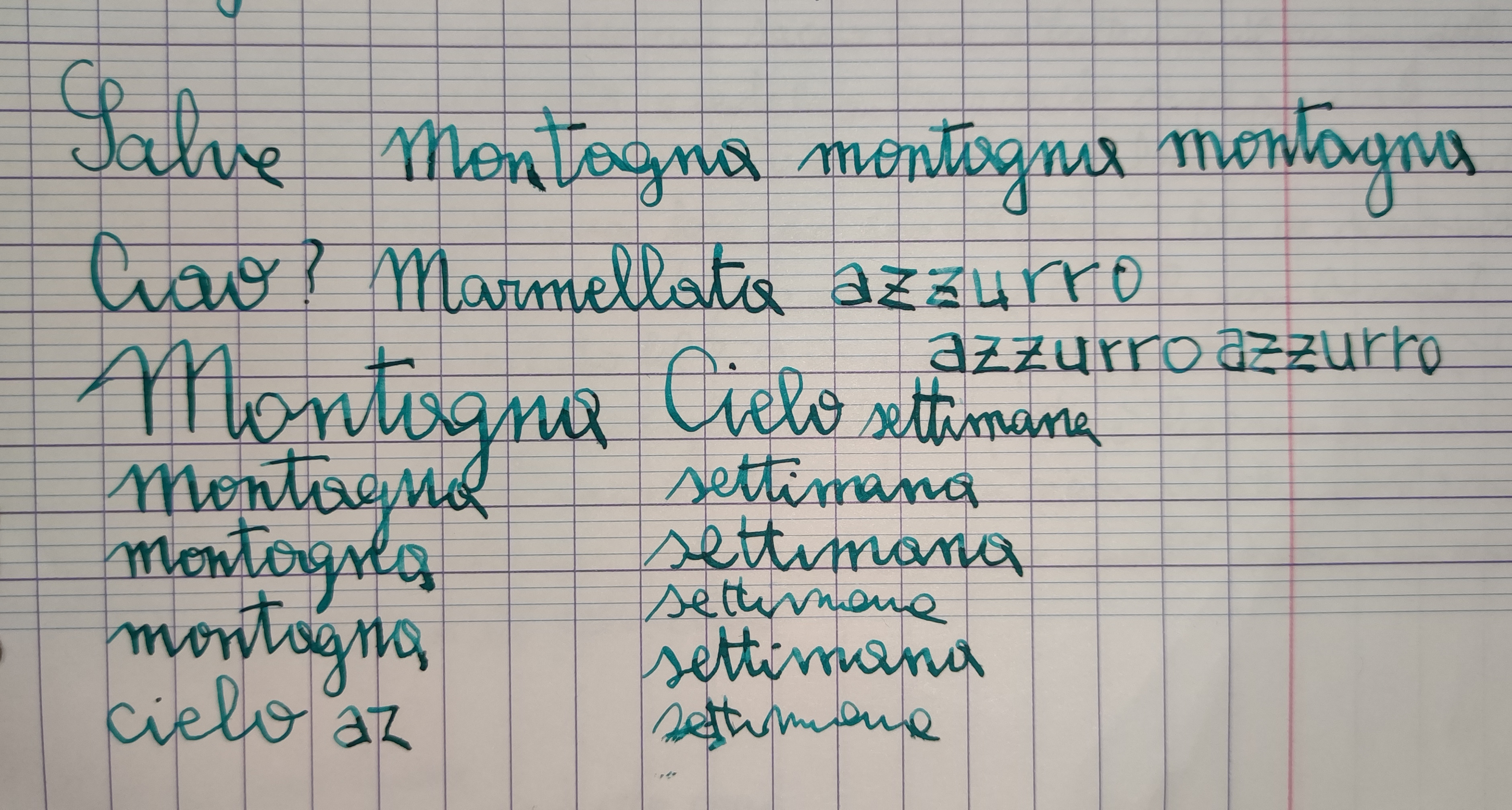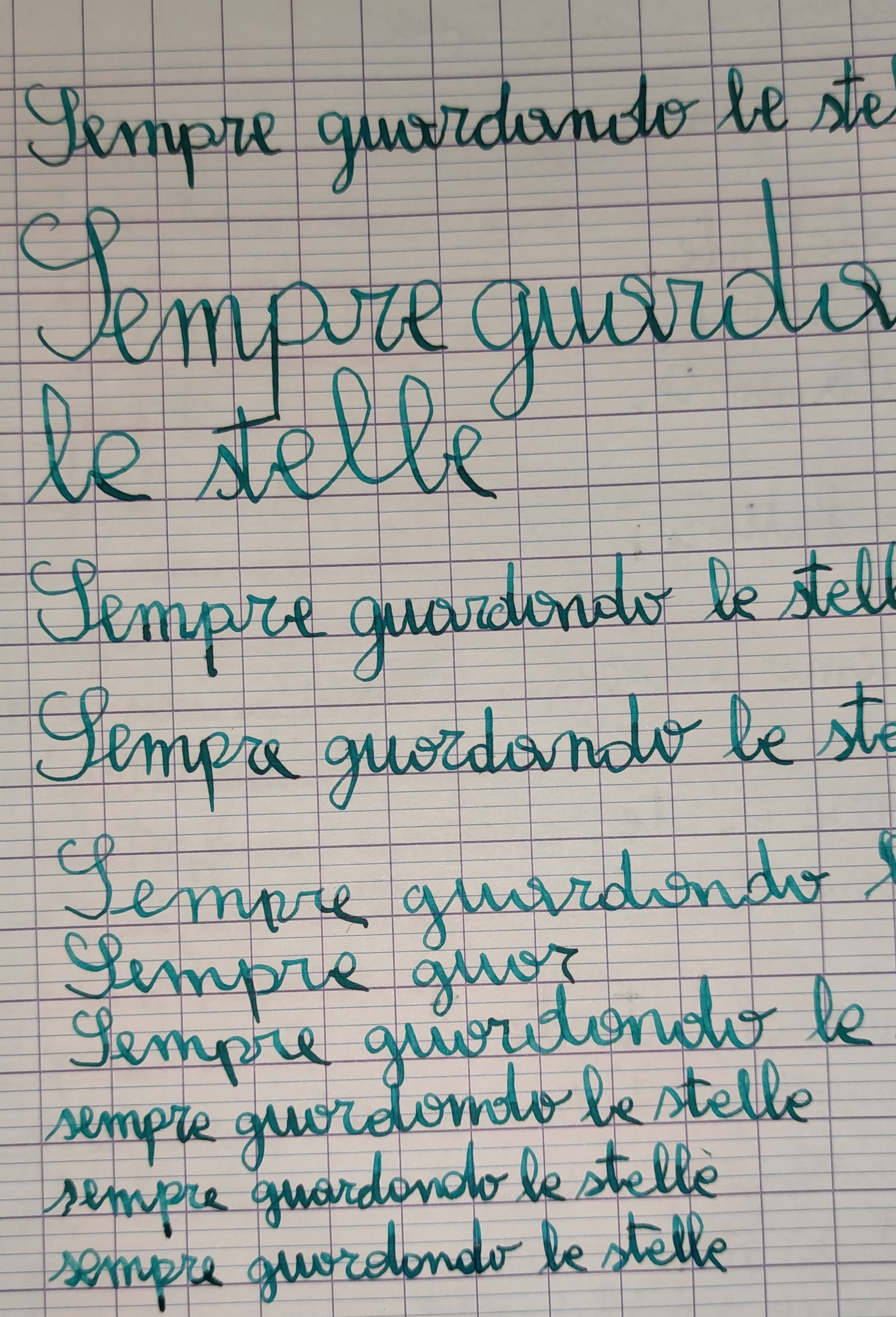 Quindi ti direi che , se vuoi vedere le variazioni di tratto nella scrittura, devi scrivere più grande e più lentamente, così da dare al pennino il tempo di ritornare a stringere i rebbi dopo che hai mollato la pressione.