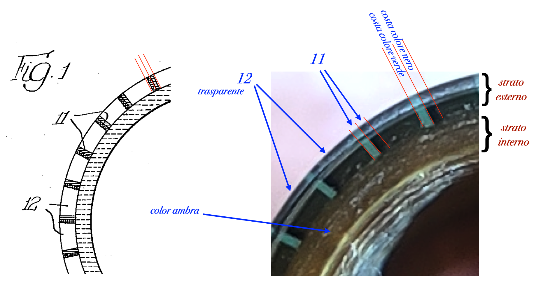 Le strisce 11 sono a loro volta costituite da due coste di celluloide di differente colore affiancate tra loro o, come variante, di un unico colore (l'ultima foto allegata a questa discussione ne mostra un esempio), mentre le strisce 12 sono in celluloide trasparente.