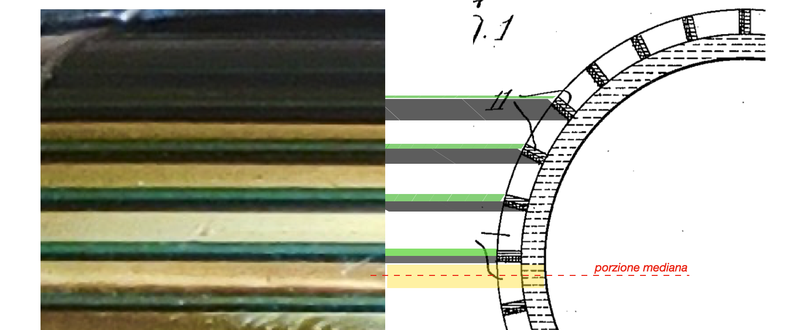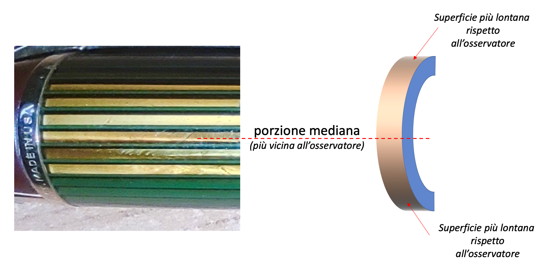 “…nella porzione mediana del tubo, che è la porzione di superficie ricurva più vicina all’osservatore, il colore dello strato interno sarà predominante, mentre nelle porzioni delle superfici curvate più lontane dall’osservatore , il colore delle strisce diventano via via più cospicue fino a divenire predominanti rispetto al colore dello stato interno.