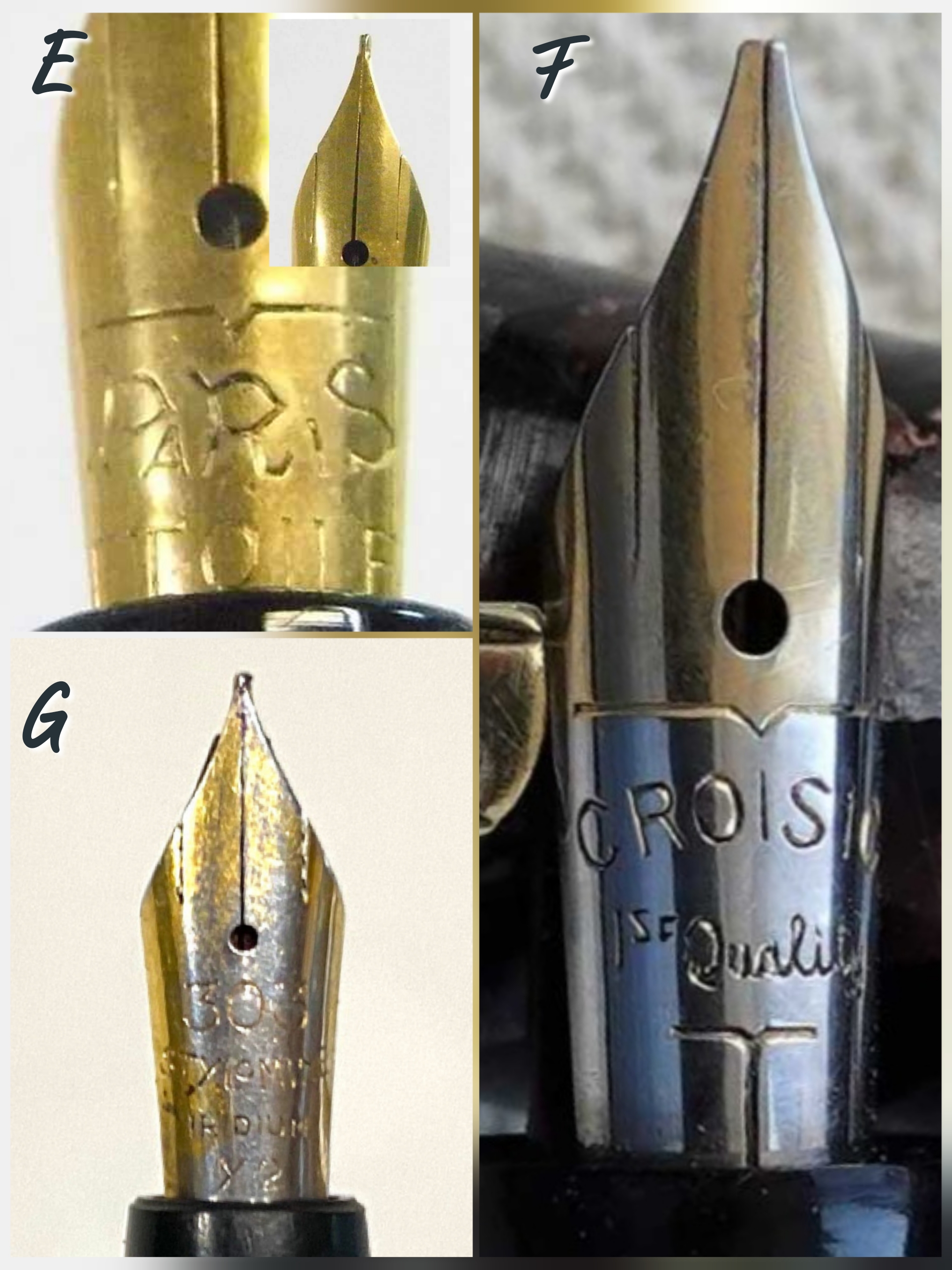 3) è di difficile attribuzione: lo si trova su penne di marca "Paris" o "Croisic", di cui non si sa nulla, con stampigliato identico marchio, oppure su penne varie con marchio "R", "sRs", "S", la lettera "R" identica a quella presente sul marchio "Paris"; la grafica dei pennini è comunque estremamente simile e fa pensare ad un'unica produzione;