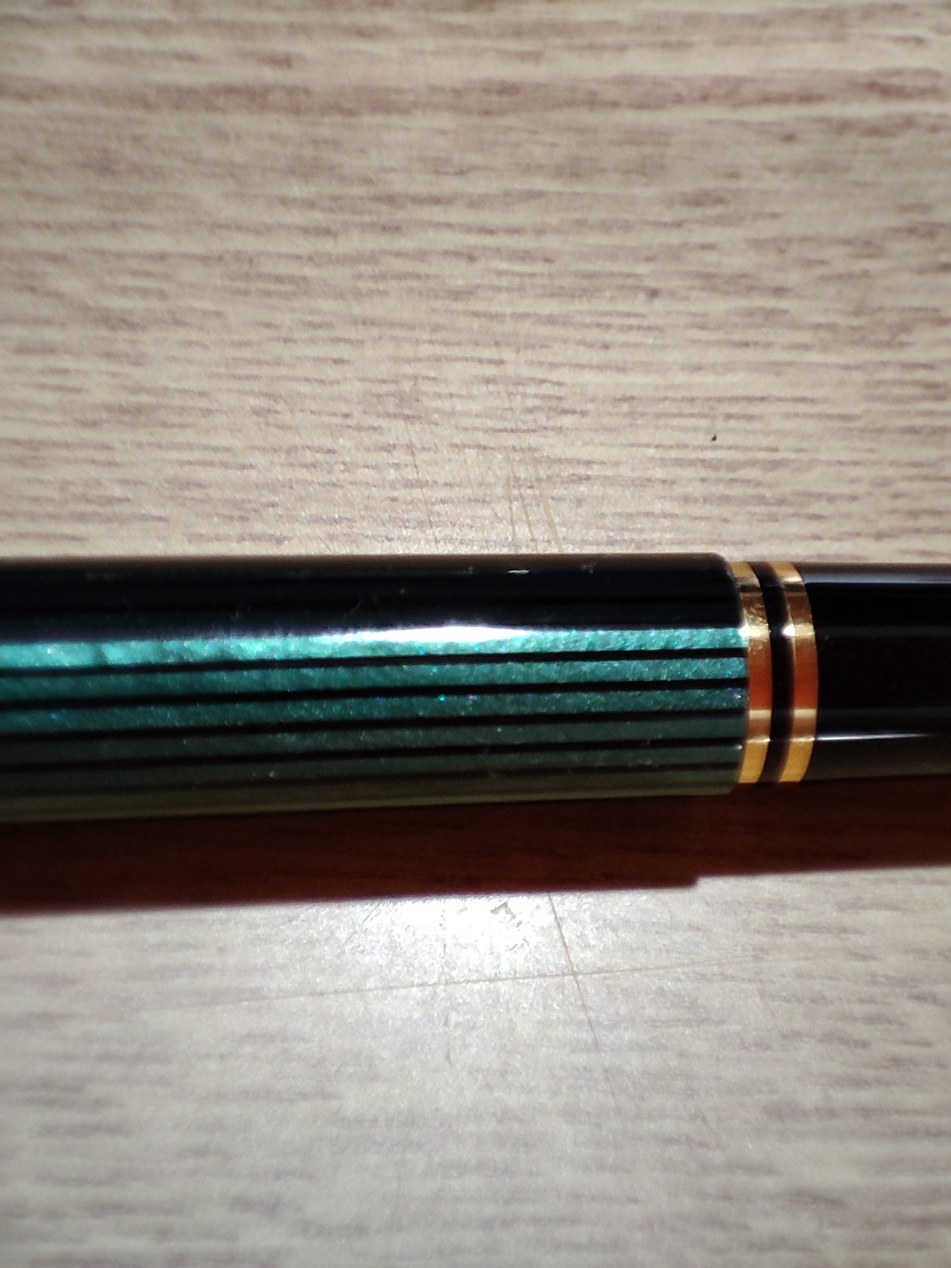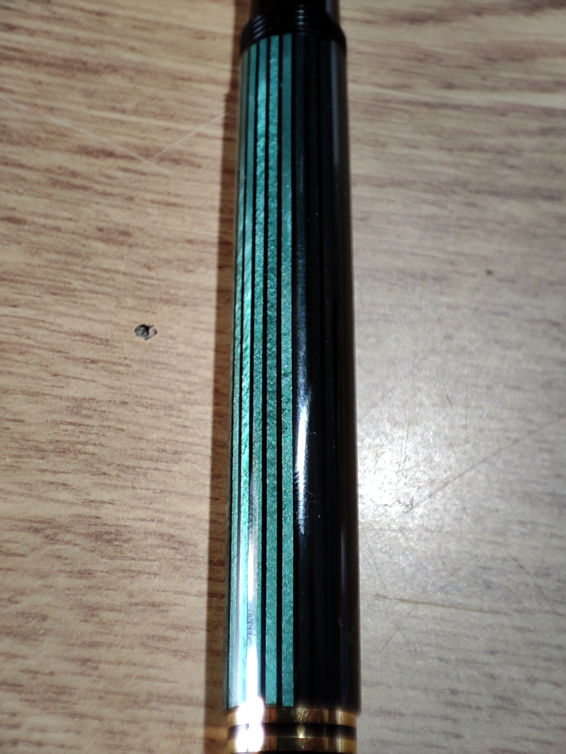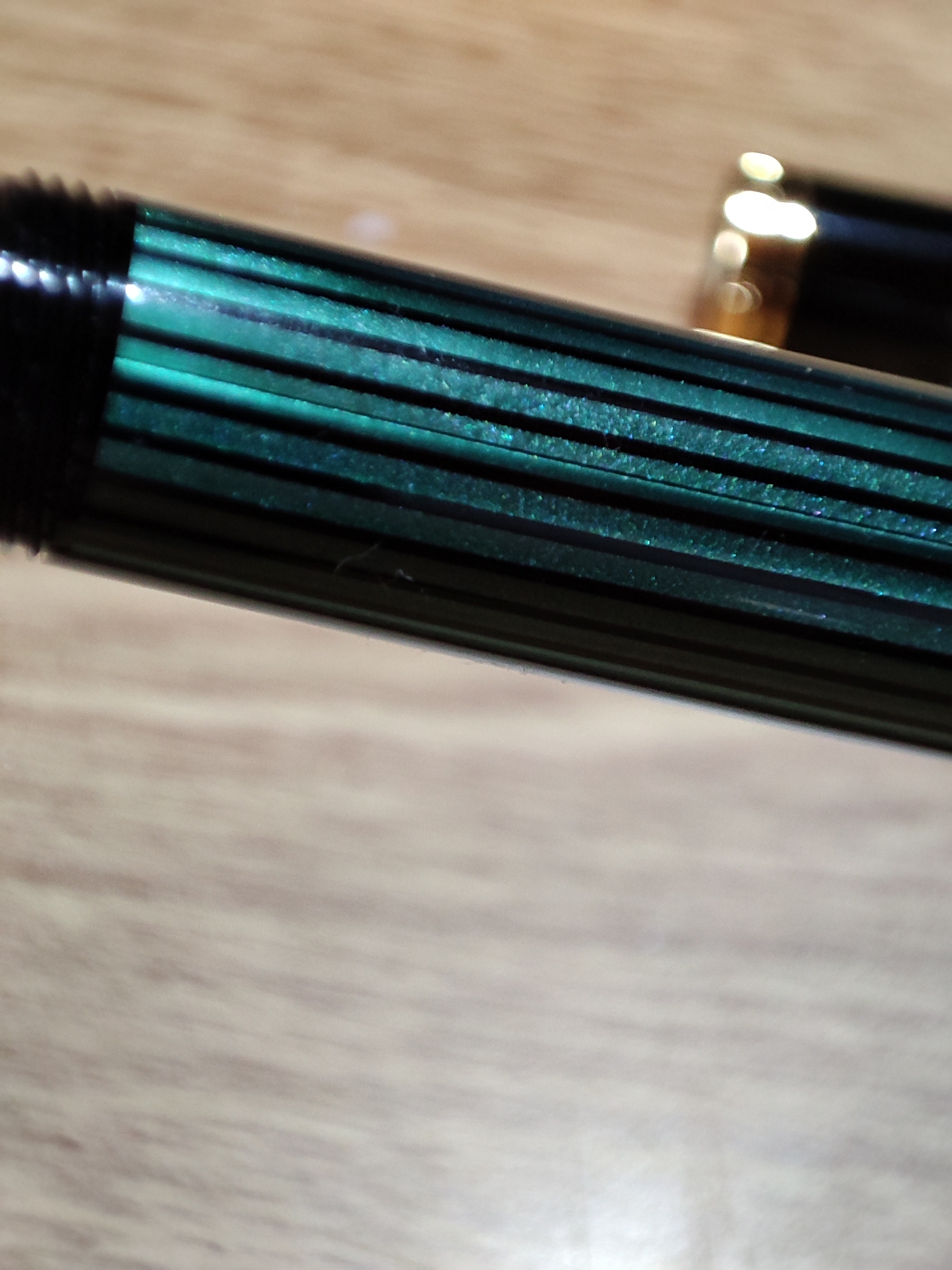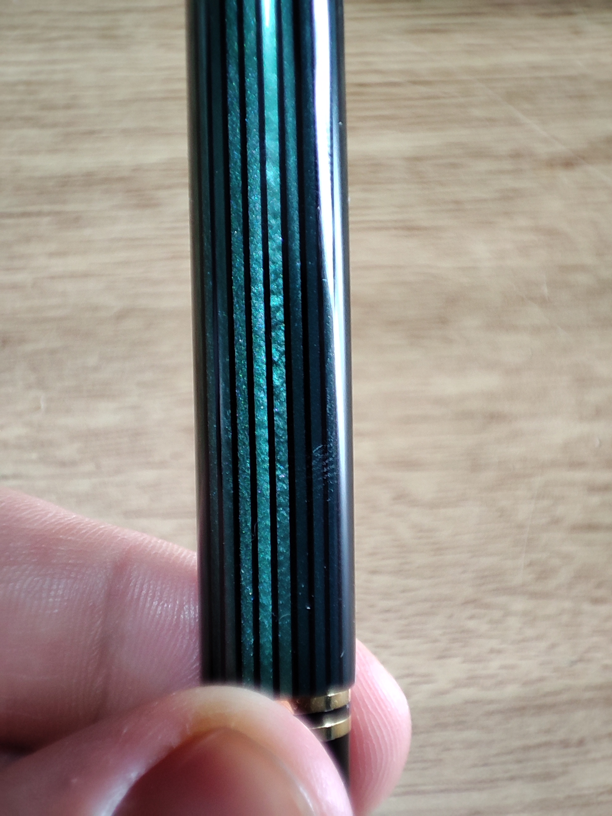 aggiungo che il fenomeno che noti, a seconda di come giri la penna, con le strisce che diventano più o meno scure, dipende dalla polarizzazione della luce. Alcuni materiali causano questo effetto, che è presente anche su altre penne Pelikan, dipende dall'angolo di incidenza della luce sul materiale, non è in sè un difetto.