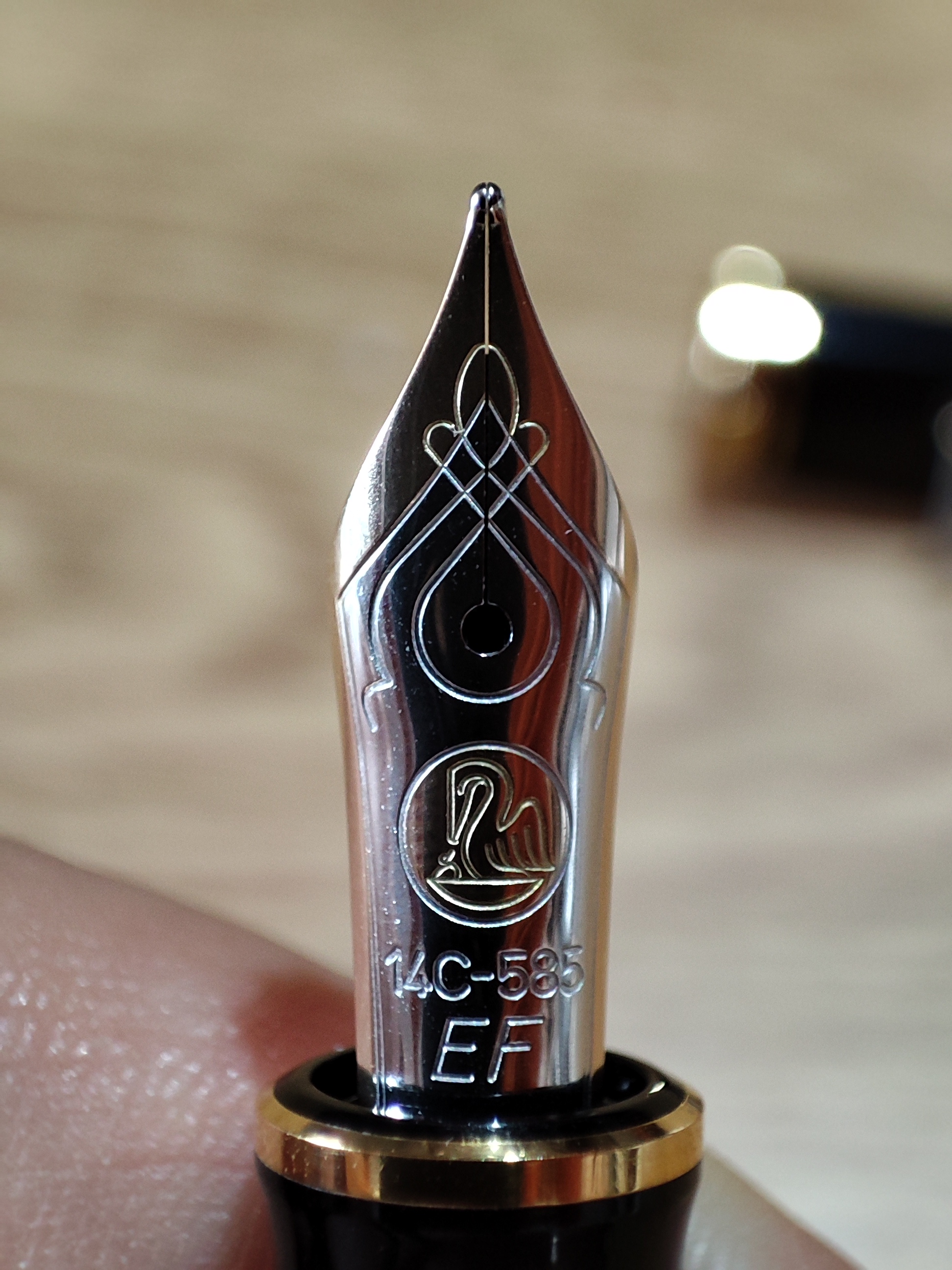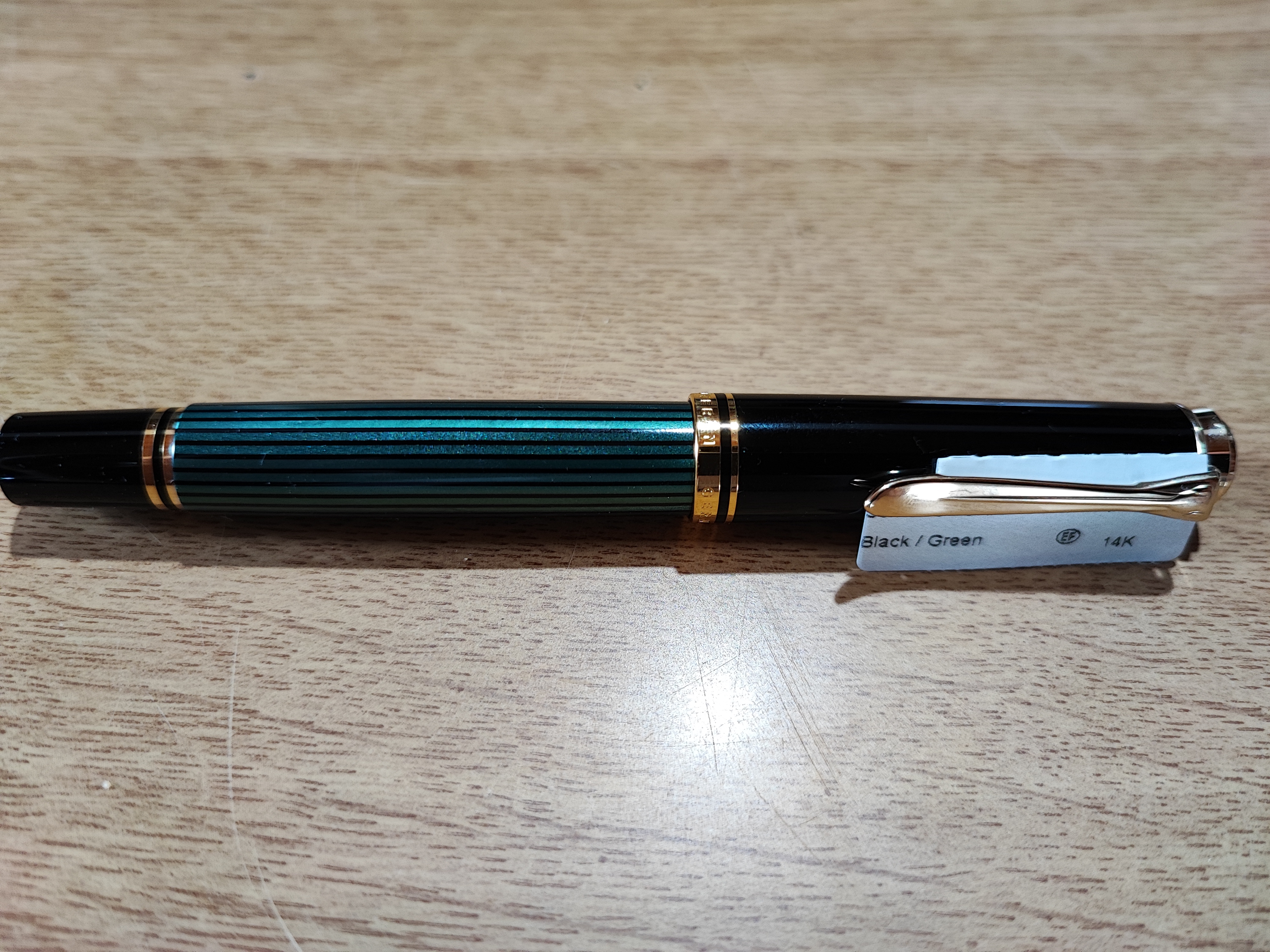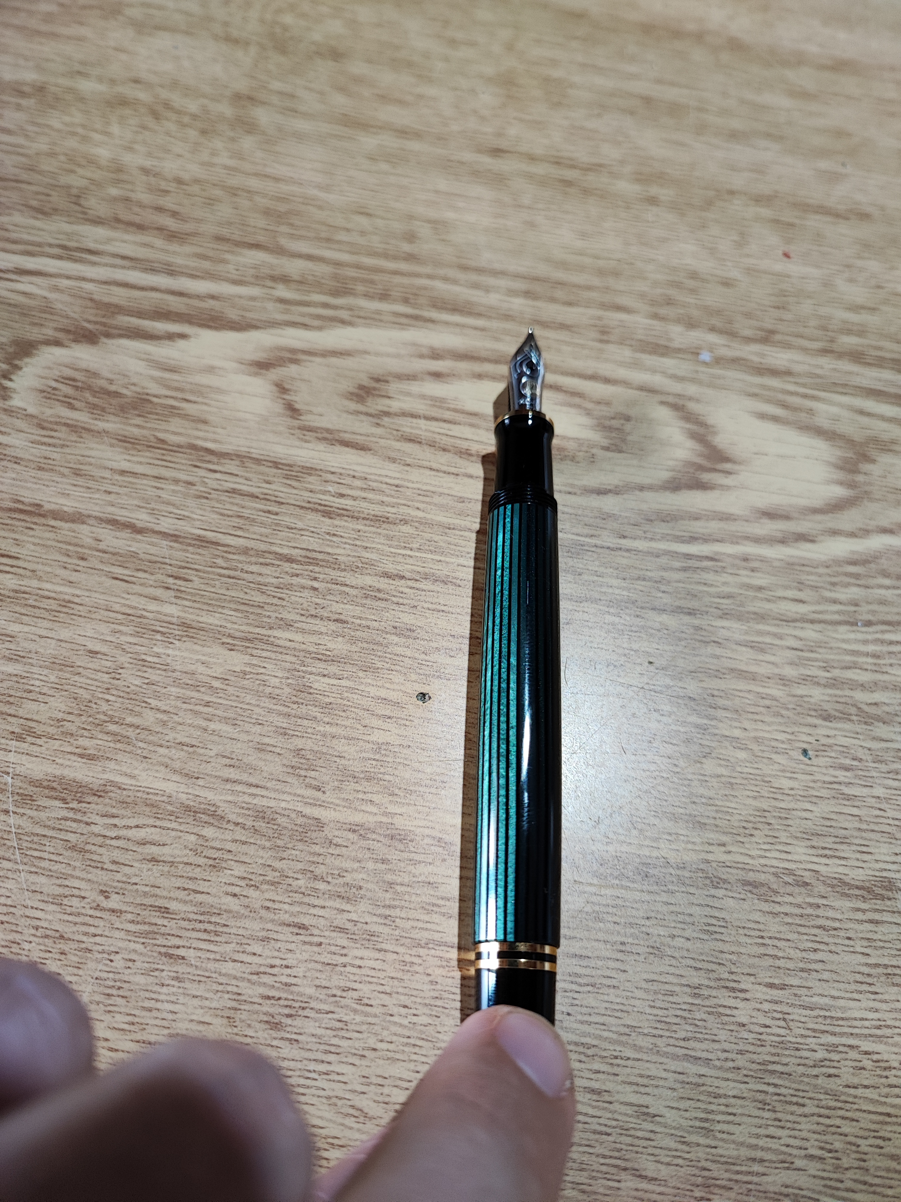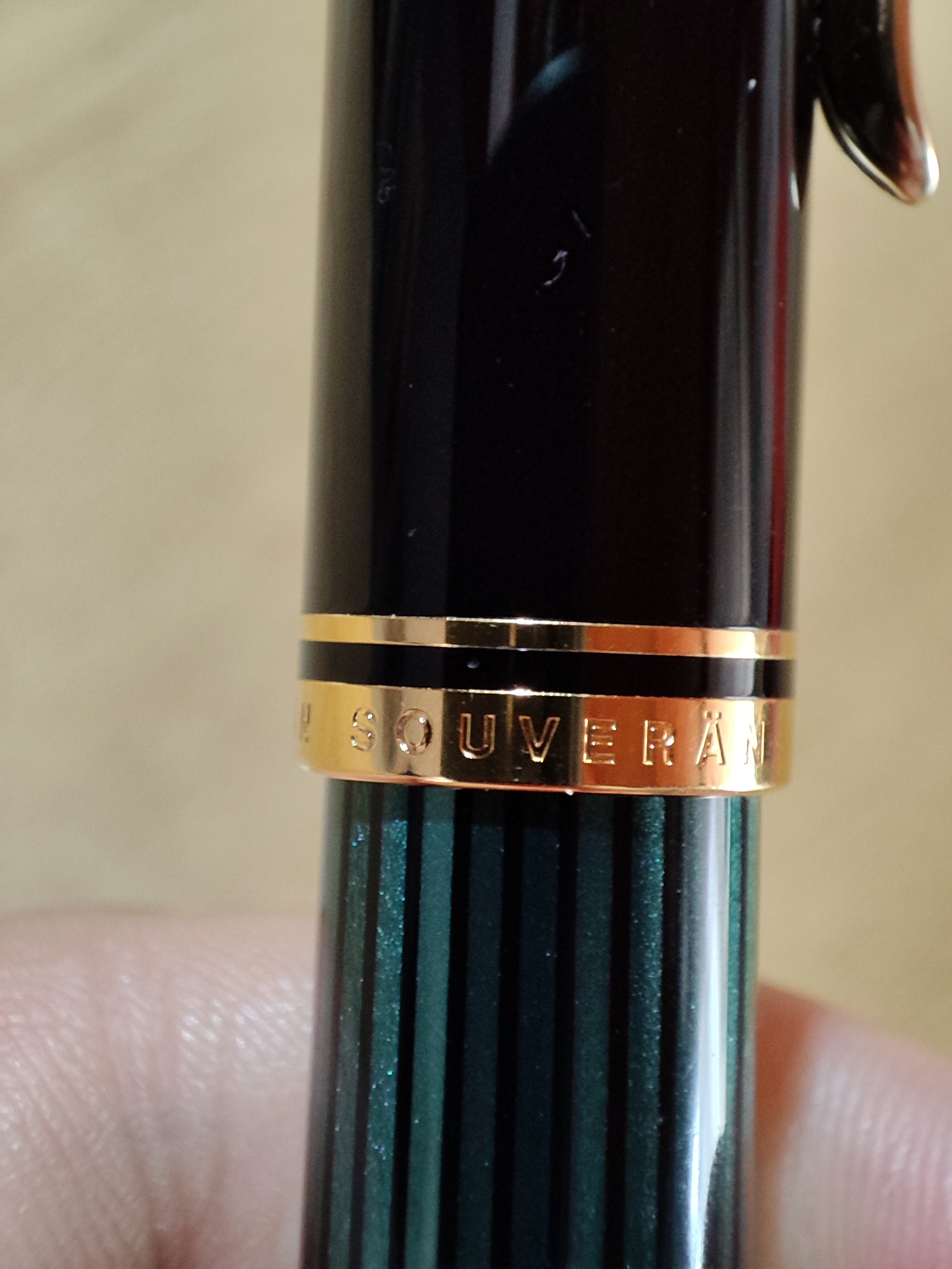 aggiungo che il fenomeno che noti, a seconda di come giri la penna, con le strisce che diventano più o meno scure, dipende dalla polarizzazione della luce. Alcuni materiali causano questo effetto, che è presente anche su altre penne Pelikan, dipende dall'angolo di incidenza della luce sul materiale, non è in sè un difetto.