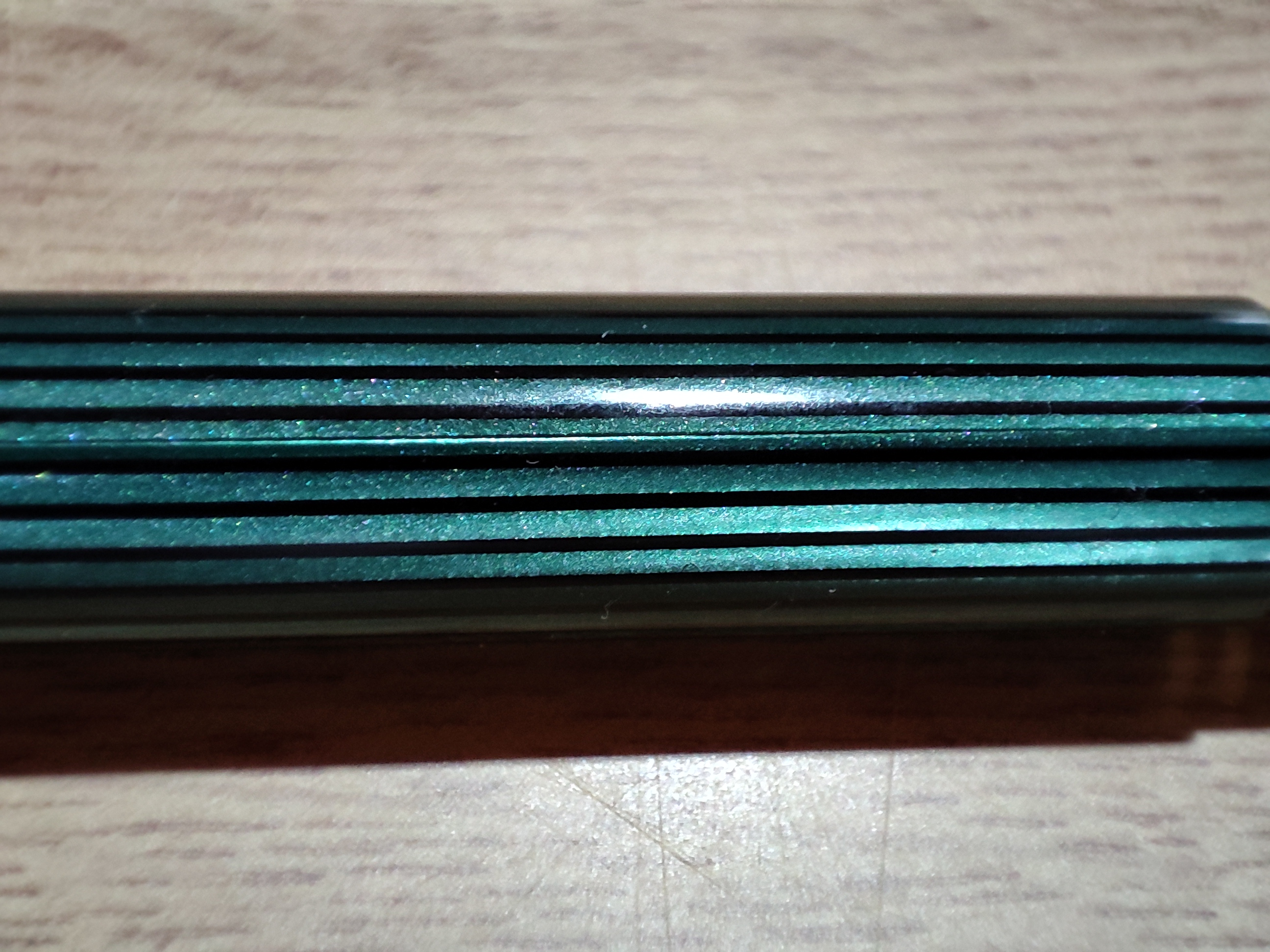 2)Sempre sulla circonferenza del fusto è presente una banda verticale, lungo tutta la lunghezza del fusto stesso e larga poco meno di un centimetro, composta da 8/9 strie che, a seconda di come giro la penna tra le mani, si scuriscono fino a sembrare quasi nero opaco.