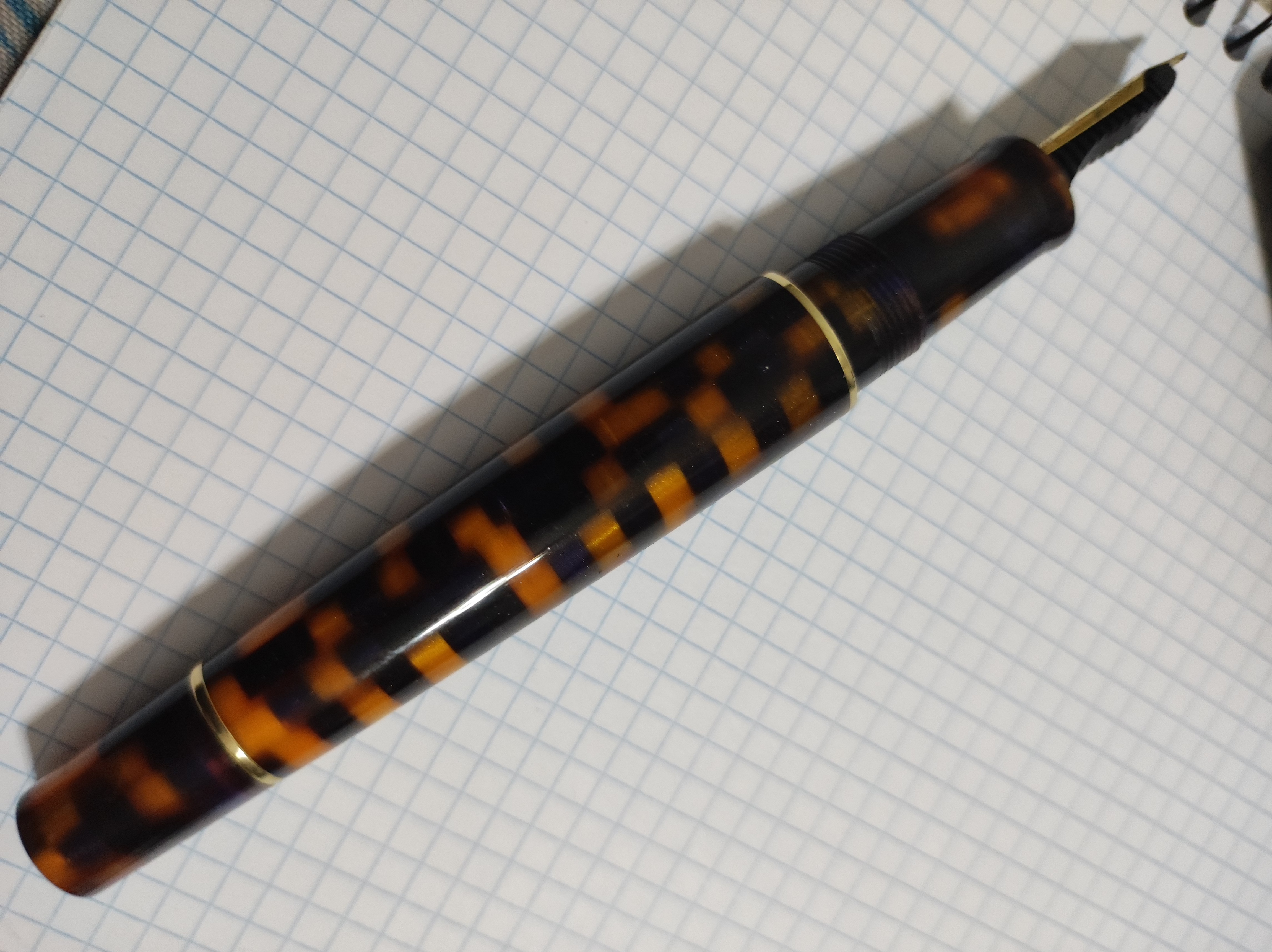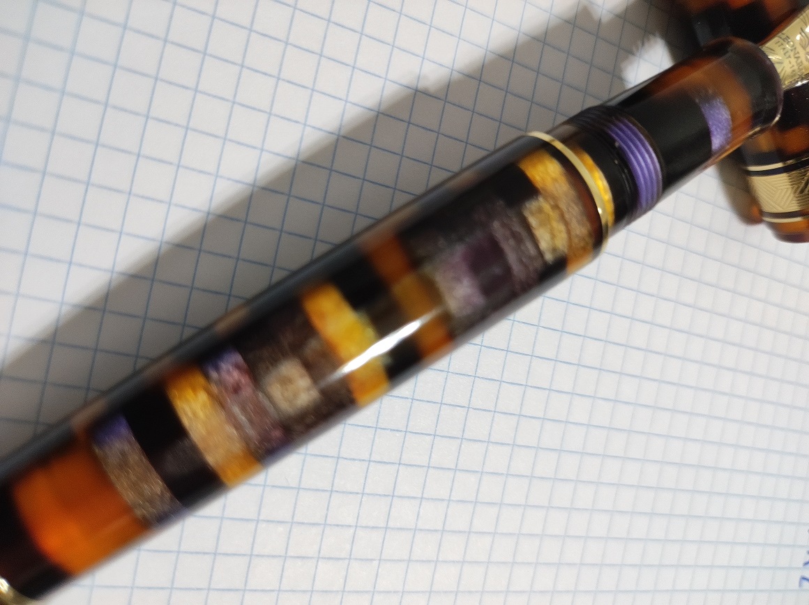 bella penna, non riesco a non continuare ad ammirare la profondità di queste resine. Qualche produttore (di resine) ad un certo punto è riuscito nell'impresa di creare una resina che come effetto di luci risultasse piuttosto simile alla celluoide. La celluloide in genere ti sorprende per la profondità dei colori che sembrano affondare nell'interno della penna (perché evidentemente è la luce che riesce a filtrare dentro e a creare i riflessi). inizialmente sono uscite le versioni striate di queste resine, ricordo tra le prime viste che mi avevano colpito, le resine delle Stipula Duetto.