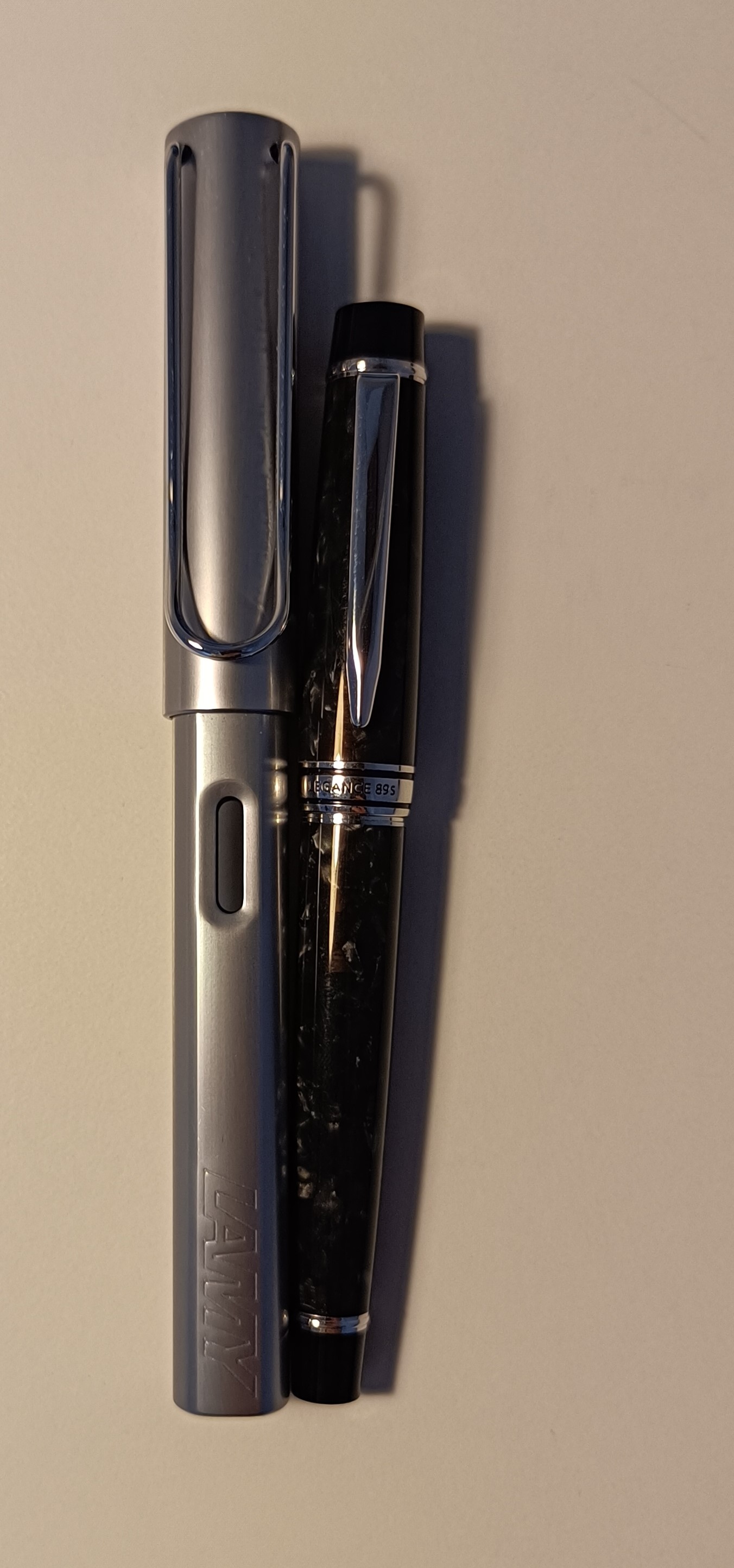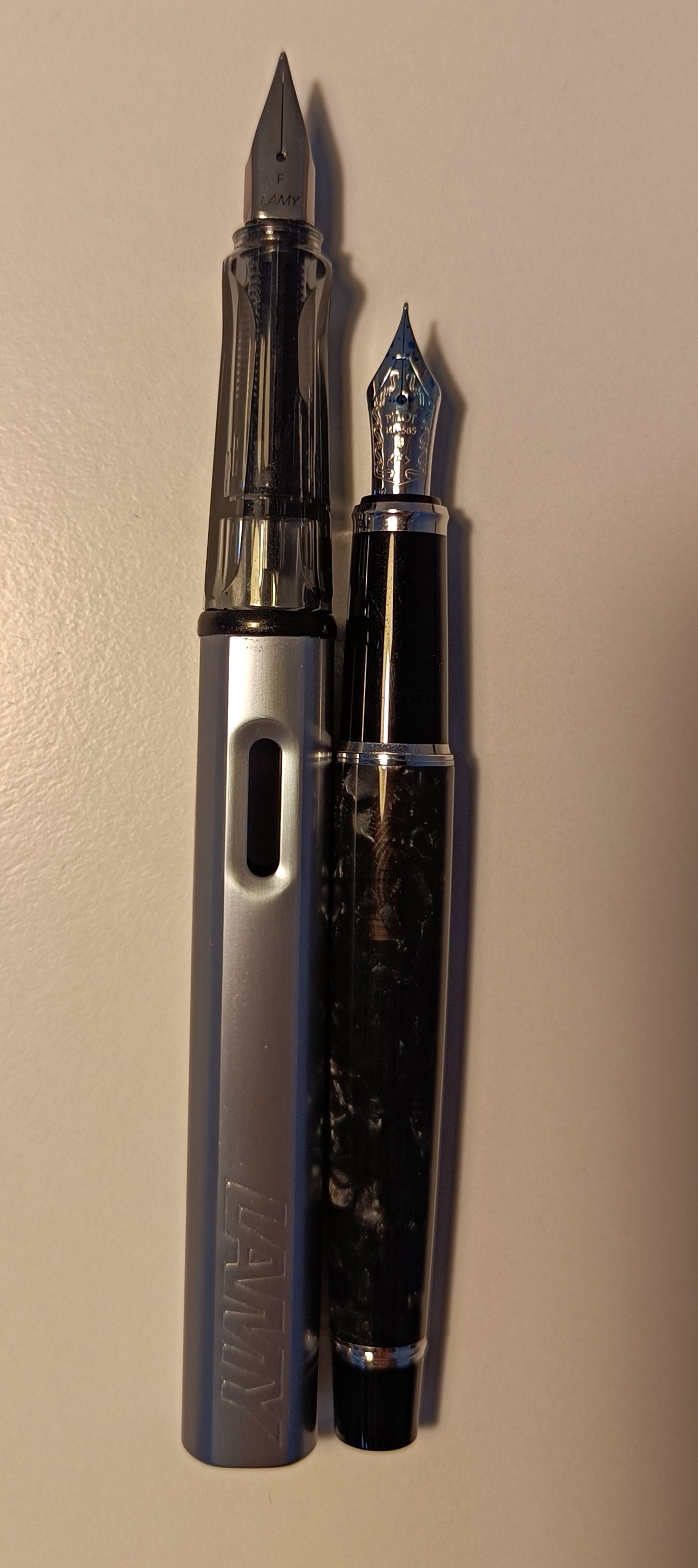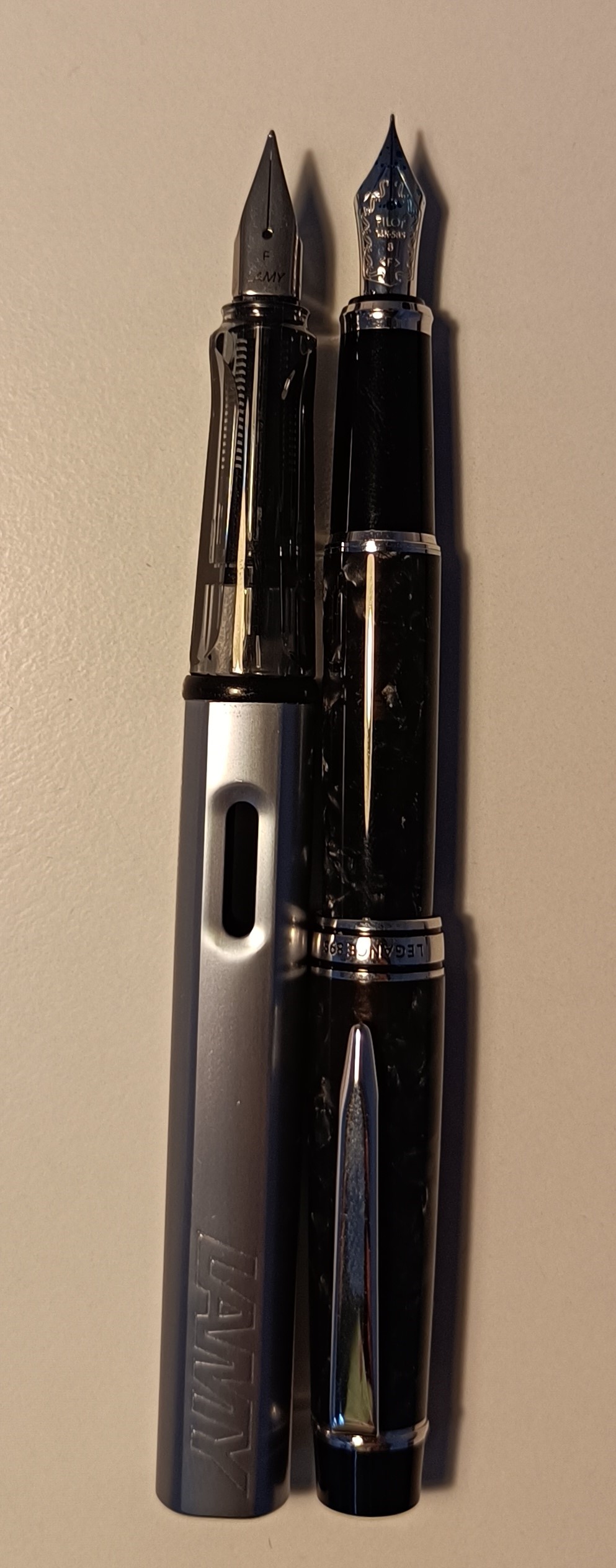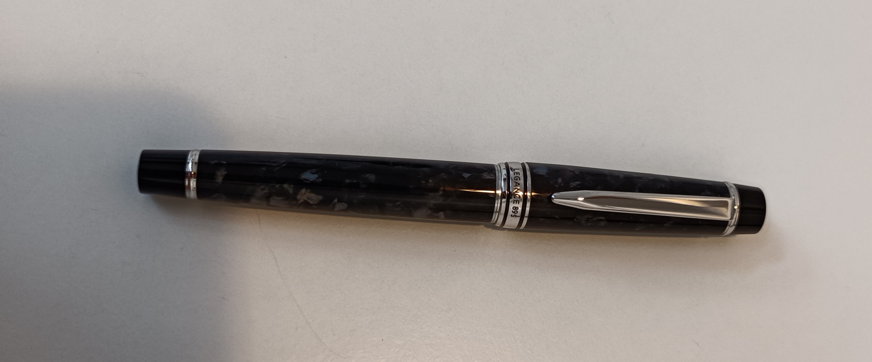 Si tratta di un modello di cui non ho trovato molte informazioni in giro, e non sembra essere circolato molto in Europa, tutto quello che sono riuscito a capire è che il nome "Legance 89s" richiami l'ottantanovesimo anniversario di Pilot e che la "s" stia per "small" ("piccolo" in inglese). Si tratta di una penna di piccole dimensioni, con cappuccio a pressione e pennino in oro 14 carati. La cosa che più mi ha colpito e convinto ad acquistarla è stata la resina con cui è costruita; è un bel nero-grigio marmorizzato, molto sobrio ed elegante, che dà dei bei riflessi alla luce. Trovo anche eleganti le parti finali di corpo e cappuccio che terminano con due "tappi" in semplice resina nera. Si nota in generale una grande attenzione ai dettagli: la vera centrale, gli anelli, il fermaglio sono fissati e lucidati alla perfezione, e la penna sembra godere di grande robustezza. Questa impressione mi è ispirata soprattutto dall'innesto della sezione e dalla filettatura del corpo, entrambi in metallo. La non trascurabile quantità di metallo fa sì che la Legance non sia una penna leggerissima a dispetto delle dimensioni: la trovo leggera al punto giusto, e se si vuole del peso in più si può calzare il cappuccio, cosa che tra l'altro la rende adatta anche a mani più grandi delle mie manine. Vi lascio delle immagini comparative con una Lamy Al-star per far capire meglio le dimensioni. La qualità di scrittura è davvero ottima, tipicamente Pilot: il pennino in oro è del tipo della serie Custom, ma mentre quelle partono dal numero 5 come dimensione del pennino, quello della Legance è di numero 3, quindi è più piccolo di quello della Custom 74 o della Heritage 91. Si tratta di un tratto fine giapponese, quindi molto fine, e com'è tipico dei pennini in oro Pilot è morbido e scorrevole (ma non flessibile). A seconda del tipo di carta e di inchiostro si può avvertire un certo feedback. Trovo il flusso perfettamente adeguato. In conclusione, trovo sia veramente una bella penna che esce dallo stereotipo "scrive bene ma è bruttina (a meno che non sia urushi o maki-e)", riuscendo a offrire una bella esperienza di scrittura e un certo fascino estetico.