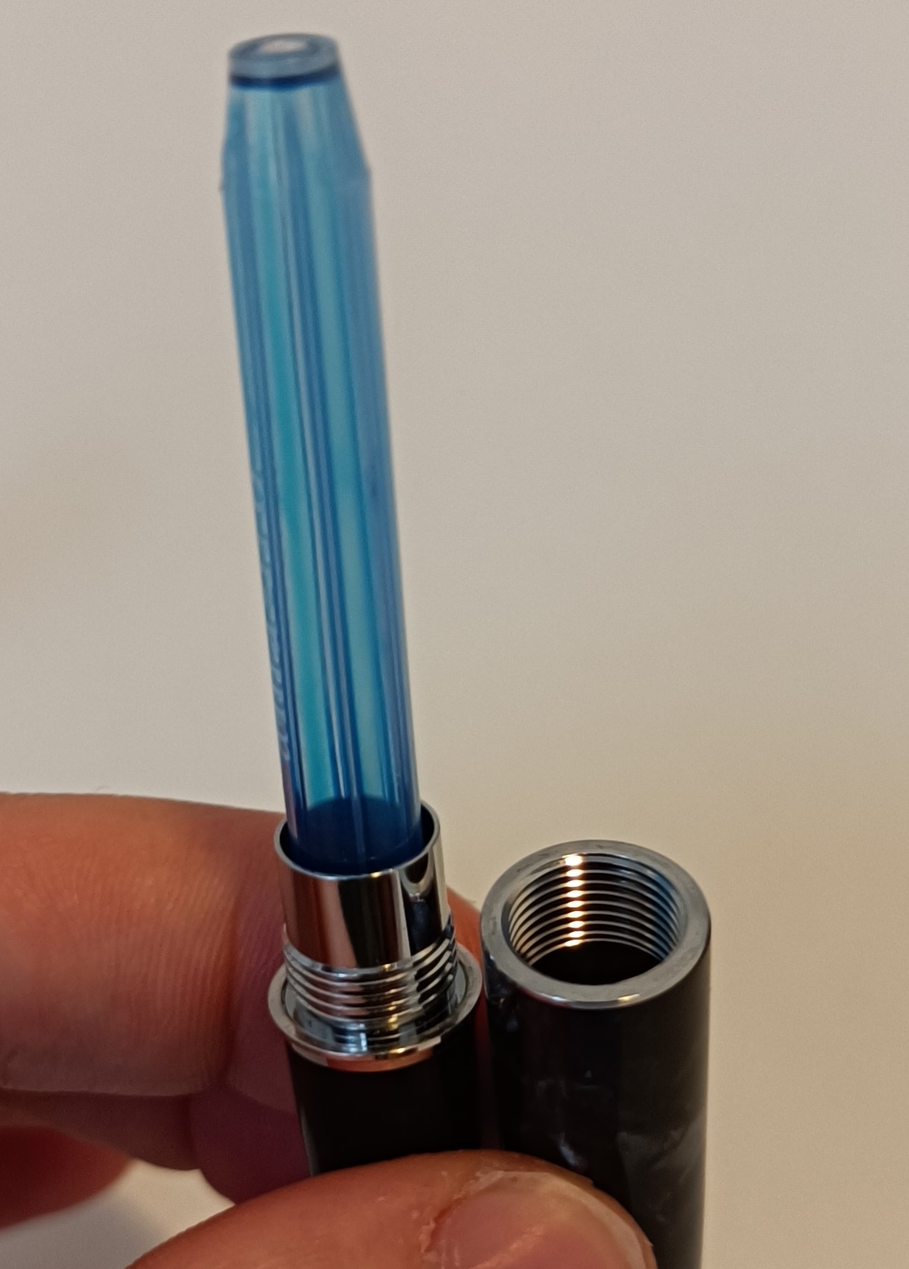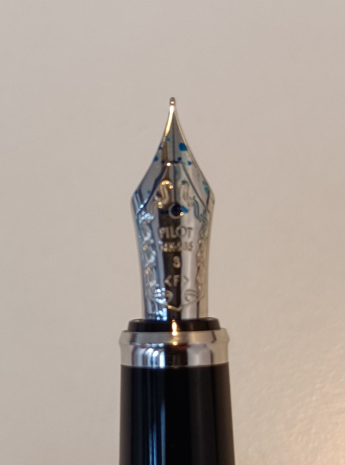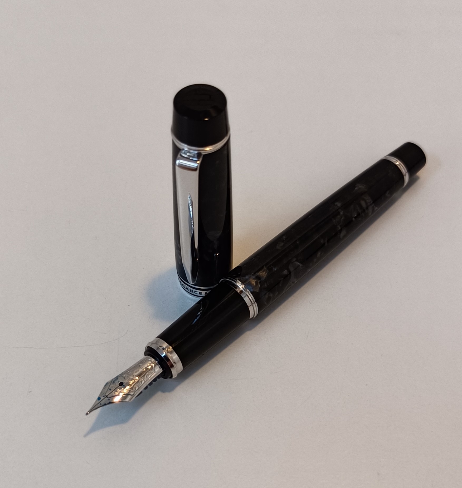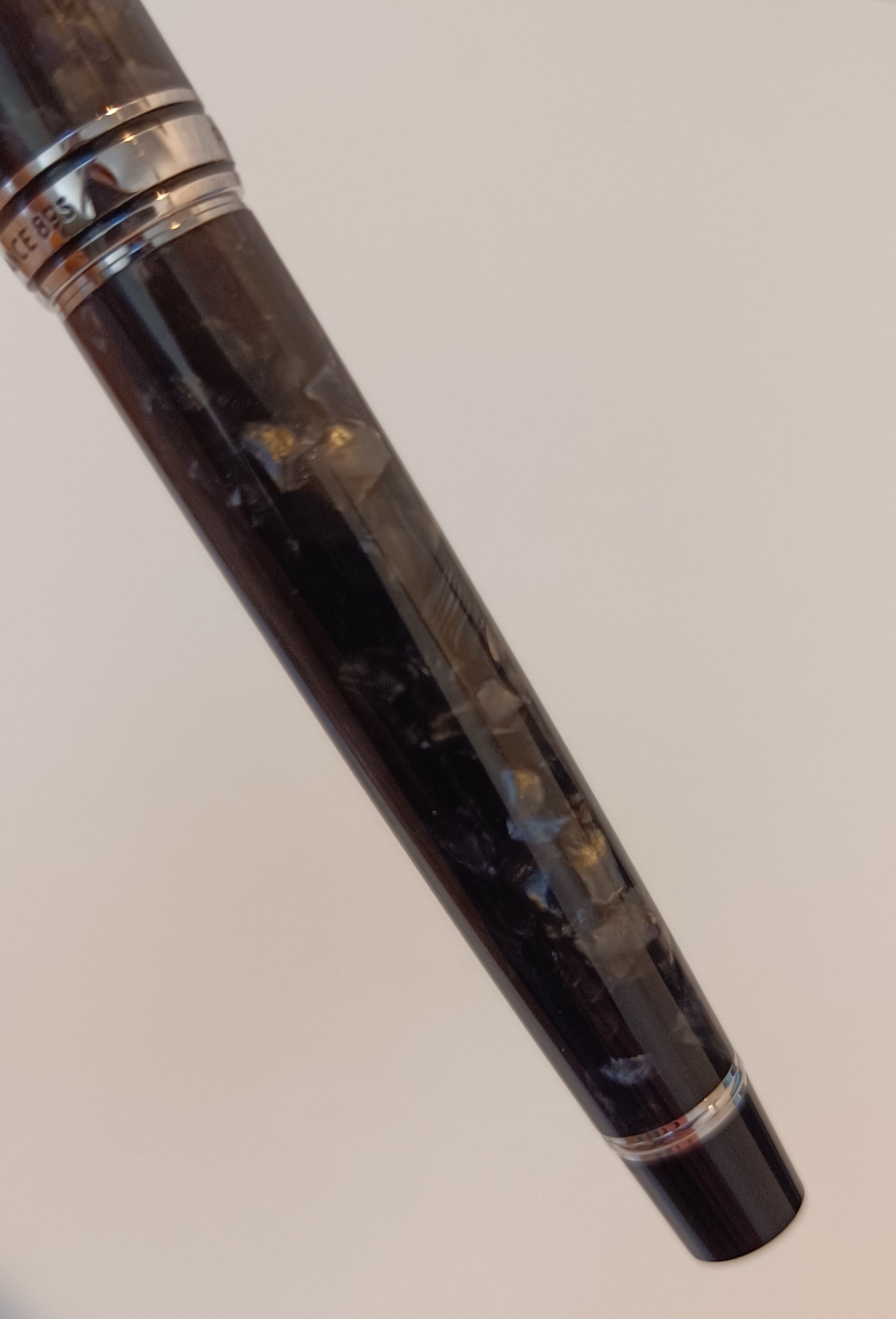 Si tratta di un modello di cui non ho trovato molte informazioni in giro, e non sembra essere circolato molto in Europa, tutto quello che sono riuscito a capire è che il nome "Legance 89s" richiami l'ottantanovesimo anniversario di Pilot e che la "s" stia per "small" ("piccolo" in inglese). Si tratta di una penna di piccole dimensioni, con cappuccio a pressione e pennino in oro 14 carati. La cosa che più mi ha colpito e convinto ad acquistarla è stata la resina con cui è costruita; è un bel nero-grigio marmorizzato, molto sobrio ed elegante, che dà dei bei riflessi alla luce. Trovo anche eleganti le parti finali di corpo e cappuccio che terminano con due "tappi" in semplice resina nera. Si nota in generale una grande attenzione ai dettagli: la vera centrale, gli anelli, il fermaglio sono fissati e lucidati alla perfezione, e la penna sembra godere di grande robustezza. Questa impressione mi è ispirata soprattutto dall'innesto della sezione e dalla filettatura del corpo, entrambi in metallo. La non trascurabile quantità di metallo fa sì che la Legance non sia una penna leggerissima a dispetto delle dimensioni: la trovo leggera al punto giusto, e se si vuole del peso in più si può calzare il cappuccio, cosa che tra l'altro la rende adatta anche a mani più grandi delle mie manine. Vi lascio delle immagini comparative con una Lamy Al-star per far capire meglio le dimensioni. La qualità di scrittura è davvero ottima, tipicamente Pilot: il pennino in oro è del tipo della serie Custom, ma mentre quelle partono dal numero 5 come dimensione del pennino, quello della Legance è di numero 3, quindi è più piccolo di quello della Custom 74 o della Heritage 91. Si tratta di un tratto fine giapponese, quindi molto fine, e com'è tipico dei pennini in oro Pilot è morbido e scorrevole (ma non flessibile). A seconda del tipo di carta e di inchiostro si può avvertire un certo feedback. Trovo il flusso perfettamente adeguato. In conclusione, trovo sia veramente una bella penna che esce dallo stereotipo "scrive bene ma è bruttina (a meno che non sia urushi o maki-e)", riuscendo a offrire una bella esperienza di scrittura e un certo fascino estetico.