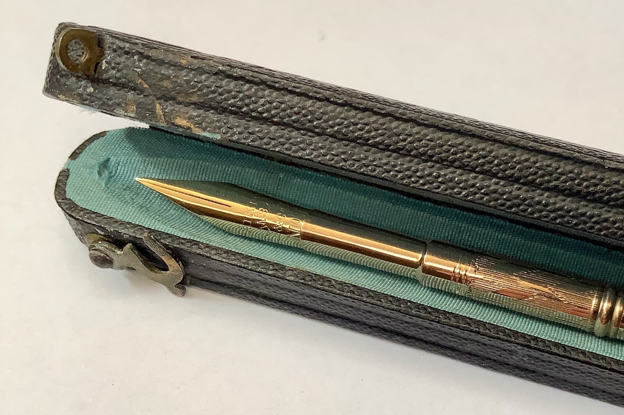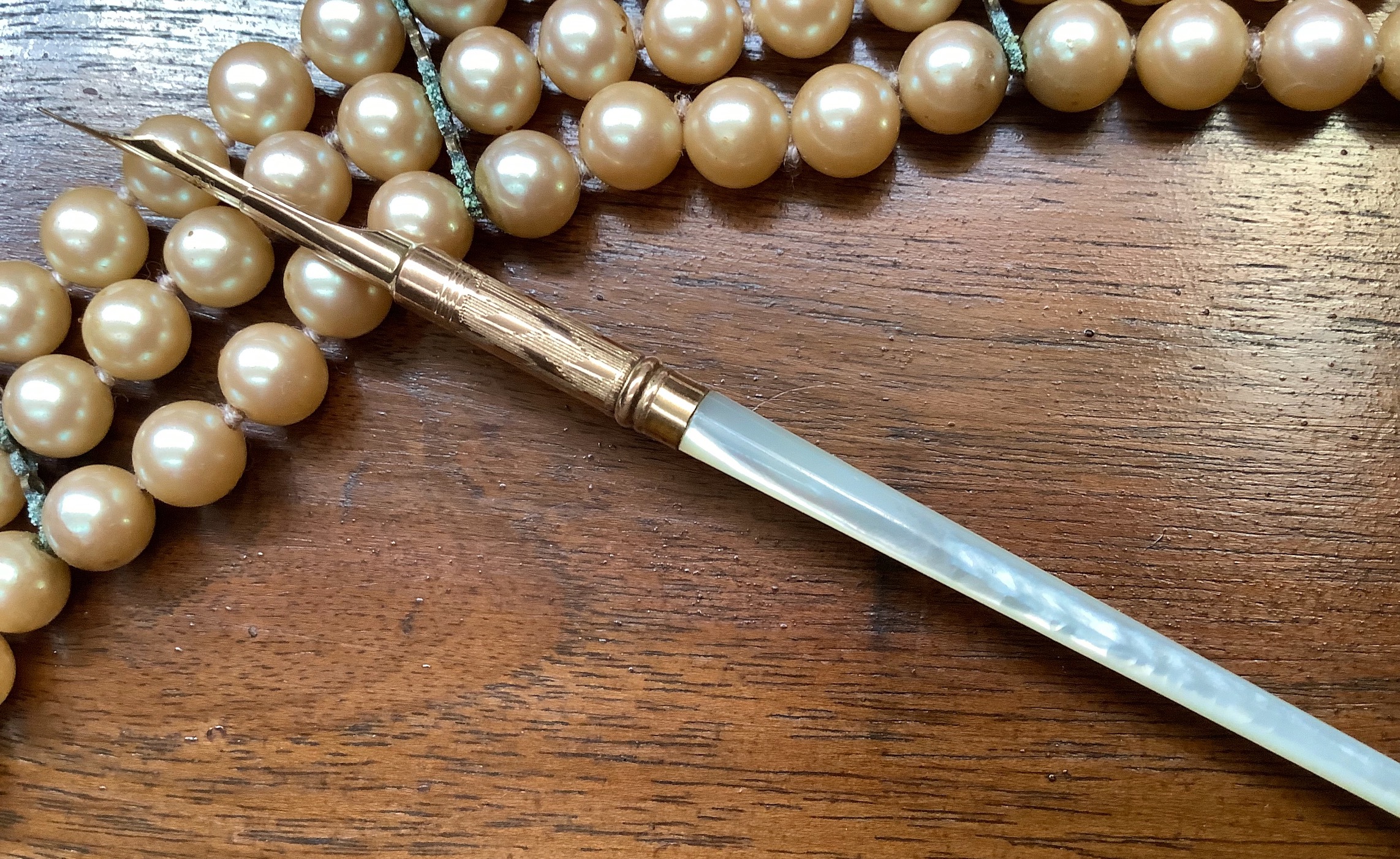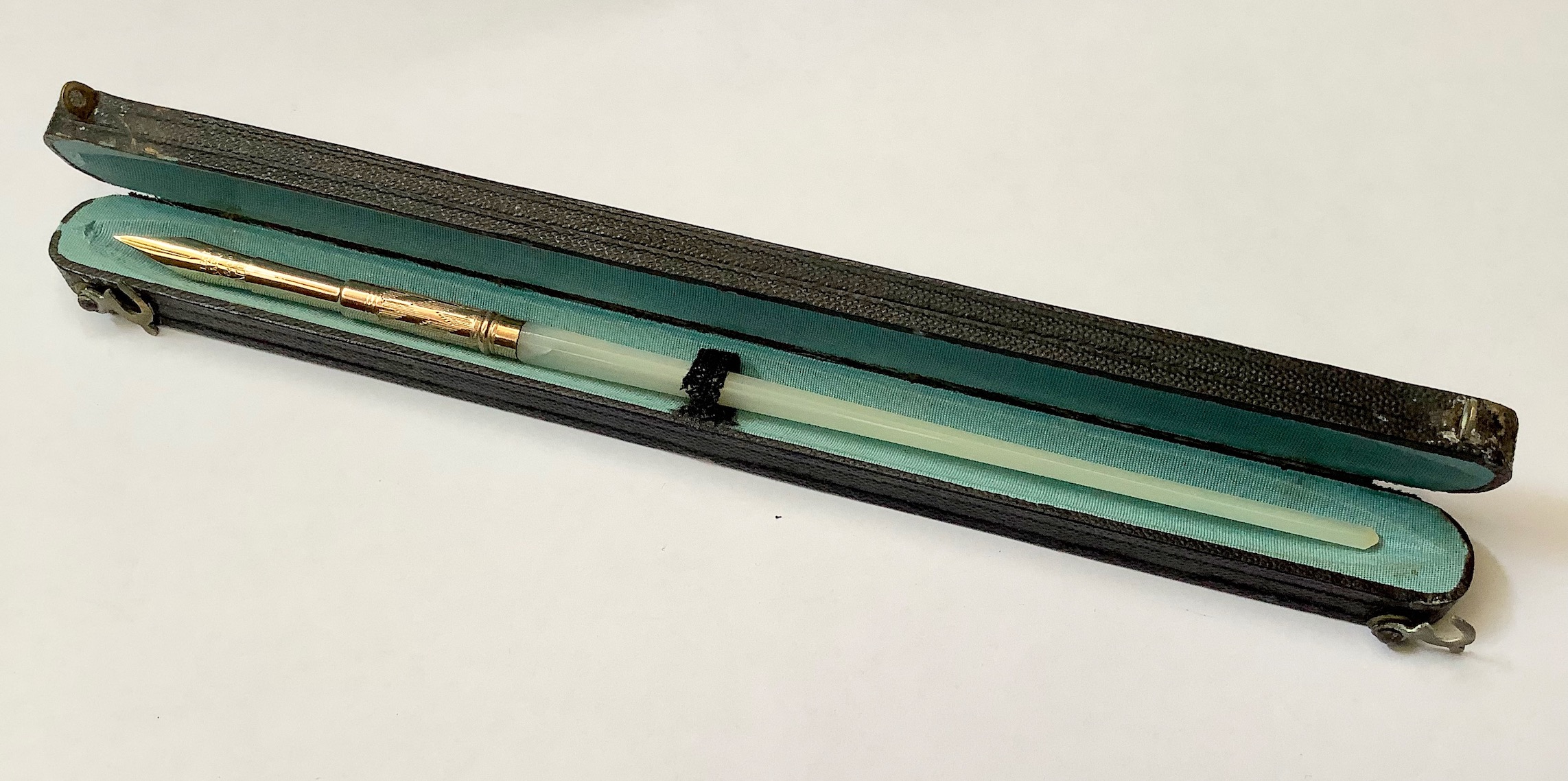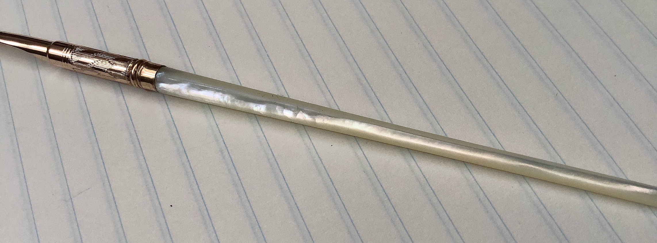 Dovrebbe essere la misura più piccola (pennino numero 1) della serie di penne per intinzione con corpo in madreperla prodotte dalla Aikin Lambert & Co di New York https://www.fountainpen.it/Aikin_Lambert/it