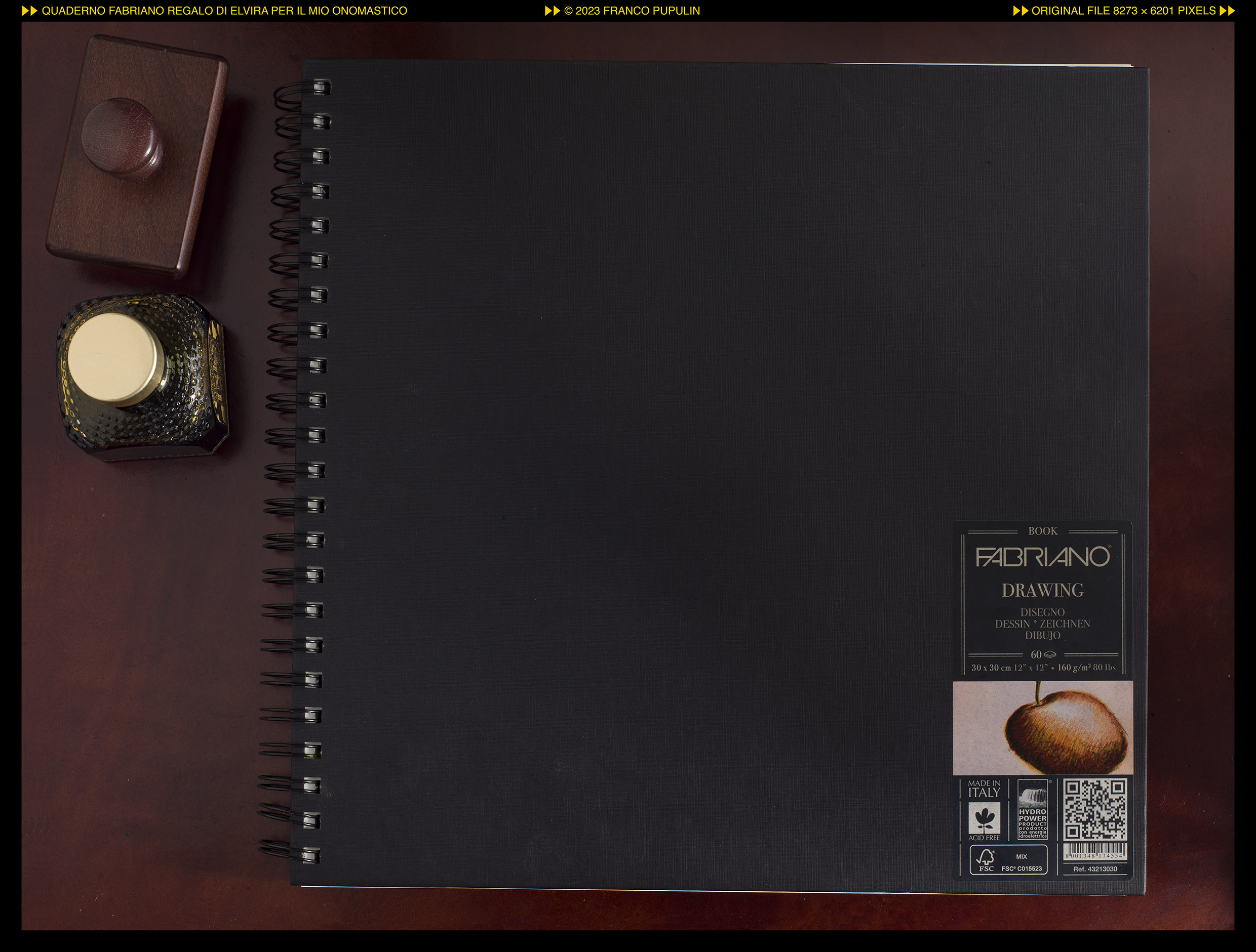 Per il mio scorso onomastico, la mia cara moglie mi ha regalato un bellissimo quadernone di Fabriano che non conoscevo, il “Fabriano Drawing Book”. Si tratta di un quaderno di 30x30 cm, legato con anelli su un lato, con una splendida copertina (e uguale cartone di retro) ricoperta in tela editoriale nera. All’interno ci sono 60 fogli di carta bianca, priva di acidi (cioè con qualità da conservazione), da 160 grammi al metro quadrato. È una carta piacevole al tatto, non liscissima ma con una sua leggera textura, di un colore bianco neutro.