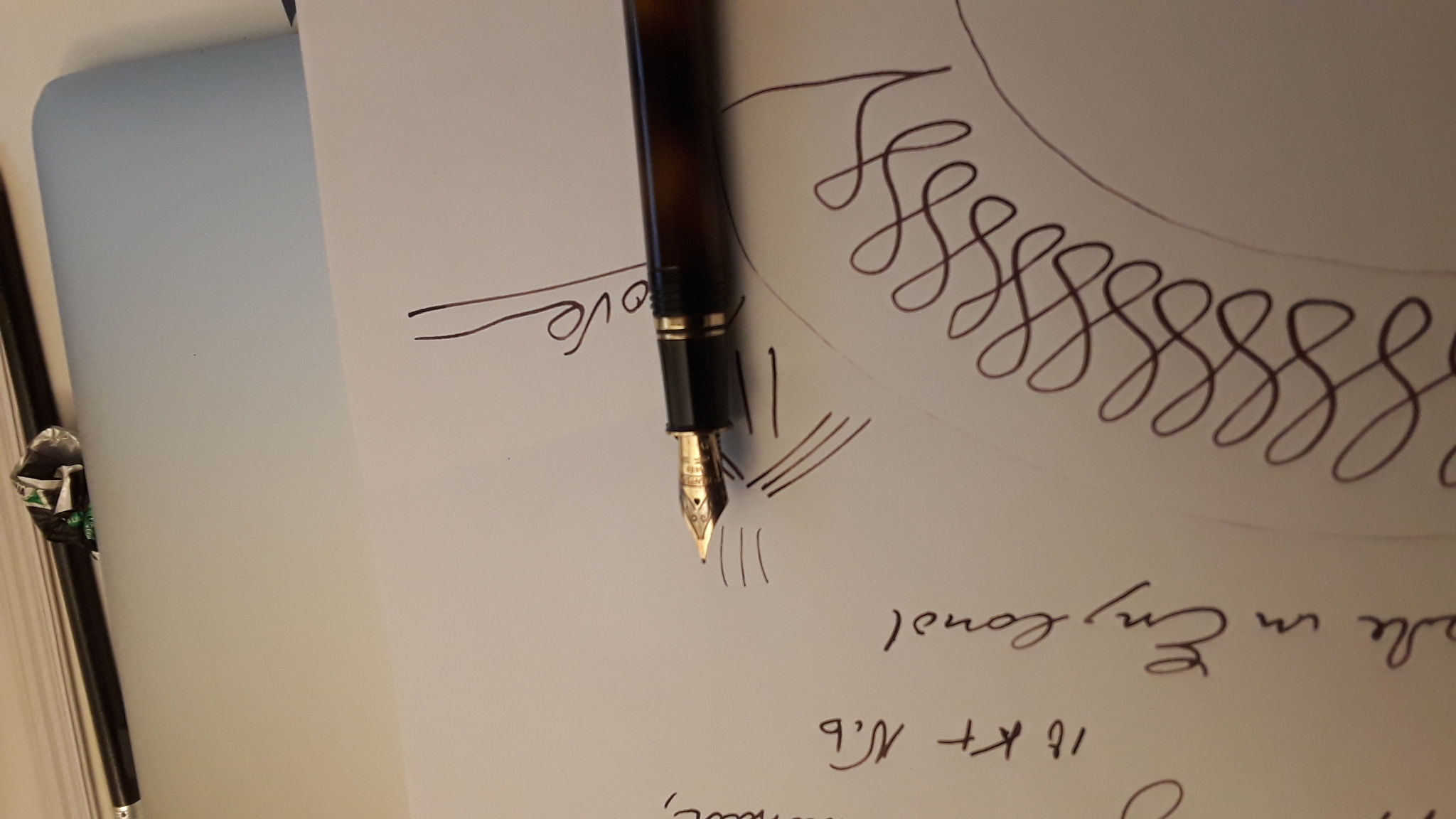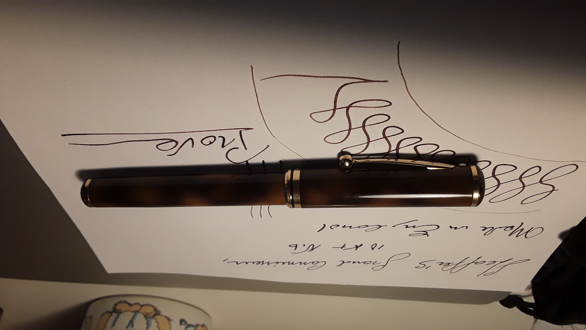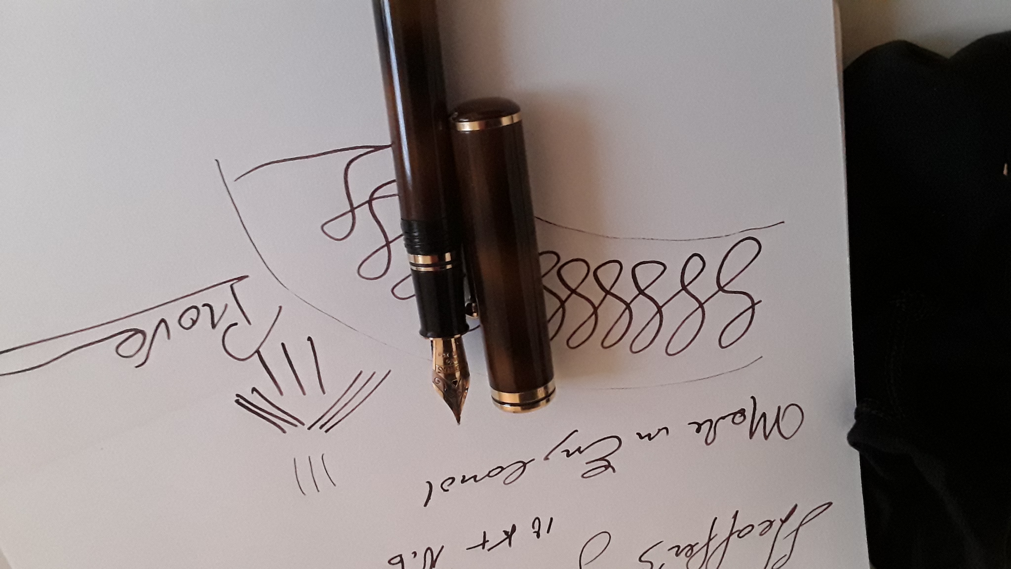 Per intanto scrive veramente bene...il pennino, 18kt, dovrebbe essere un F....non ho trovato nessun riscontro a questa ipotesi....La stoprovando, sempre per intinzione, con inchiostro Montblanc Bordeaux...non penso sia il piu adatto, troppo fluido credo, ma le prime impressioni sono molto buone. La penna da una bella impressione di solidità e sembra pesare 36gr completamente scarica, con la sola cartuccia originale vuota......lo so, dovrei imparare a fare foto migliori...scusatemi...r