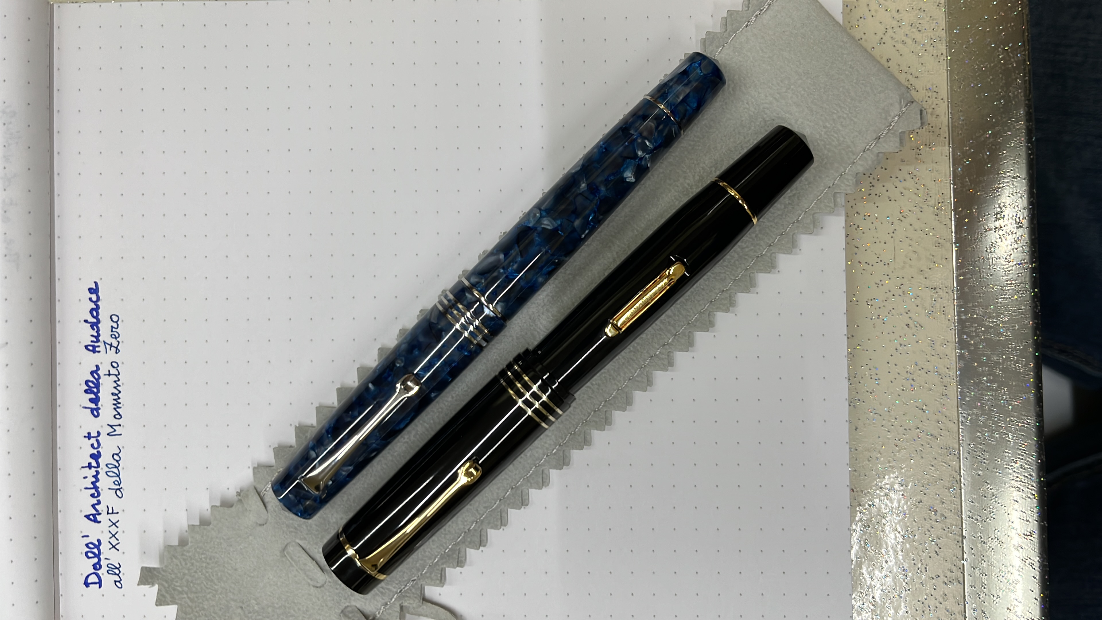La Audace è una rivisitazione in chiave moderna delle Senior di un tempo, una penna dalle dimensioni grosse ma non eccessive. Lo stile è quello delle flat top tipo Duofold, solo che qui gli estremi sono leggermente acuminati a imitare il Jewel introdotto sulle Vacumatic. La clip a ruzzolina è quella di Wahl, ma resa ancora più famosa da OMAS, e il labbro sul cappuccio ci ricorda le produzioni nostrane degli anni ‘30-’40. Sono tanti gli elementi a cui Leonardo si è ispirata per tirare fuori una penna che trovo di una eleganza andata persa nel tempo, un classico che va a nozze non solo con i materiali di un tempo ma anche con materiali più moderni.