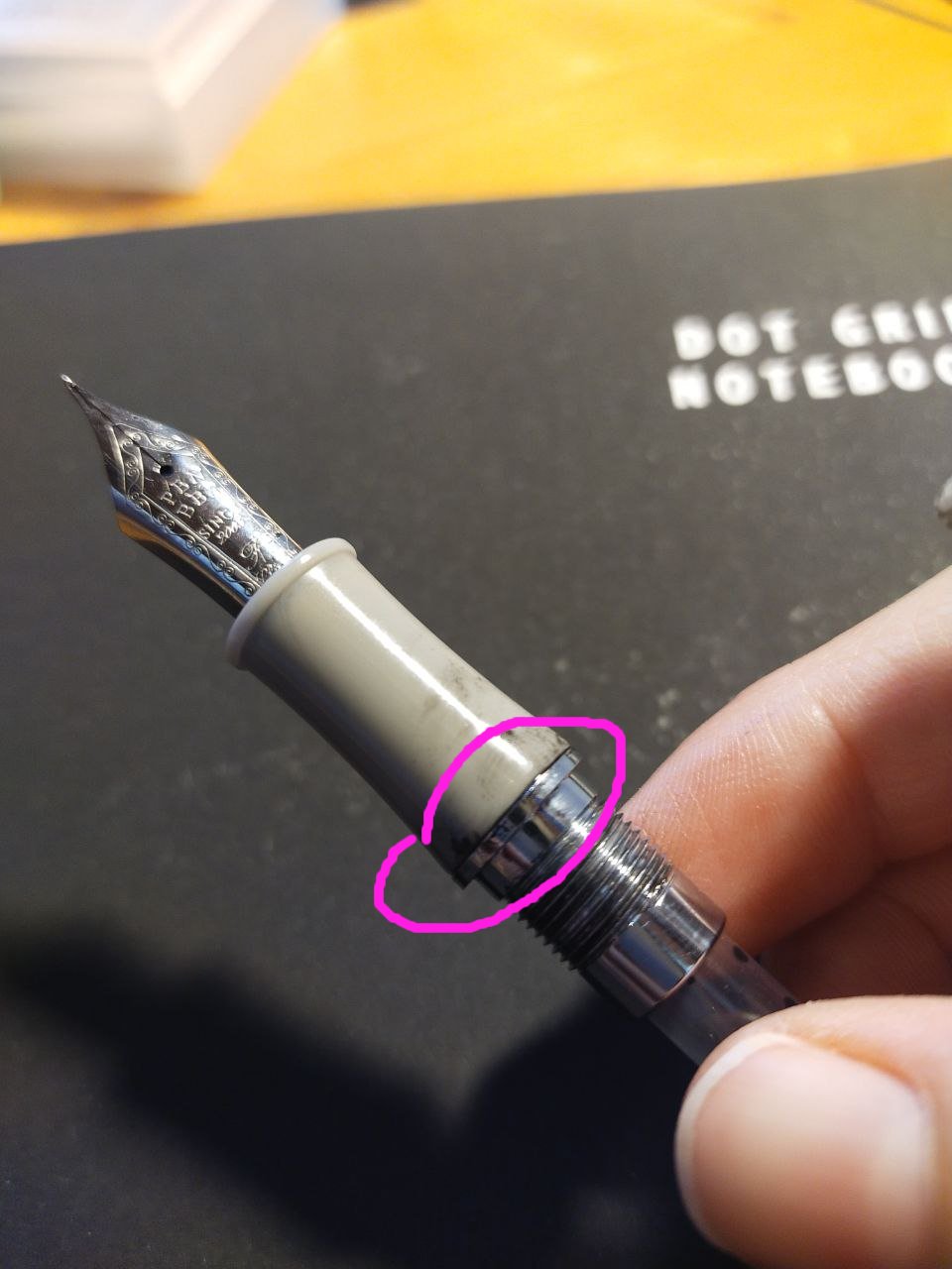 Da qualche giorno notavo qualche leggera perdita di inchiostro sull'impugnatura della penna, e vi era anche un po' di gioco tra la resina e il blocco alimentatore/sezione e credo che un oring dello spessore di un capello, si sia rotto pochi giorni fa (l'ho rimosso ma era davvero quasi invisibile). Effettivamente in quella sezione della penna, sono presenti o ring? Oppure poteva essere dell'inchiostro asciutto?