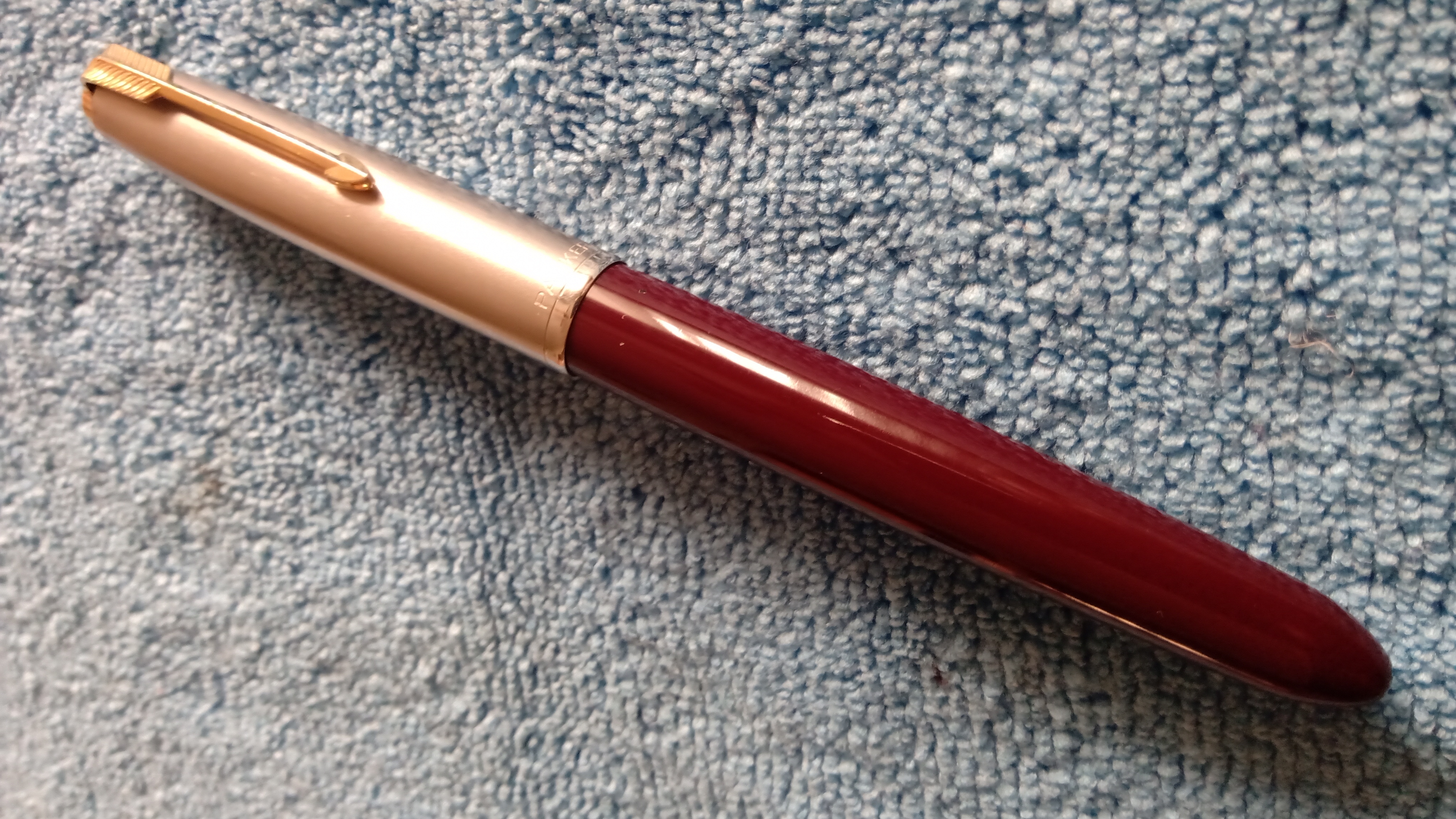Ecco una emblematica Parker 51 Aerometric degli anni 60, con praticamente tutte le sue parti prodotte localmente, con gioiello in perle, clip placcata in oro, cappuccio in Lustraloy, corpo e impugnatura in Lucite, acrilico sviluppato da Dupont per Parker, colore Cordovan Brown e pennino di Octanium originale, prodotto negli Stati Uniti.