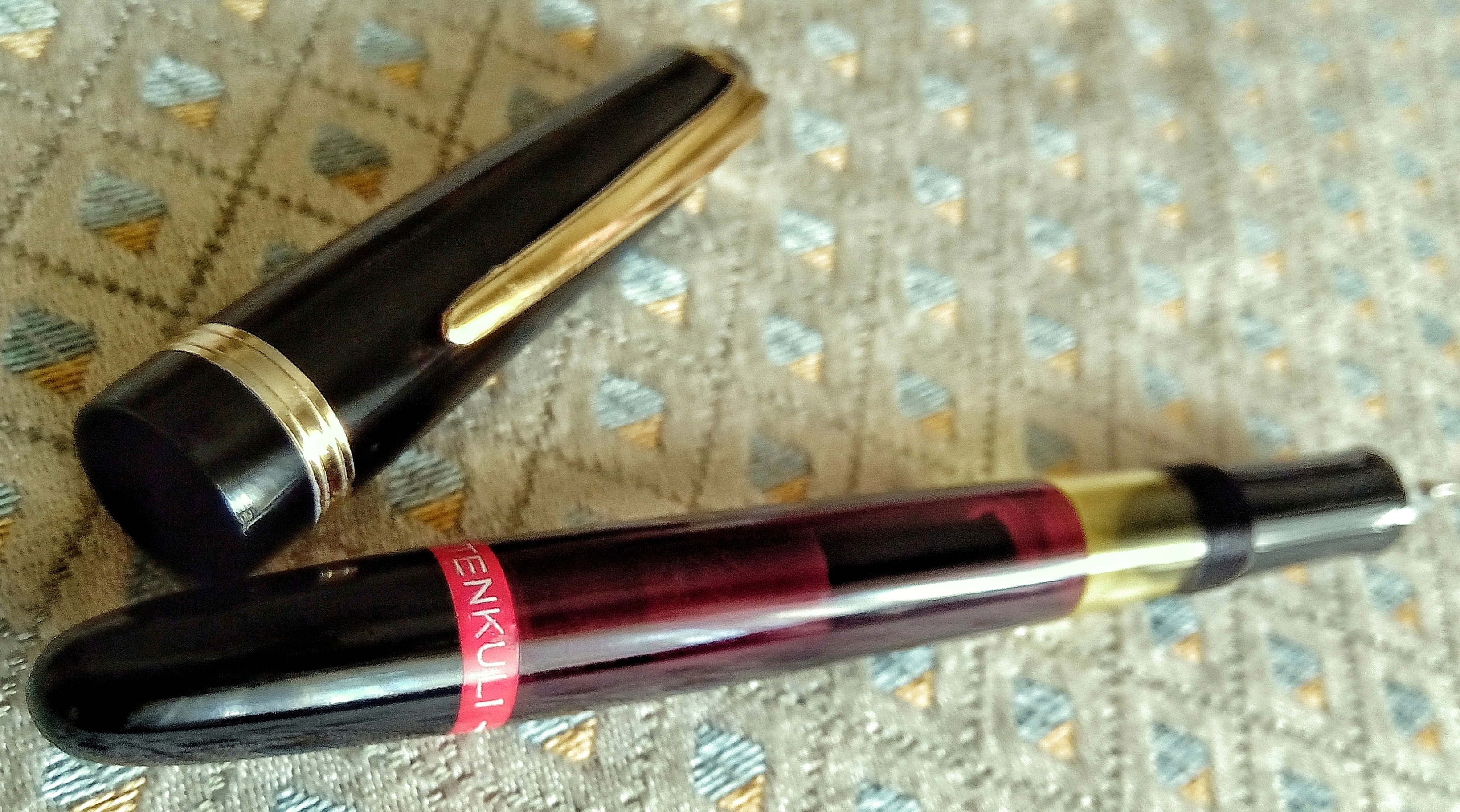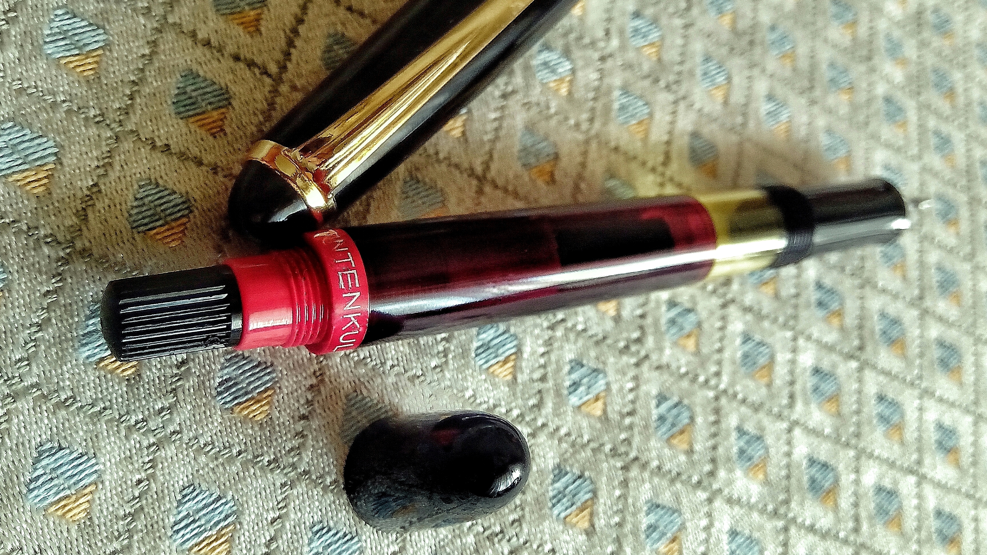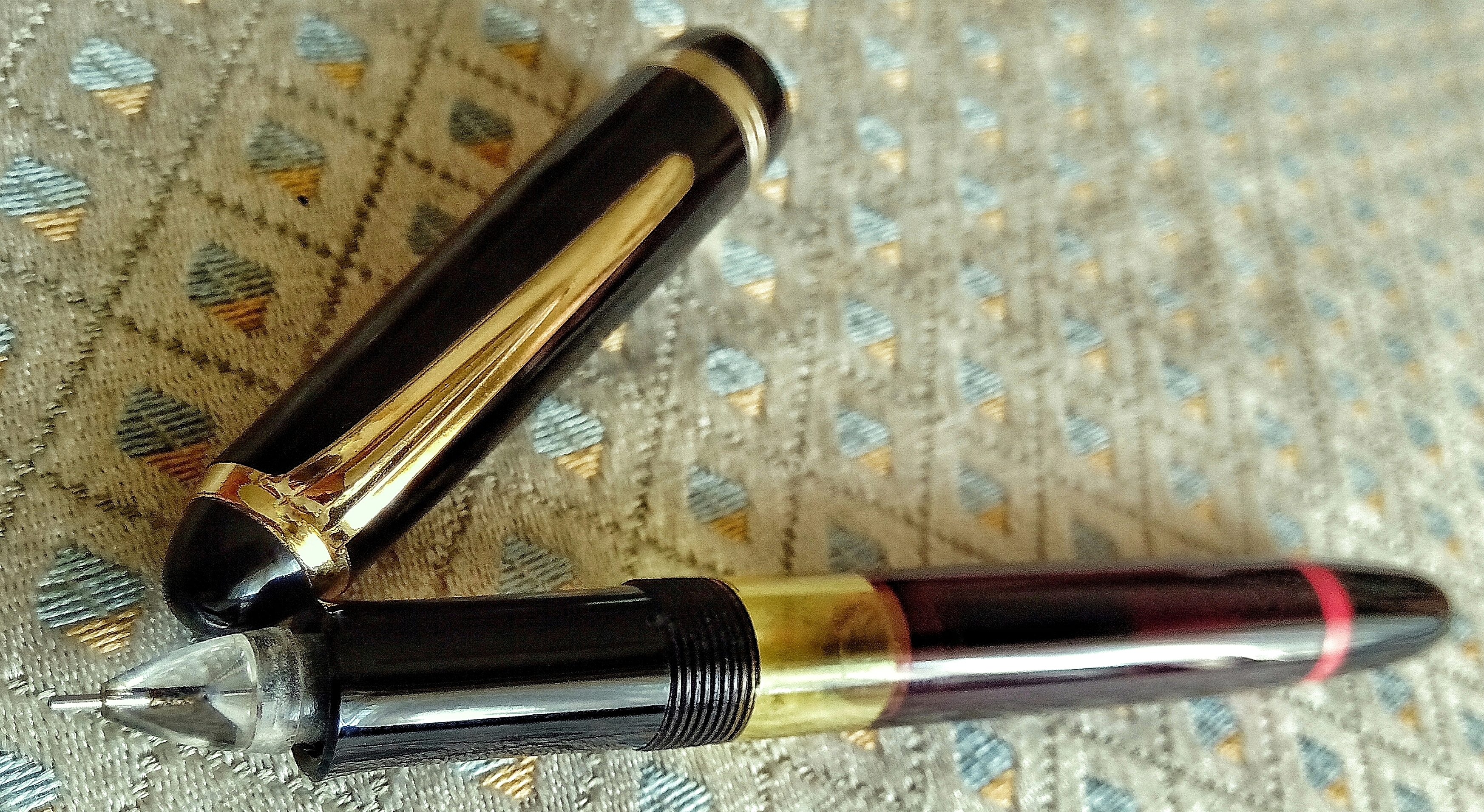 Qui abbiamo il caso di una penna capilografica, una degli ultimi Tintenkuli, di provenienza tedesca e degli anni 50/60, secondo alcuni fabbricata totalmente o parzialmente in Argentina, secondo altri solo assemblata, con punta trasparente, punta in lega di tungsteno, pistone di carica, cappuccio in celluloide nera con anello dorato e clip placcata oro, corpo trasparente colorato nero con finestra del livello dell'inchiostro non colorato, anello di caricamento in celluloide rossa, manopola di caricamento e cappuccio cieco in celluloide nera, un gioiello di ingegneria che funziona come quando è partito la fabbrica...!!!