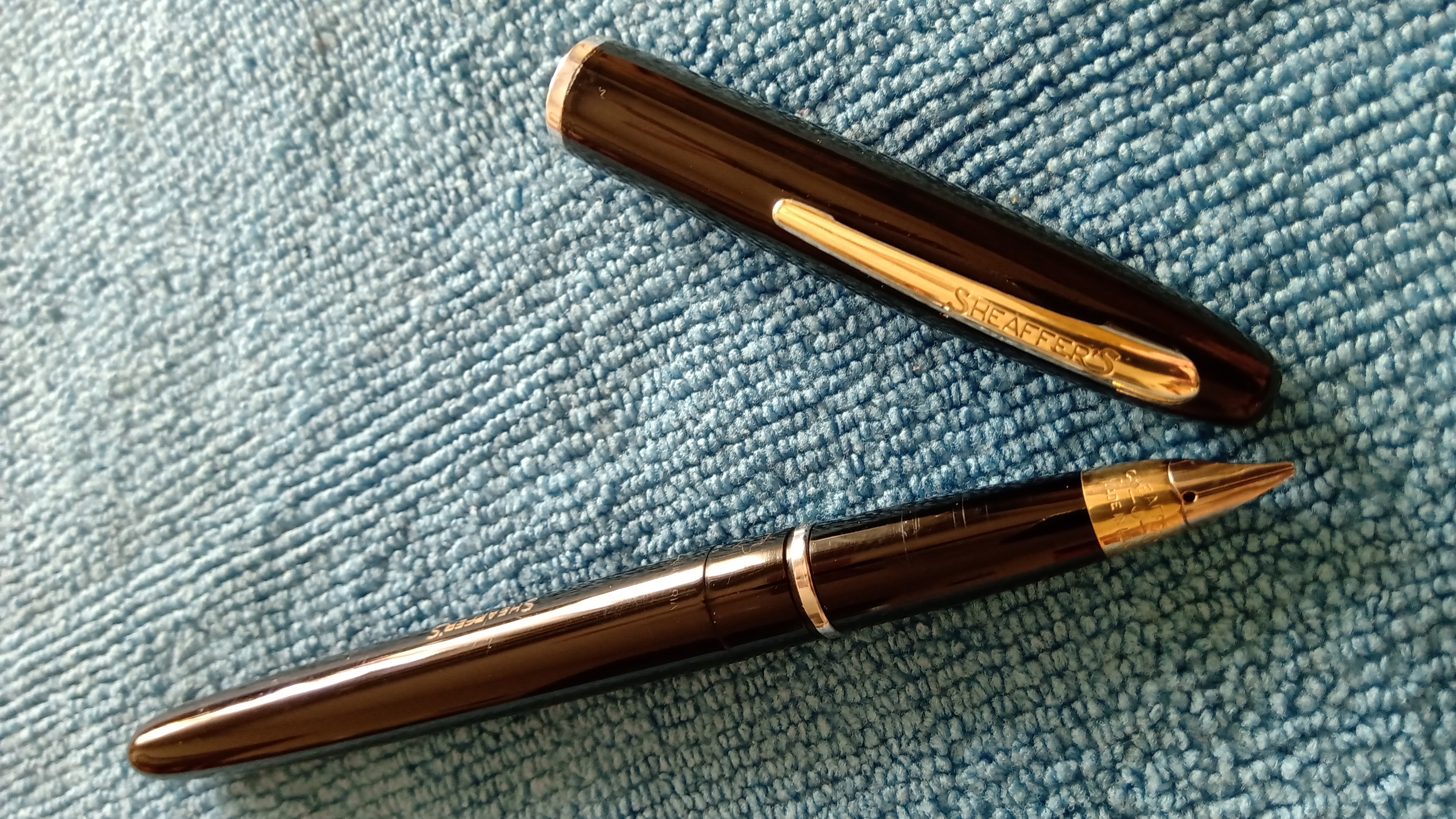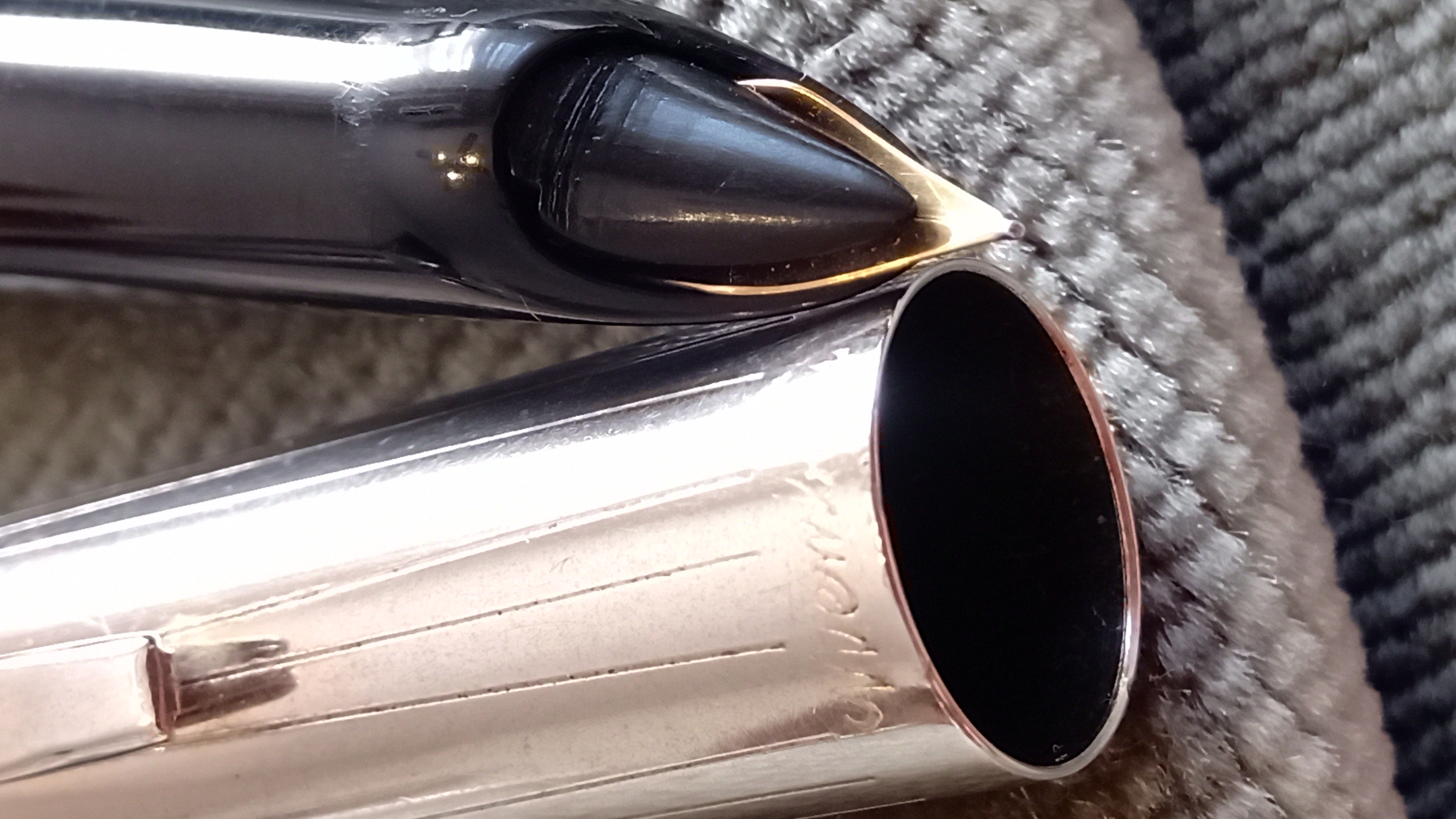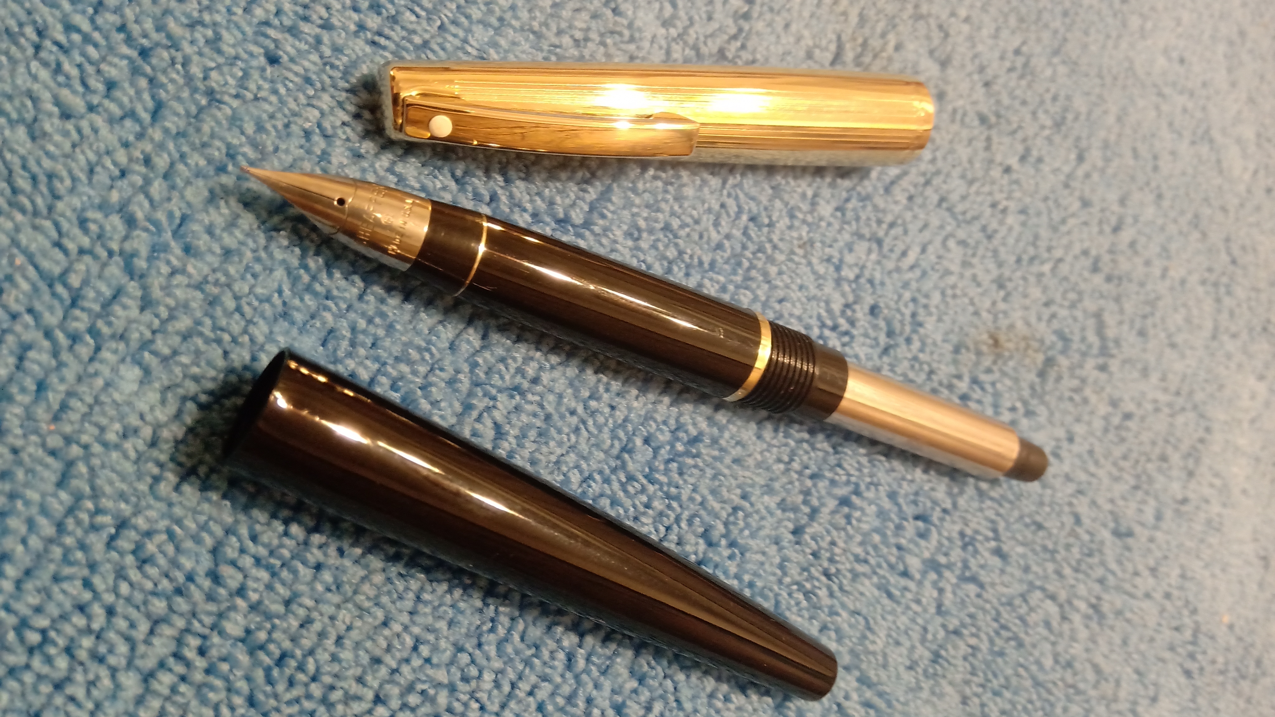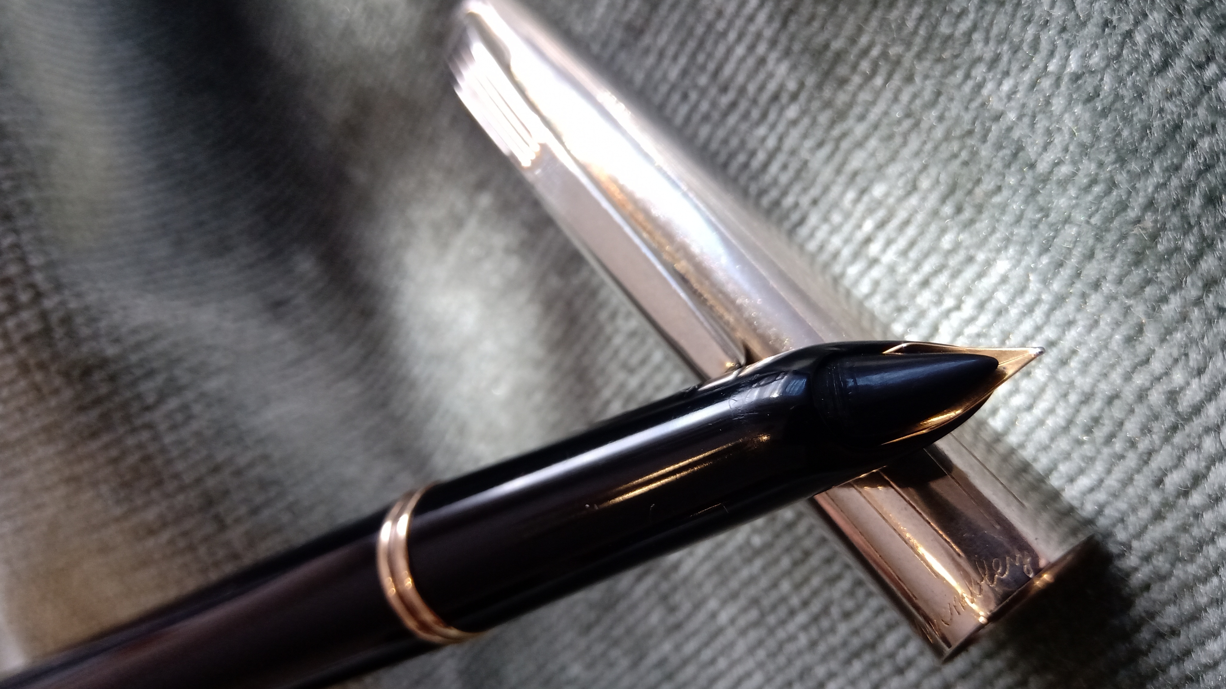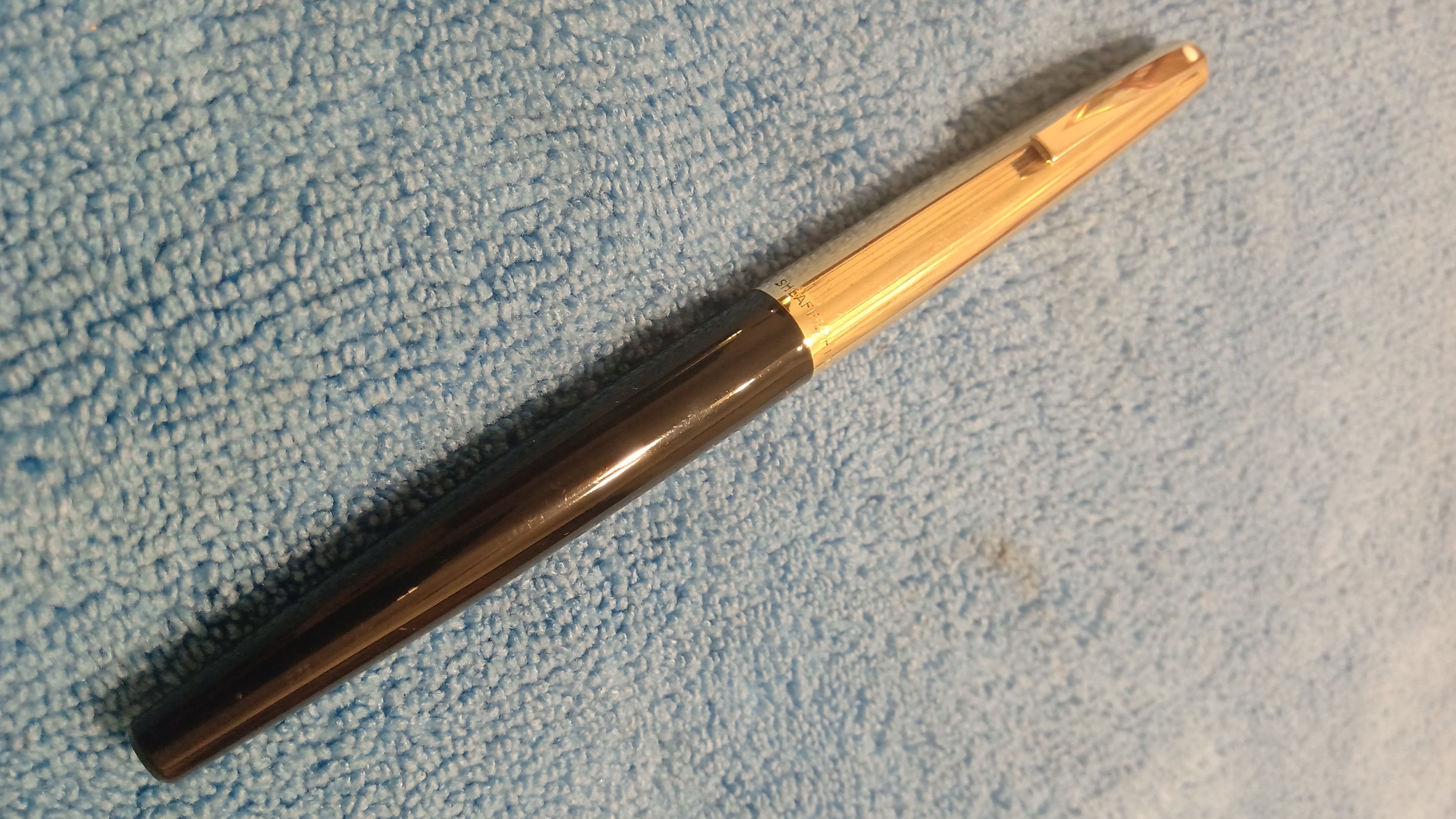 Si tratta di una Sheaffer's degli anni 60/70 quasi interamente prodotta in Argentina, e dico Sheaffer's e non Sheaffer, Imperial 777, Stylist Lifetime, con corpo, cappuccio e clip placcati oro incisi, con sistema di conversione aerometrica originale, impugnatura in acrilico nera, e un magnifico pennino corto conico originale, in argento palladio prodotto negli Stati Uniti, che ad un certo punto gli ho presentato nel forum e che scrive meravigliosamente...!!!