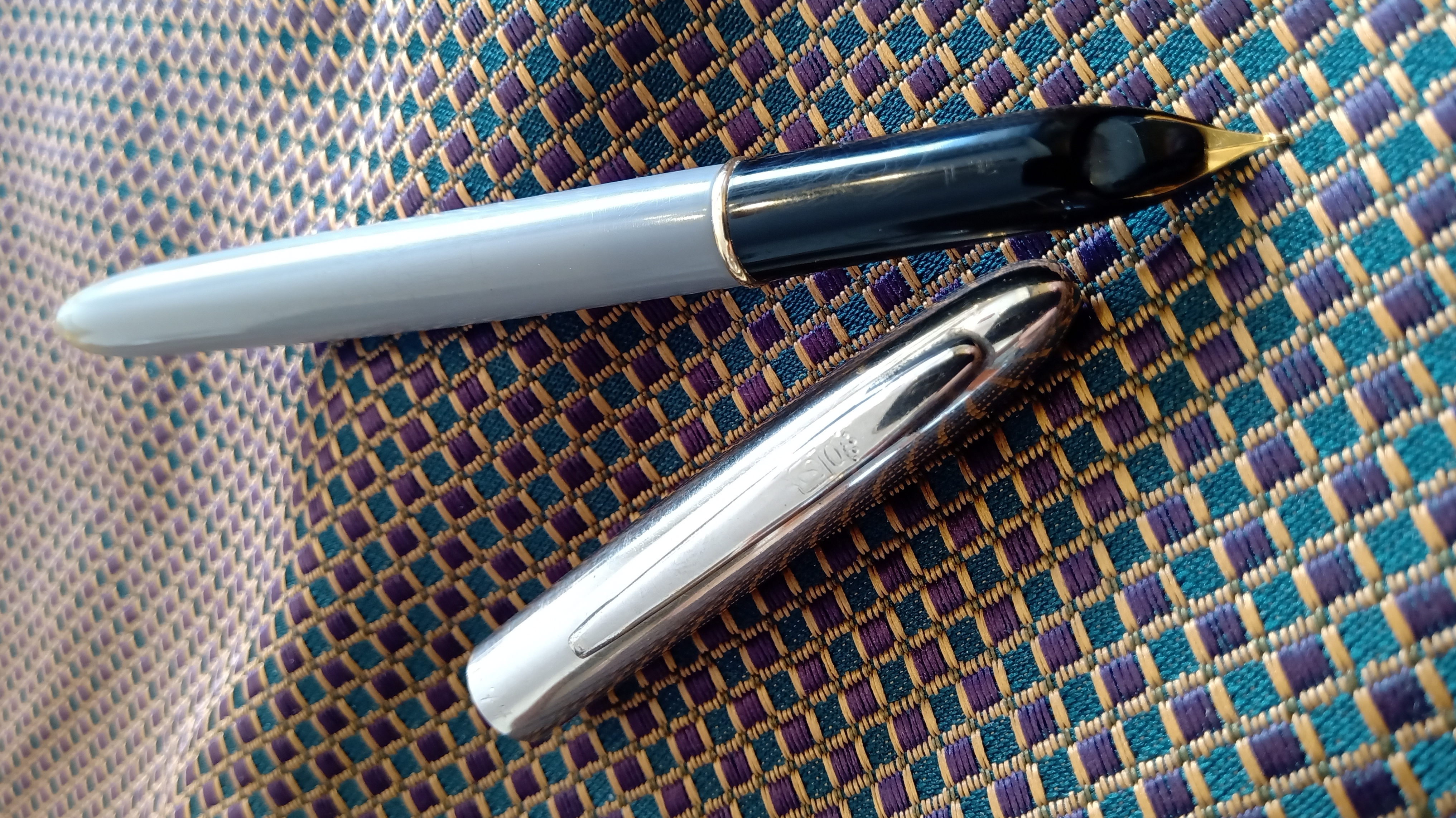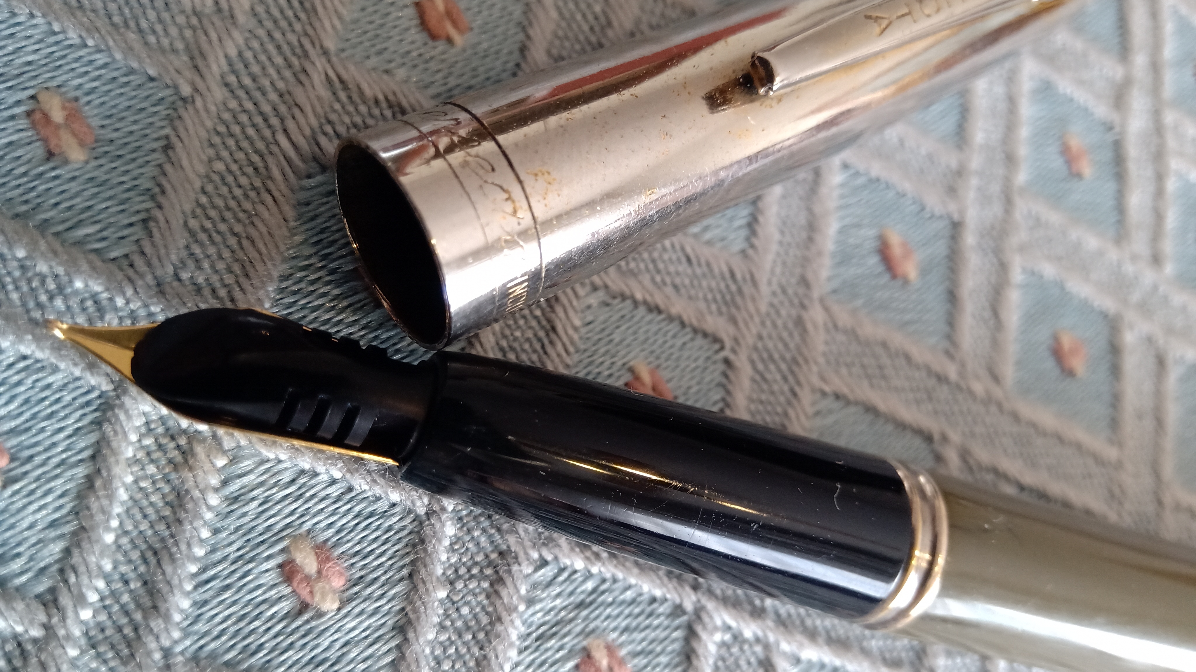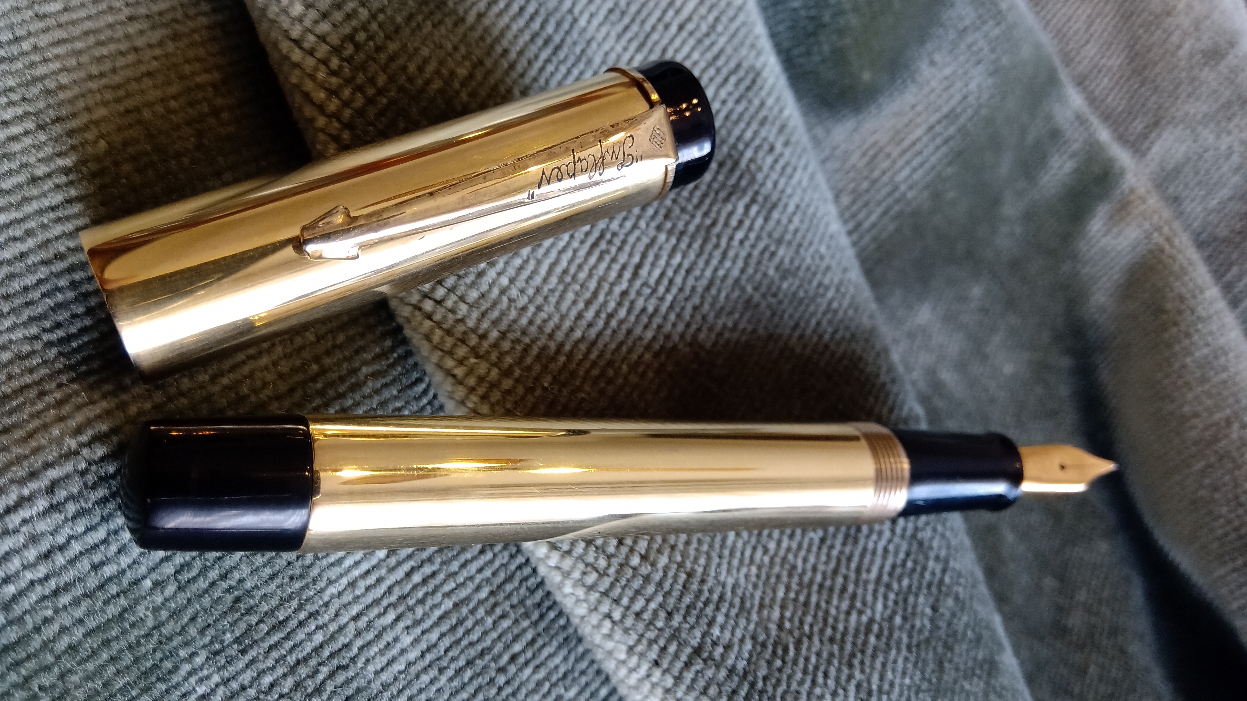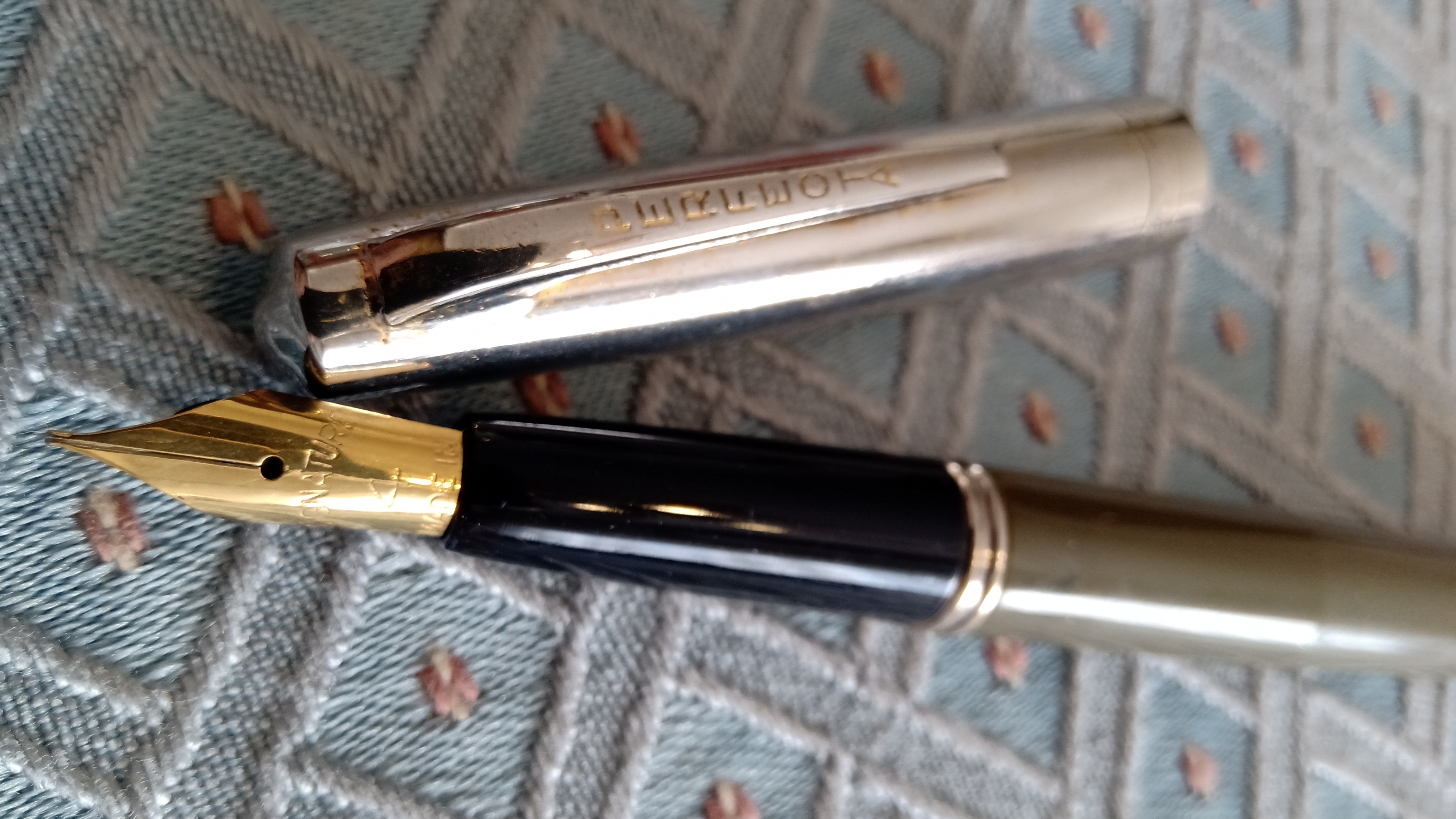 Si tratta di una Sheaffer's degli anni 60/70 quasi interamente prodotta in Argentina, e dico Sheaffer's e non Sheaffer, Imperial 777, Stylist Lifetime, con corpo, cappuccio e clip placcati oro incisi, con sistema di conversione aerometrica originale, impugnatura in acrilico nera, e un magnifico pennino corto conico originale, in argento palladio prodotto negli Stati Uniti, che ad un certo punto gli ho presentato nel forum e che scrive meravigliosamente...!!!