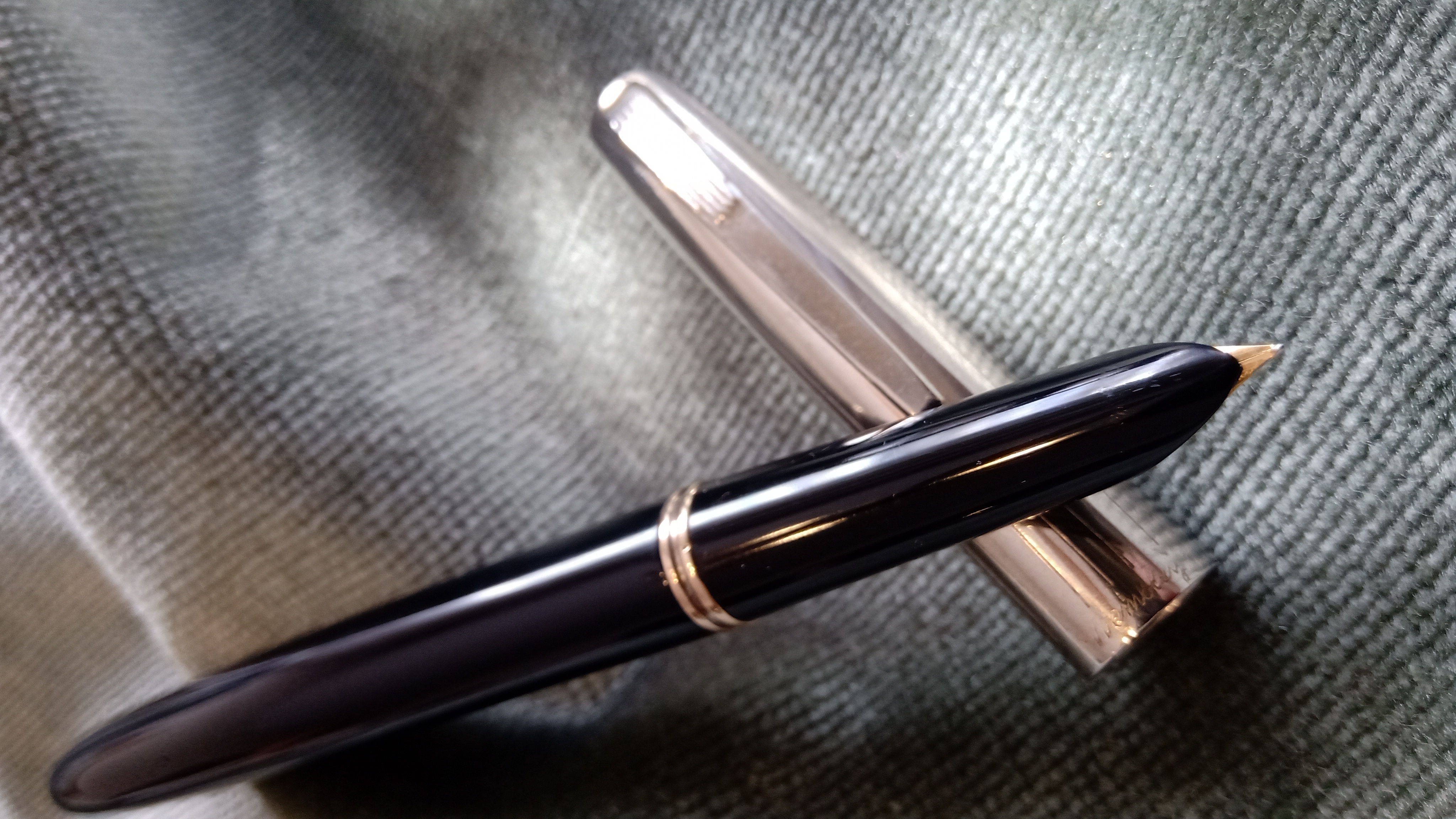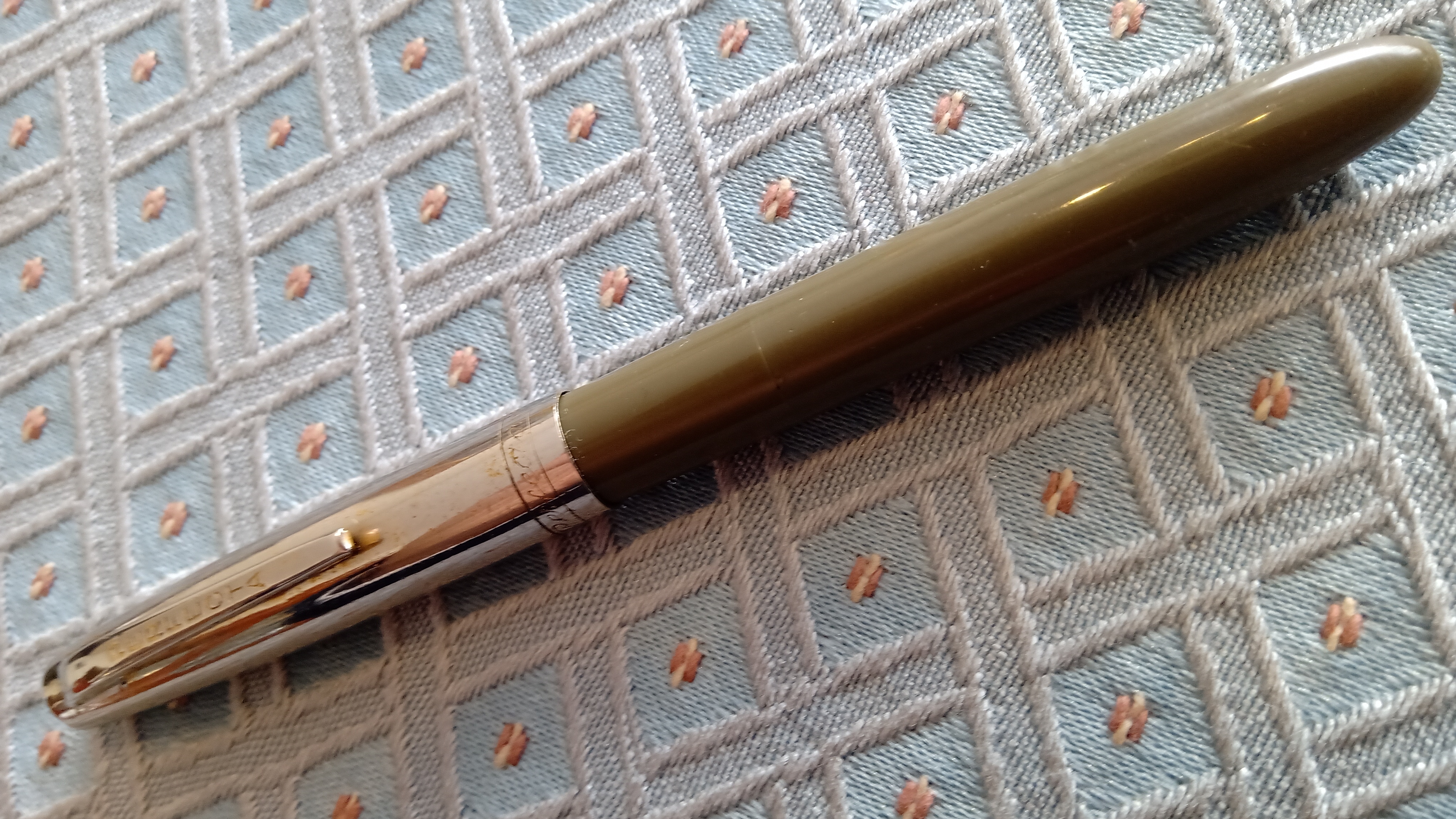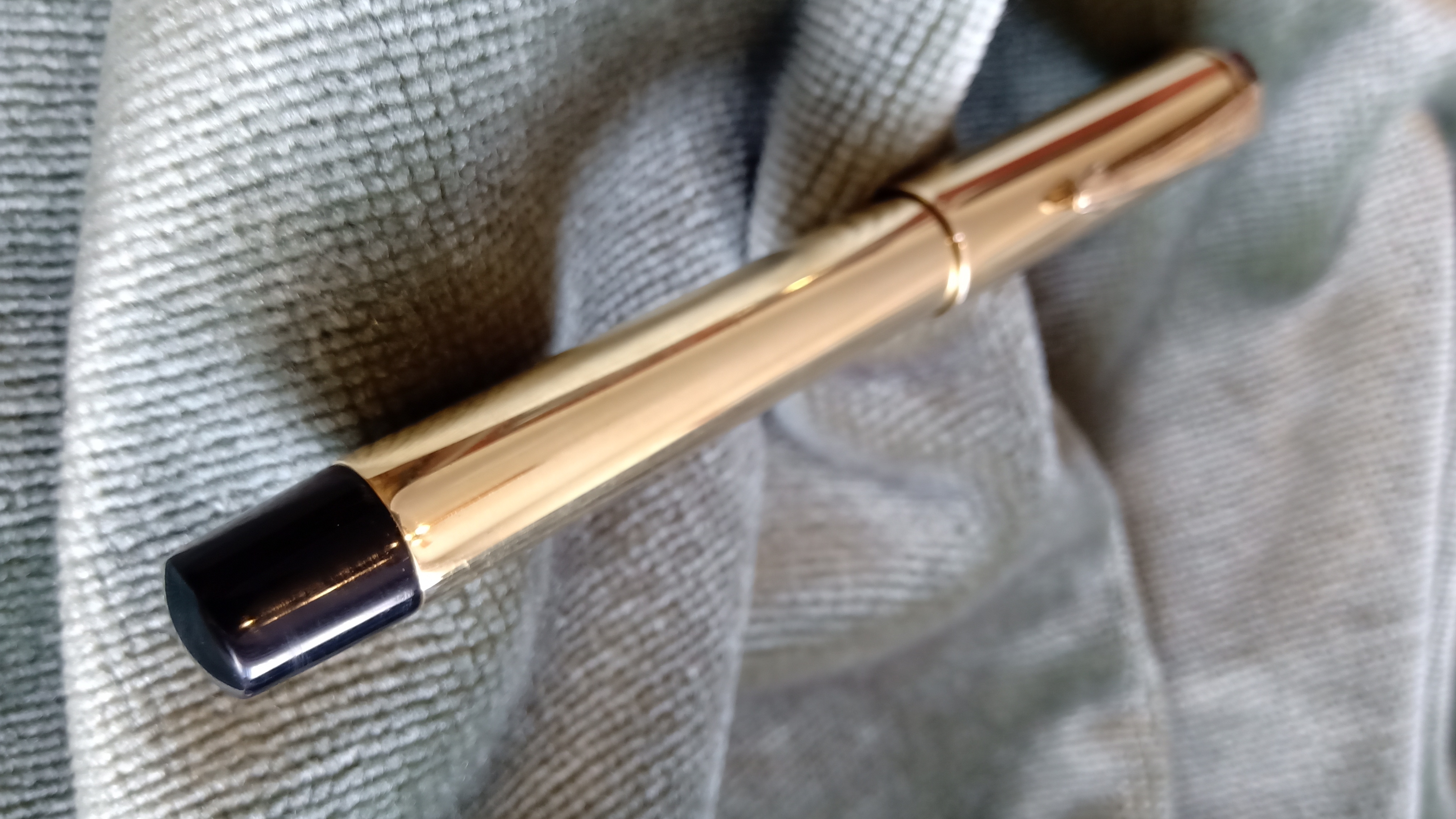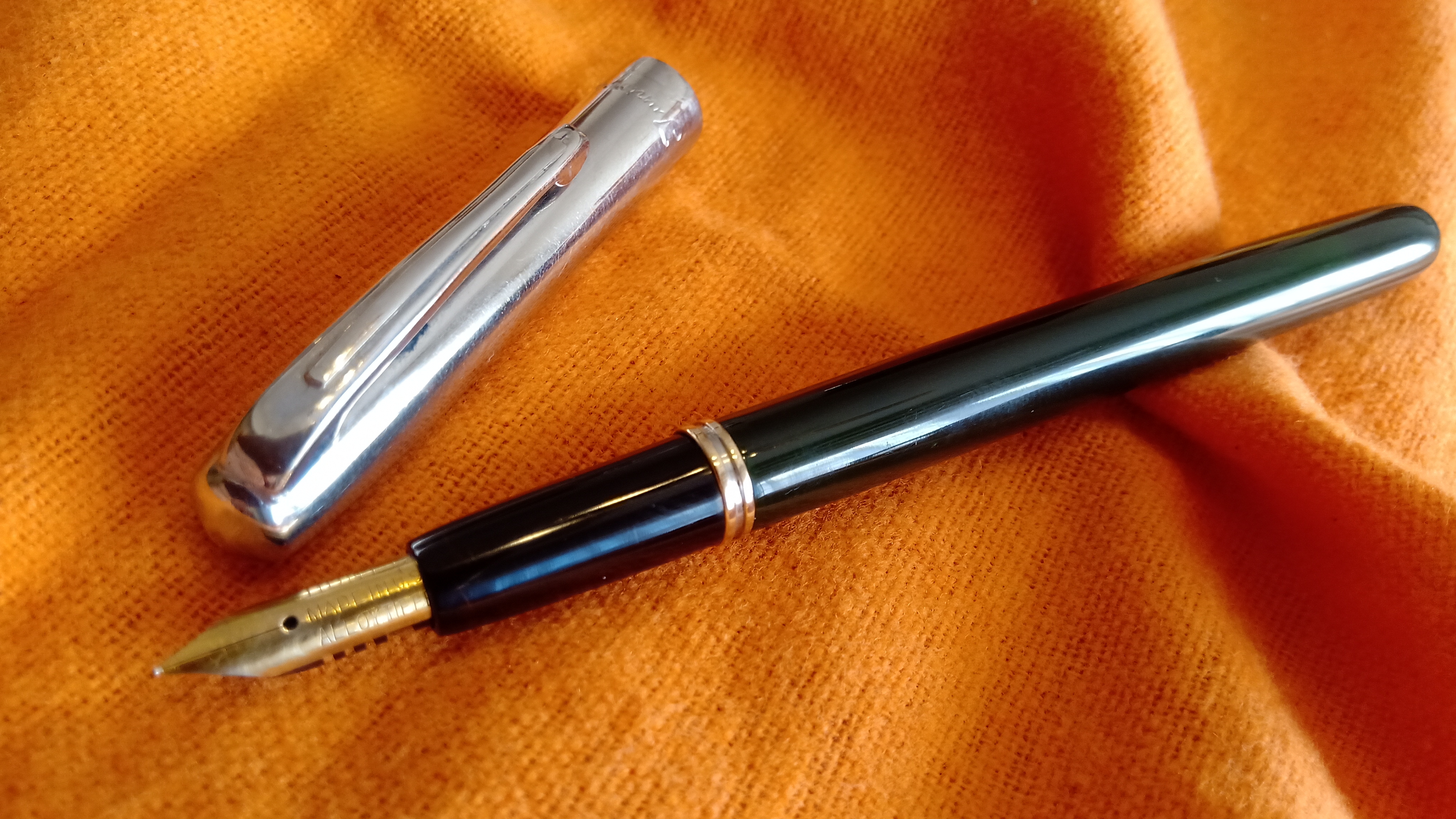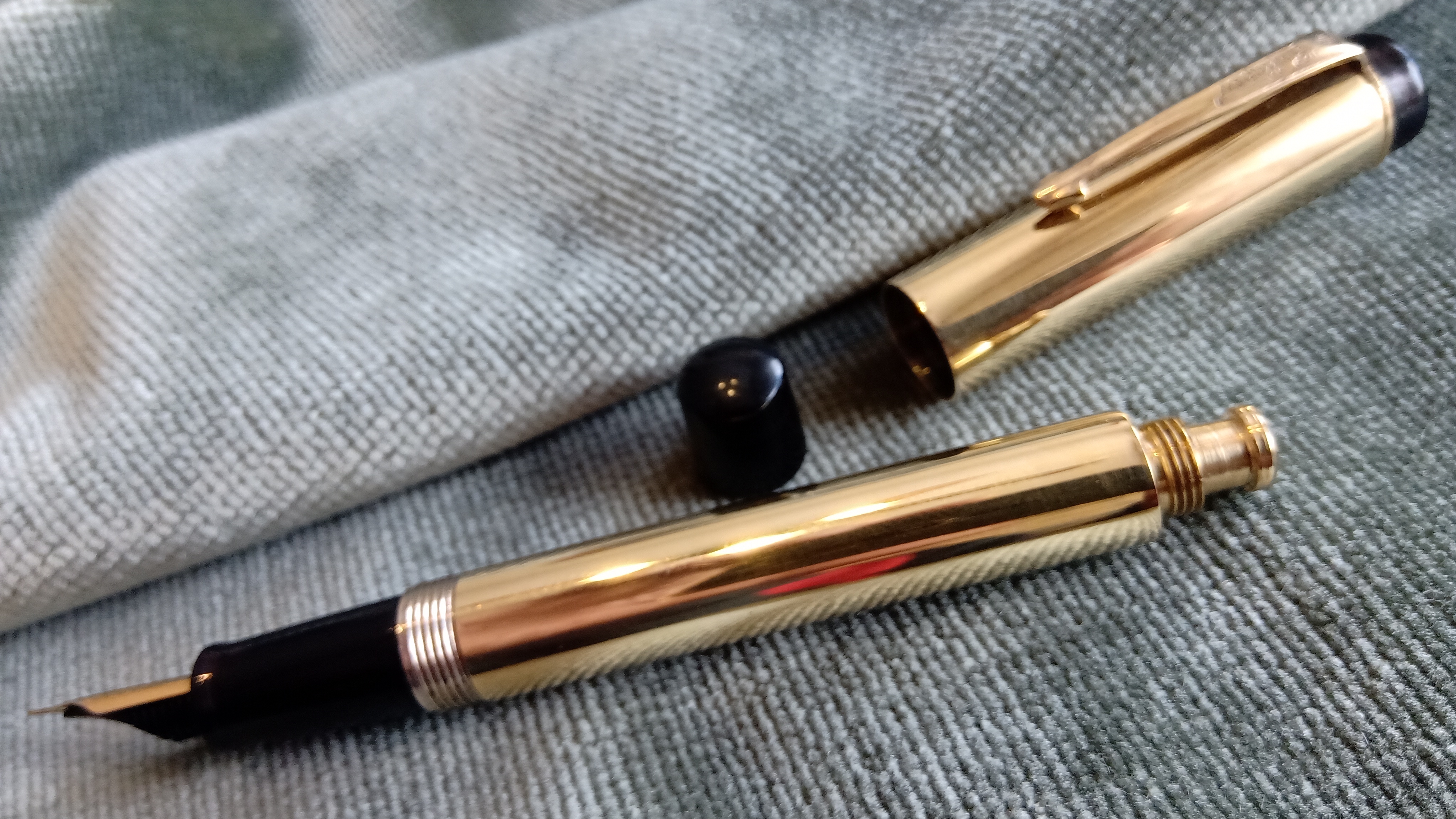 Si tratta di una Sheaffer's degli anni 60/70 quasi interamente prodotta in Argentina, e dico Sheaffer's e non Sheaffer, Imperial 777, Stylist Lifetime, con corpo, cappuccio e clip placcati oro incisi, con sistema di conversione aerometrica originale, impugnatura in acrilico nera, e un magnifico pennino corto conico originale, in argento palladio prodotto negli Stati Uniti, che ad un certo punto gli ho presentato nel forum e che scrive meravigliosamente...!!!