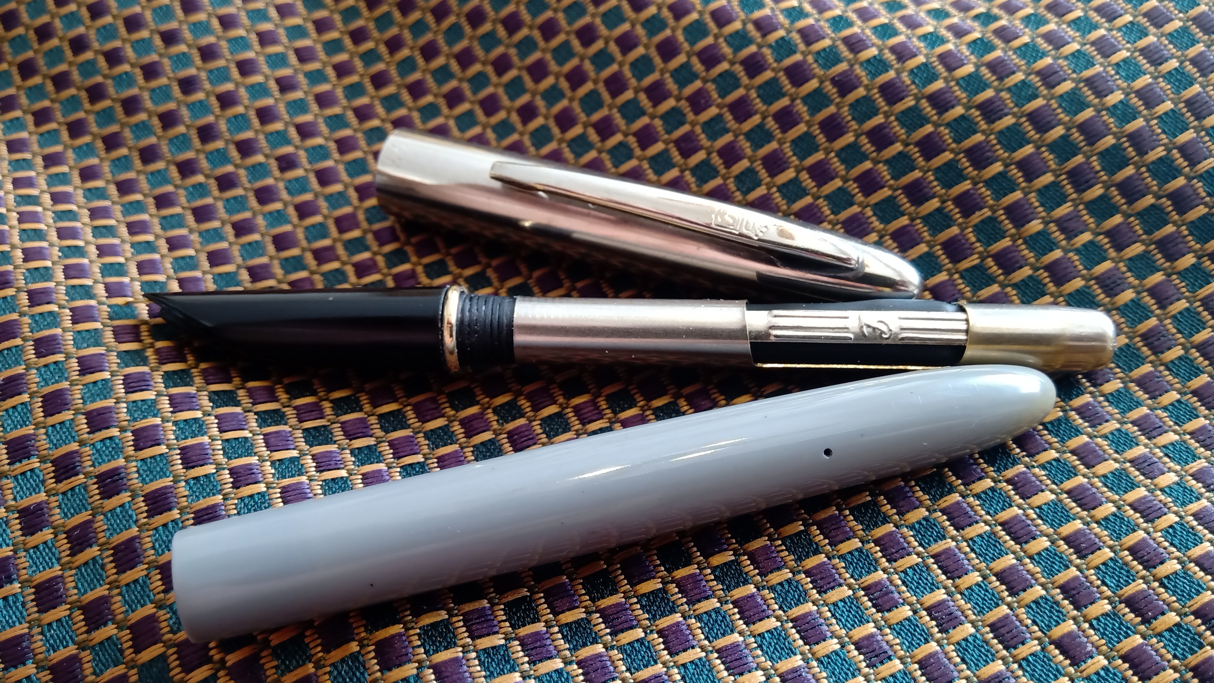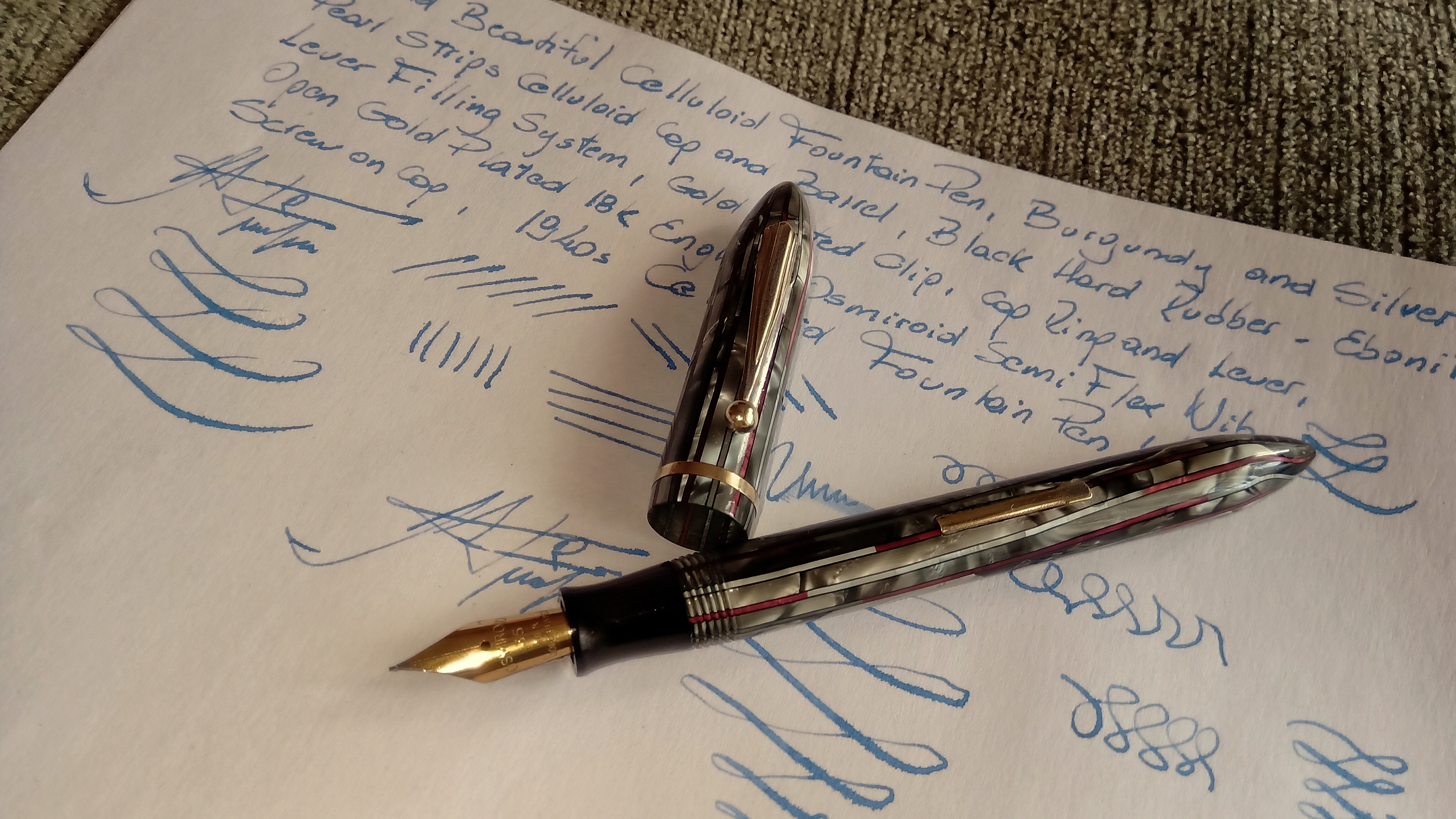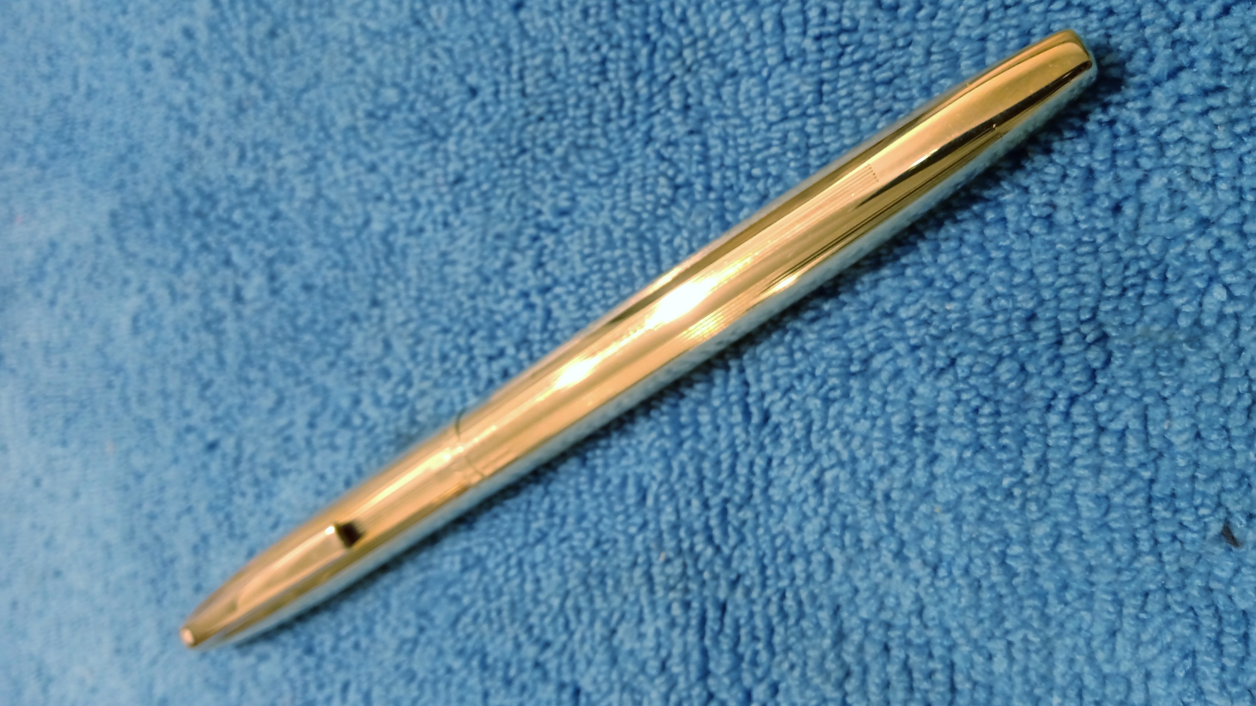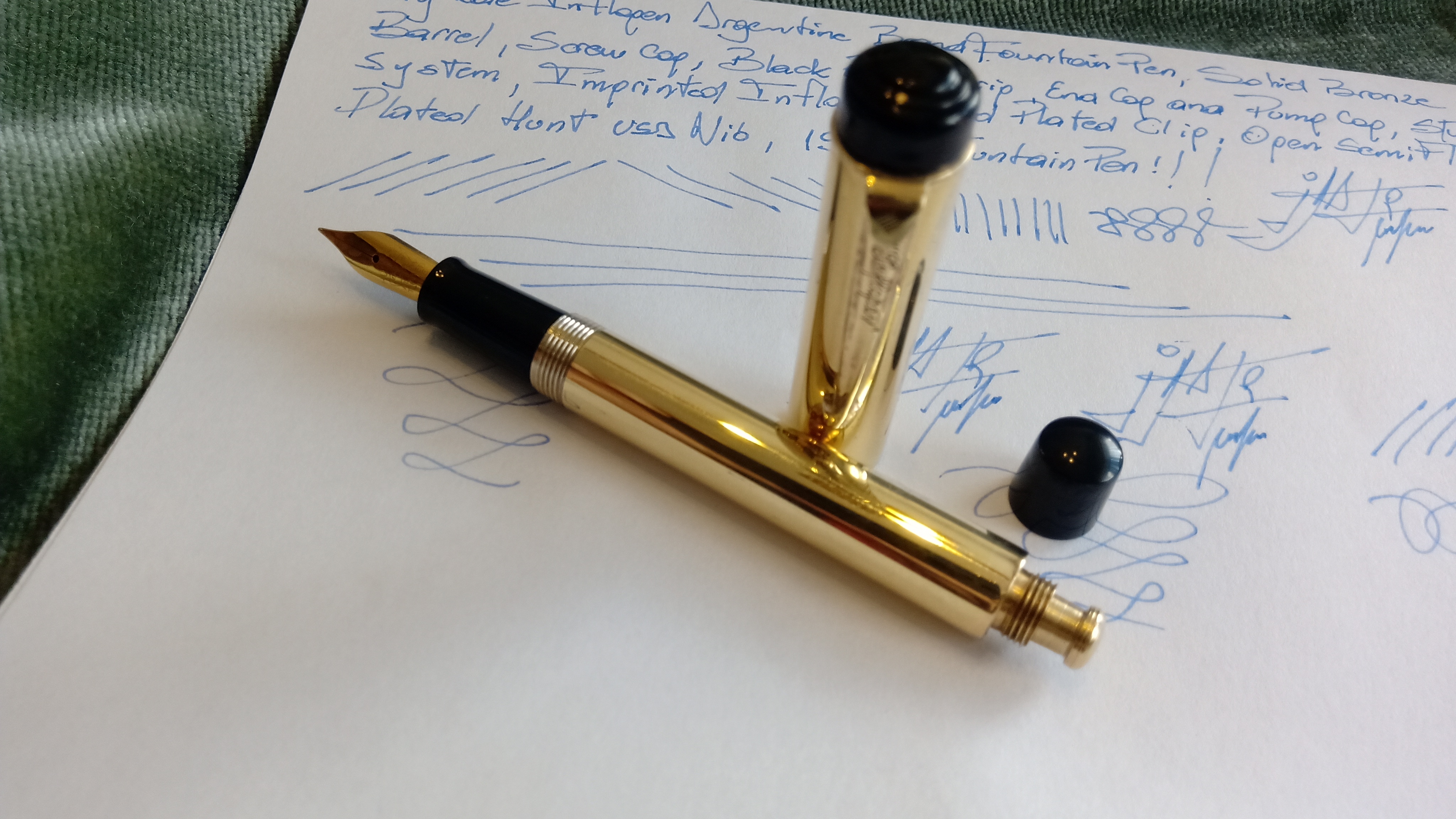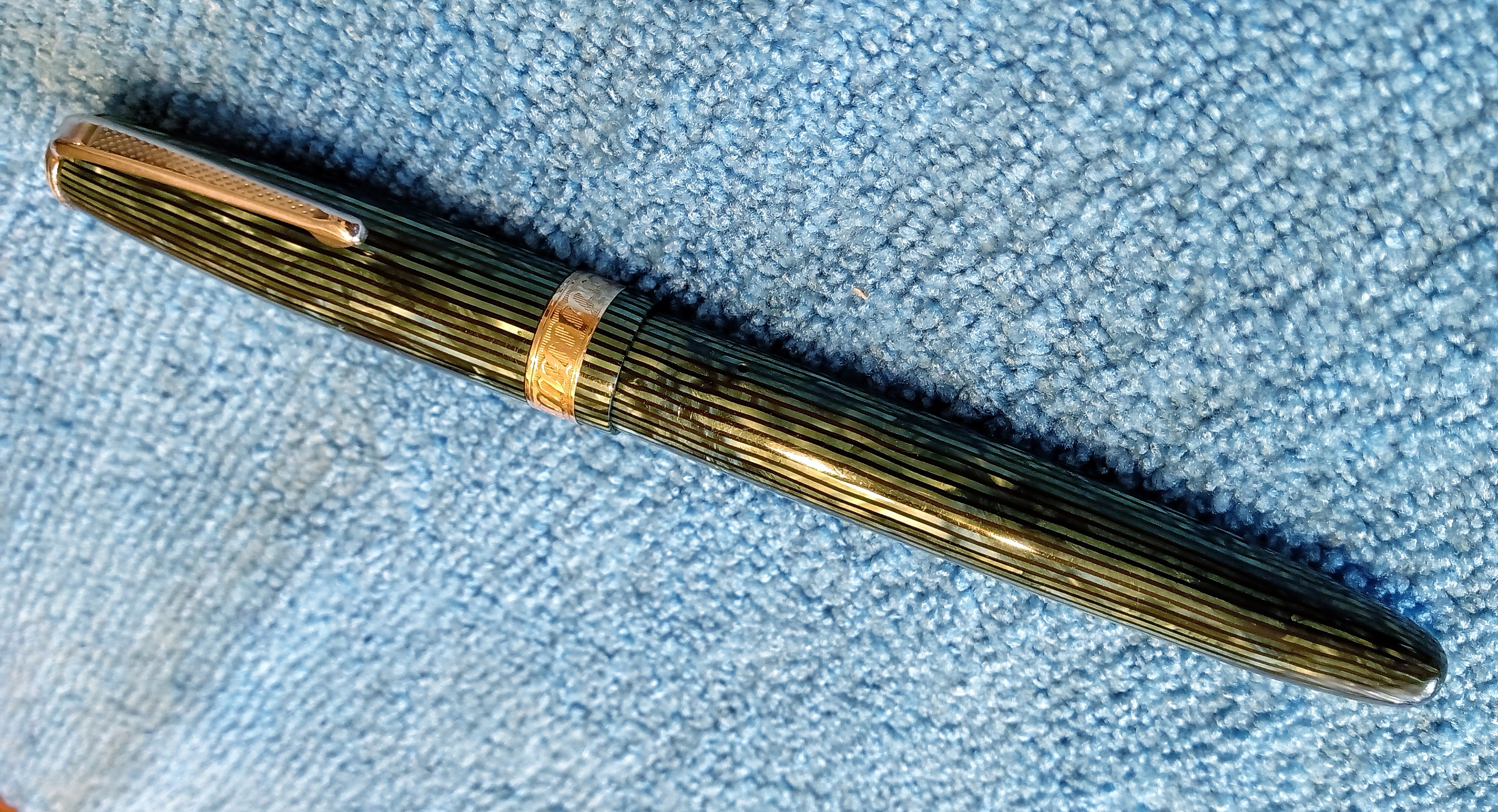 Si tratta di una Sheaffer's degli anni 60/70 quasi interamente prodotta in Argentina, e dico Sheaffer's e non Sheaffer, Imperial 777, Stylist Lifetime, con corpo, cappuccio e clip placcati oro incisi, con sistema di conversione aerometrica originale, impugnatura in acrilico nera, e un magnifico pennino corto conico originale, in argento palladio prodotto negli Stati Uniti, che ad un certo punto gli ho presentato nel forum e che scrive meravigliosamente...!!!