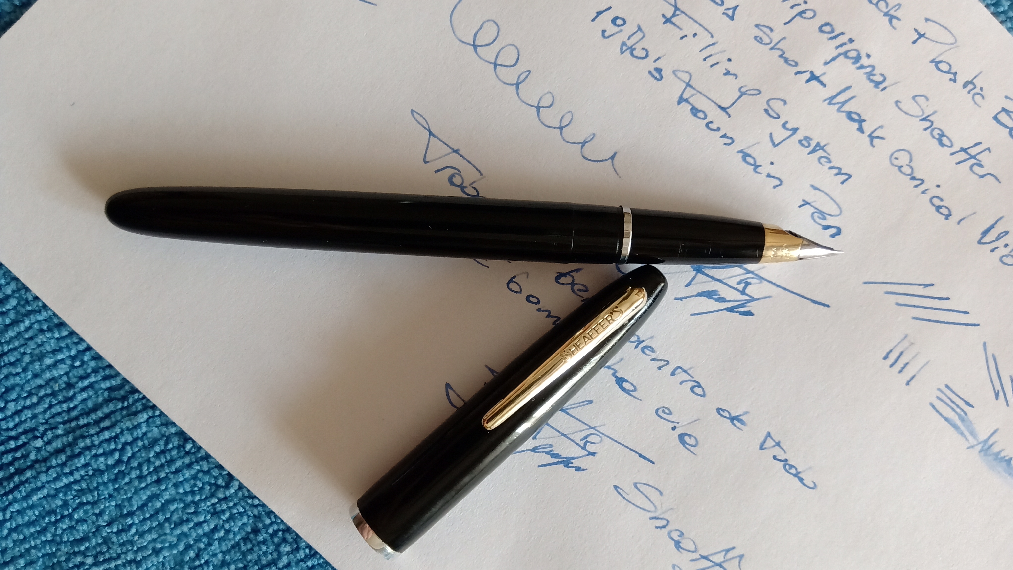 Una altra misteriosa Sheaffer's, e non Sheaffer, degli anni 60/70 made in Argentina, con clip in oro, cappuccio, corpo e impugnatura in acrilico nero, con sistema a cartuccia (è stato posizionato un convertitore), e un'interessante pennino conico corto originale, in oro con maschera in platino, prodotto negli U.S.A. e con una linea spessa...