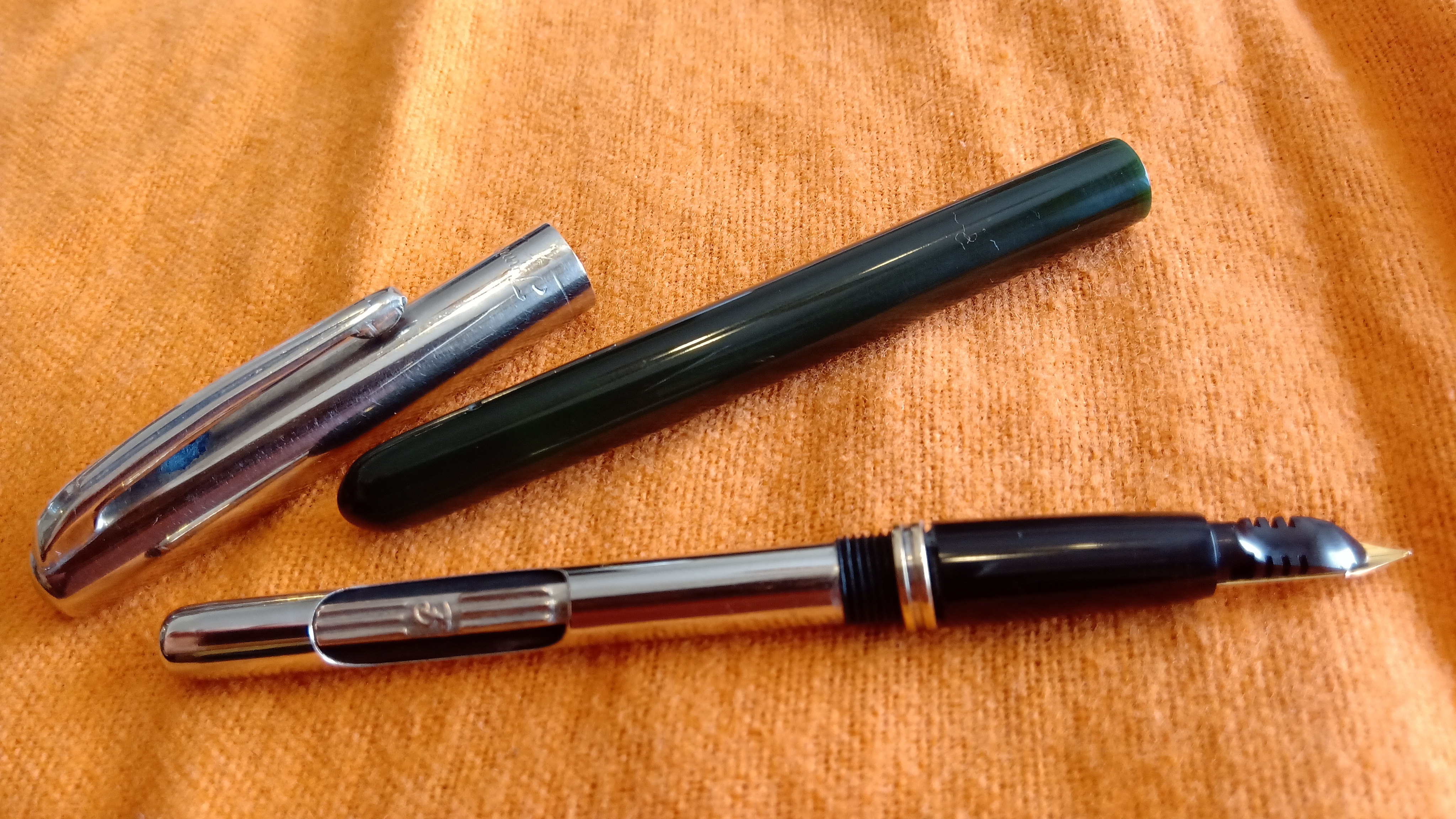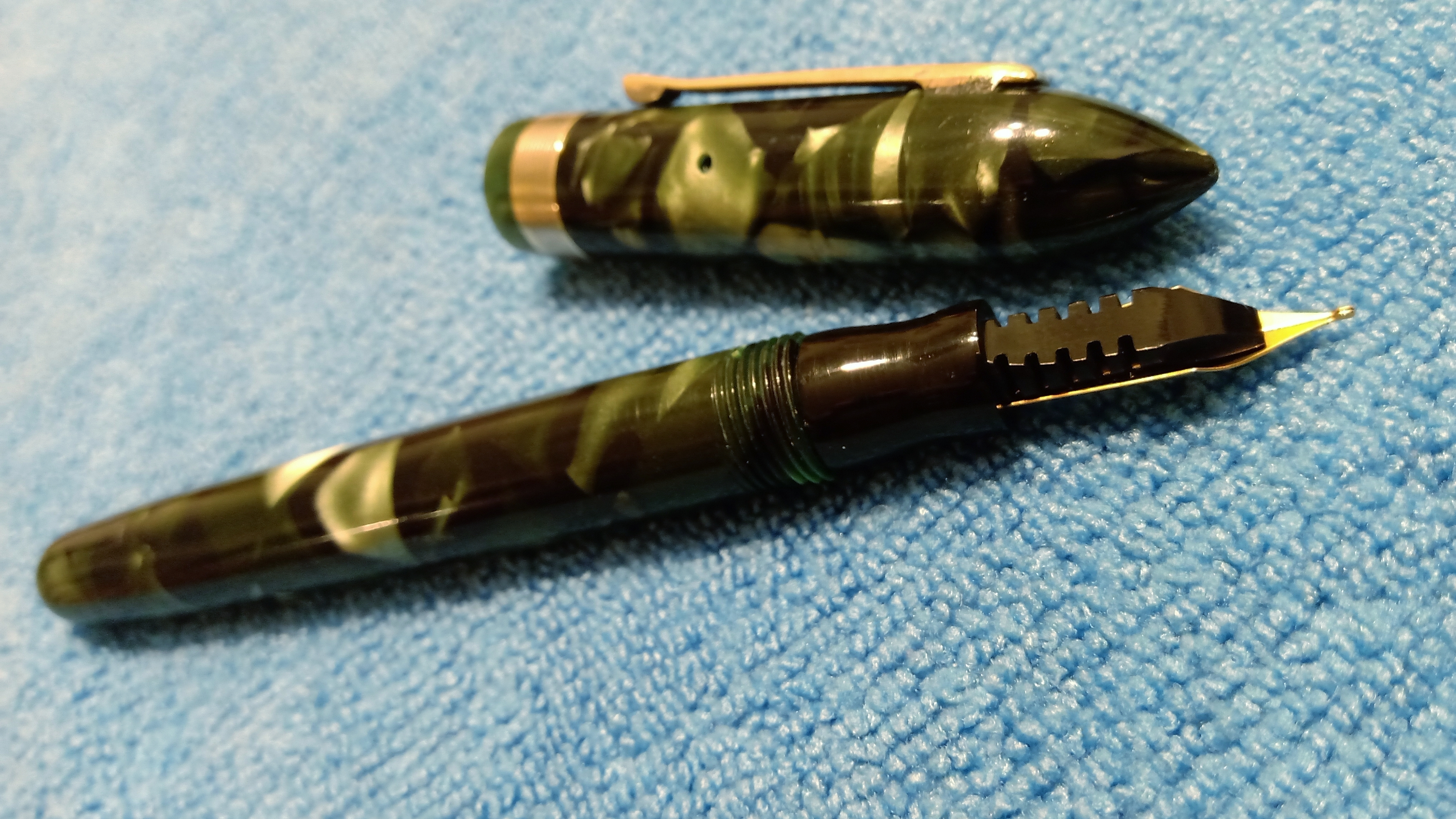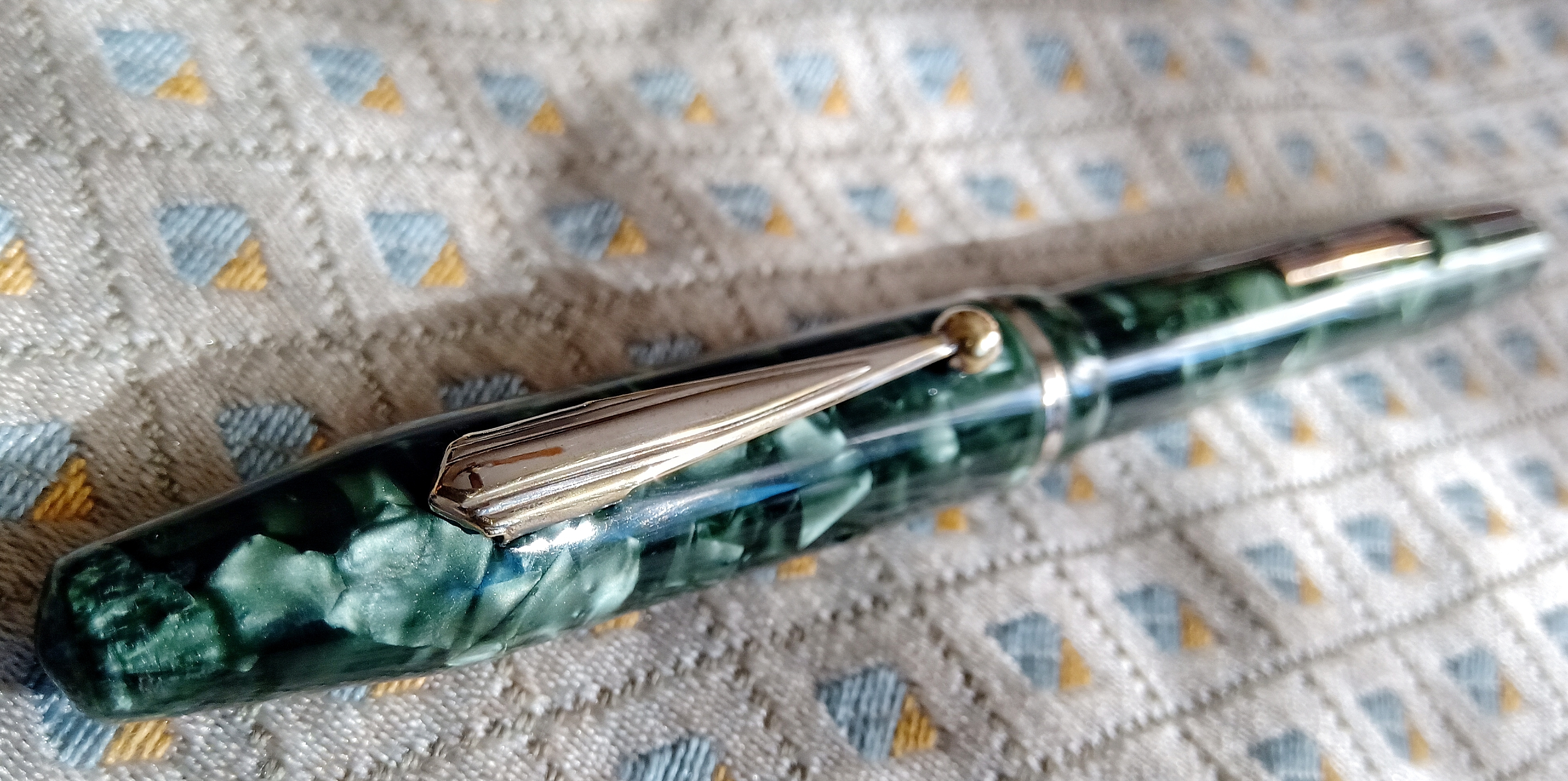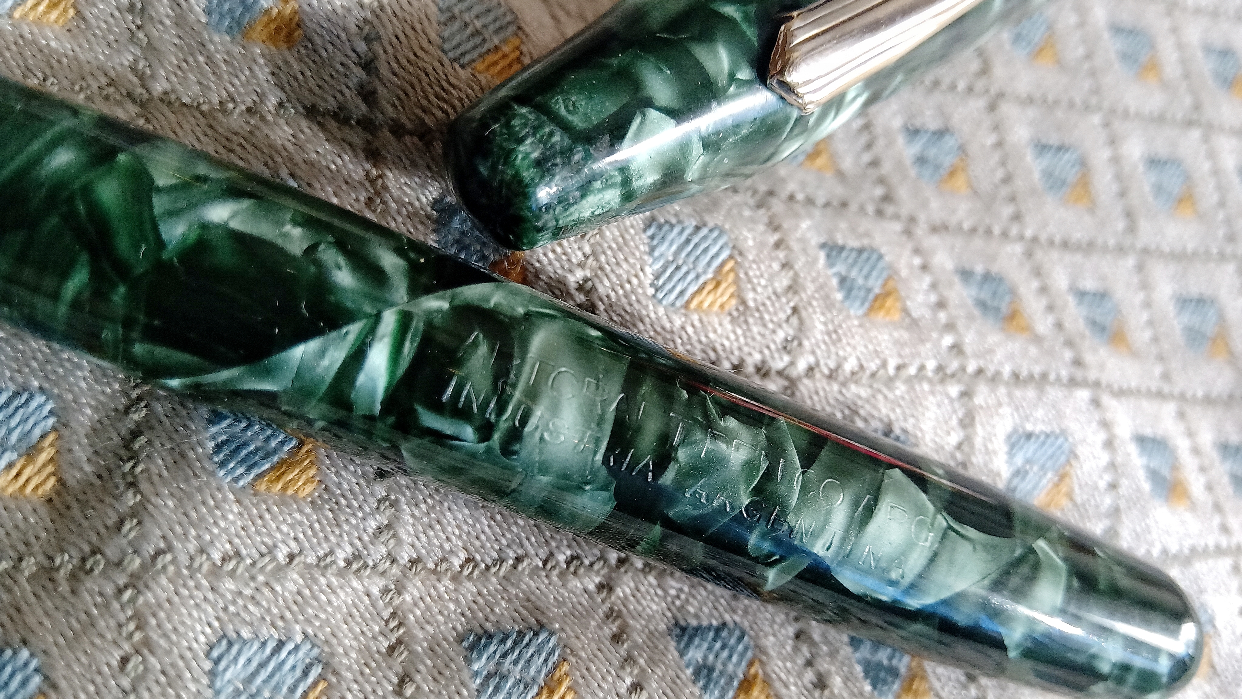 In questo caso un'altra stilografica degli anni 40 circa, dove compare solo l'impronta della provenienza ma non il marchio, con sistema di caricamento a leva, pennino aperto placcato oro non originale Iridium Tipped, impugnatura in ebanite, corpo e cappuccio in celluloide laminata , argento perlato e marmorizzato verde, clip, leva di caricamento e fascia del cappuccio cromate...