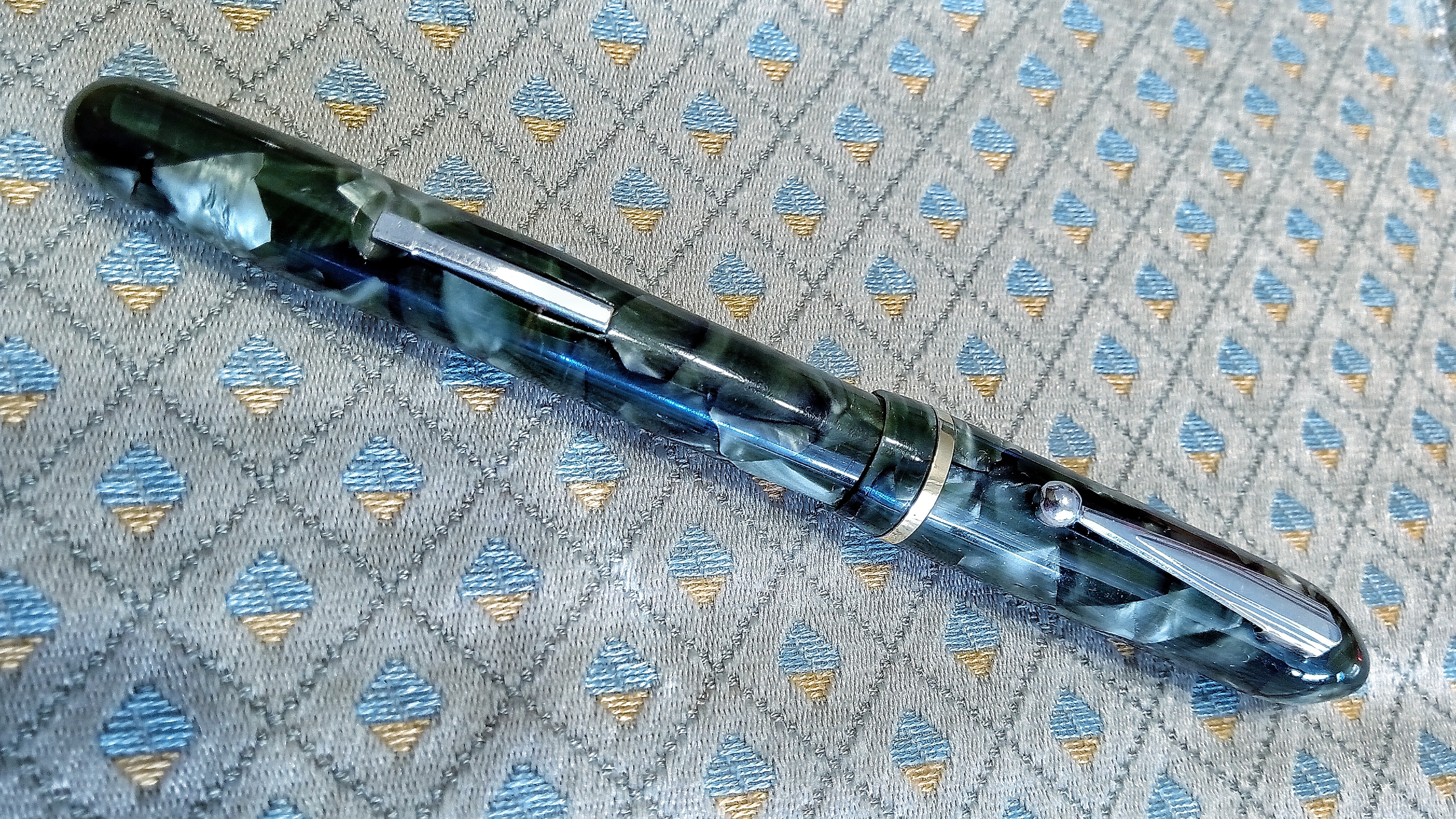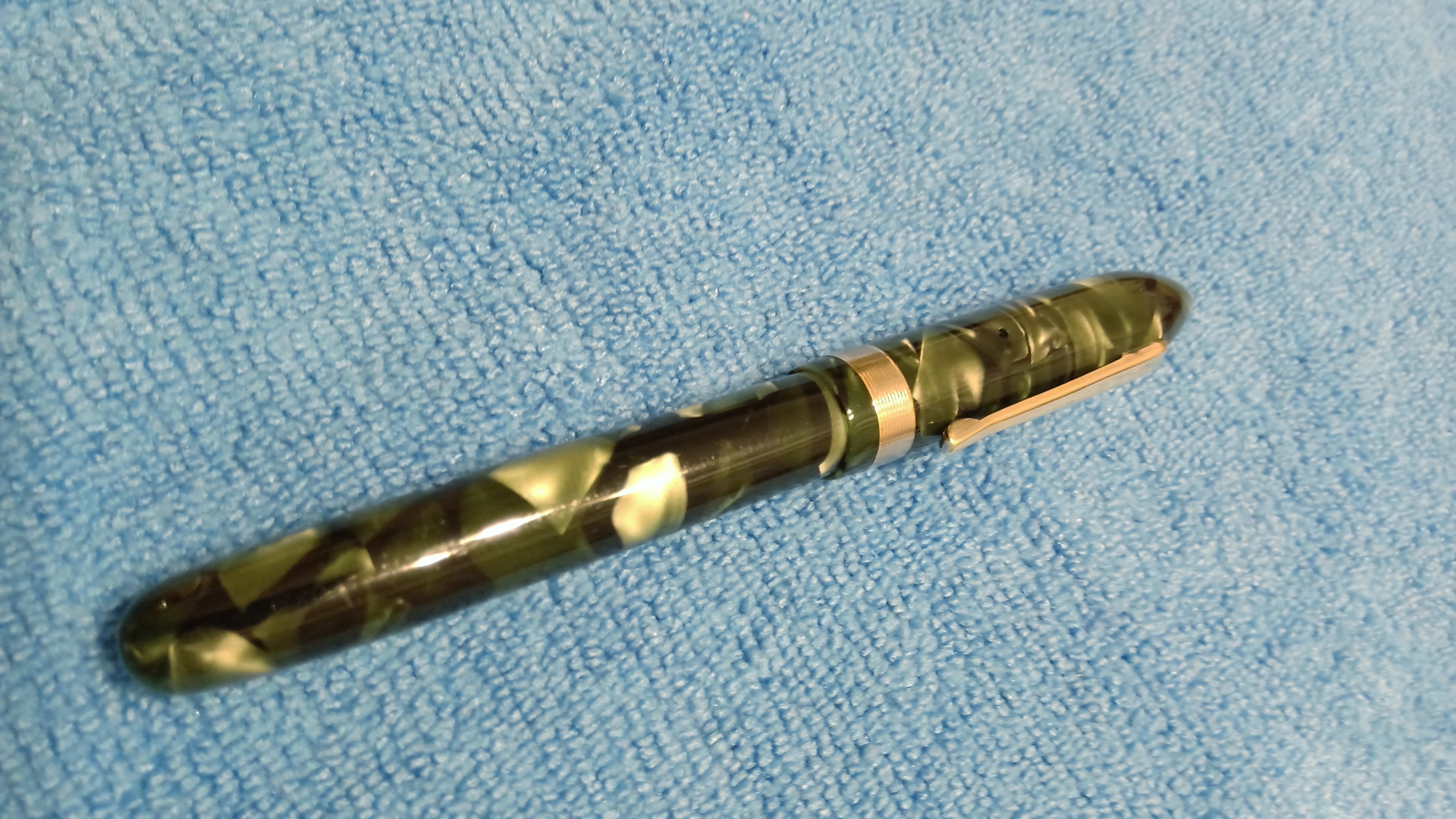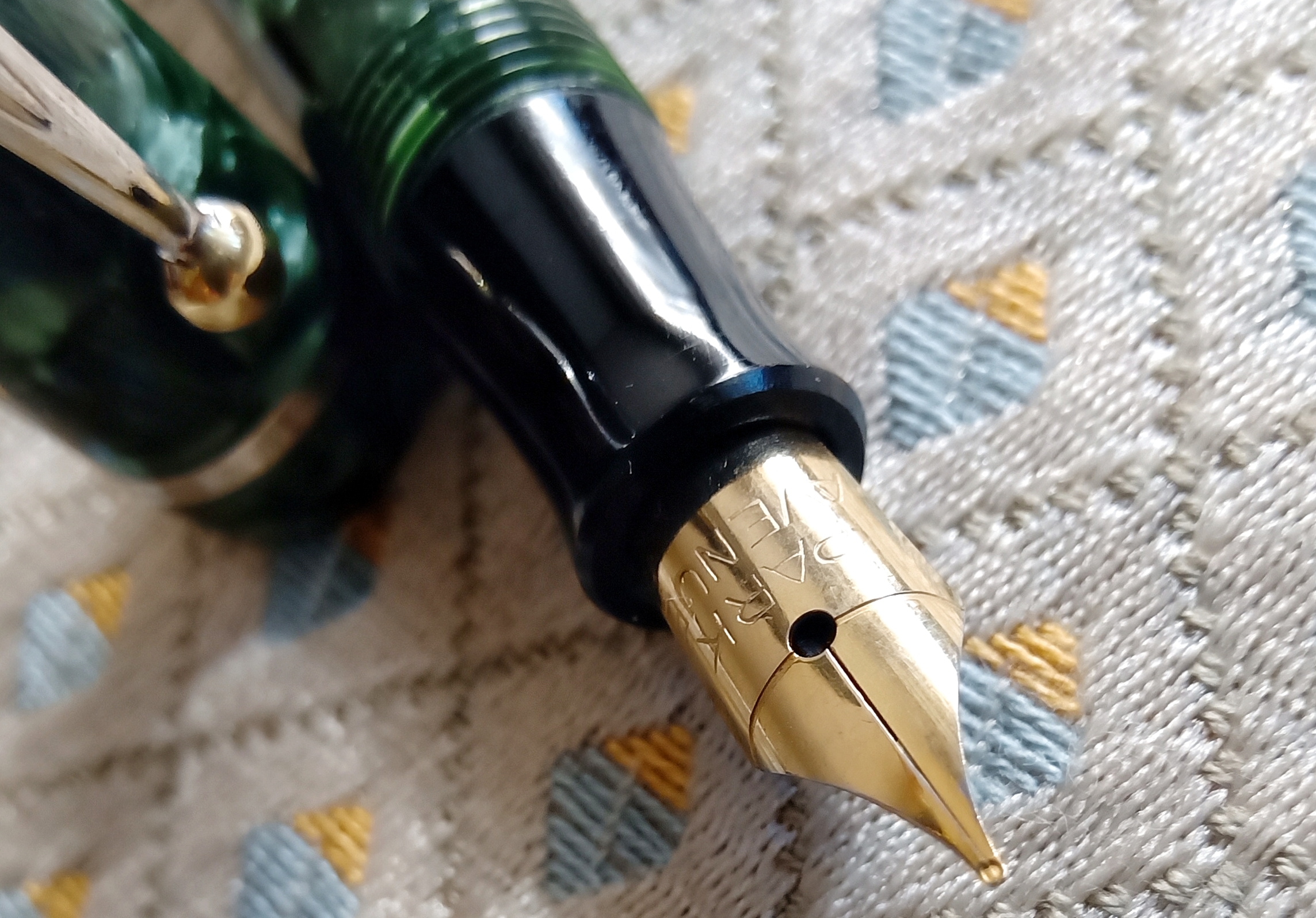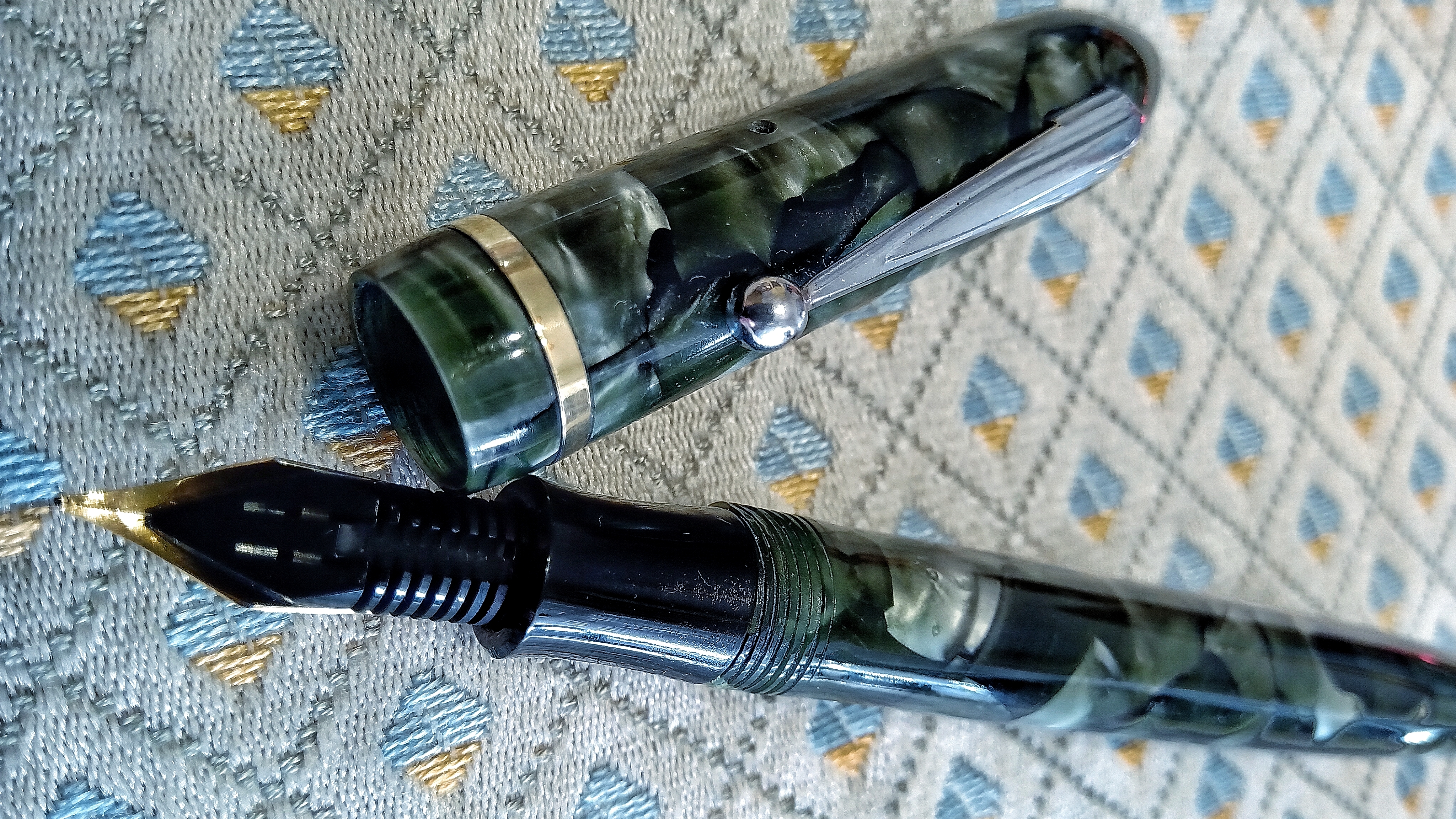 In questo caso un'altra stilografica degli anni 40 circa, dove compare solo l'impronta della provenienza ma non il marchio, con sistema di caricamento a leva, pennino aperto placcato oro non originale Iridium Tipped, impugnatura in ebanite, corpo e cappuccio in celluloide laminata , argento perlato e marmorizzato verde, clip, leva di caricamento e fascia del cappuccio cromate...