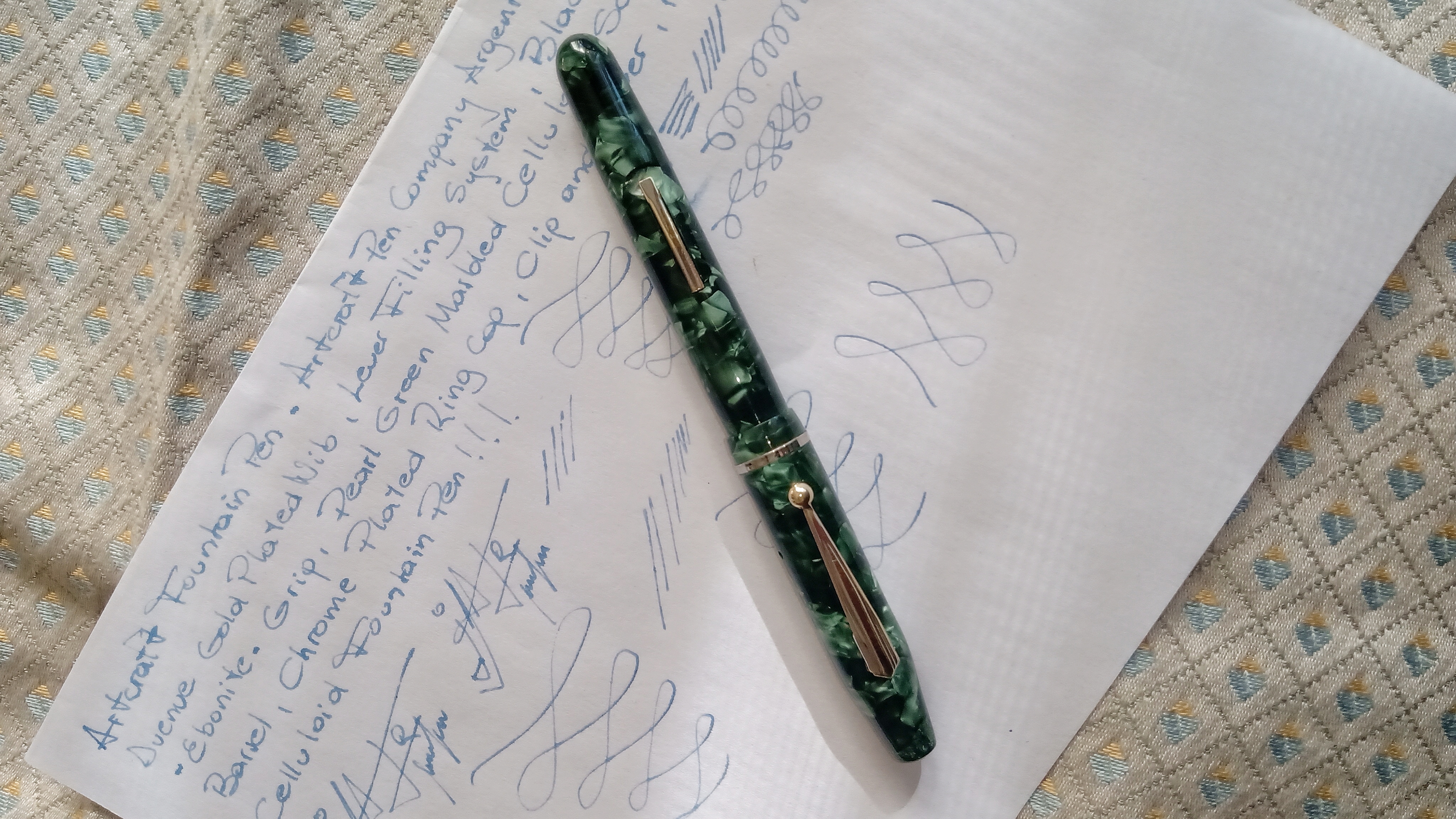 Lasciando ora queste penne stilografiche di marche internazionali che all'epoca venivano prodotte da filiali in Argentina, passiamo ora a marche propriamente argentine, come nel caso di Artcraft, azienda nata negli U.S.A. e che negli anni 30, in piena crisi finanziaria, finì per trasferirsi e continuare a produrre i suoi modelli in Argentina, come nel caso di questo Artcraft prodotto negli anni '40 dalla Artcraft Pen Company del paese, con un sistema di ricarica leva, pennino a vista Park Avenue placcato oro originario degli U.S.A., impugnatura in ebanite, corpo e cappuccio in celluloide laminata, argento perlato e verde smeraldo marmorizzato, clip, leva di caricamento e anelli del cappuccio cromato...