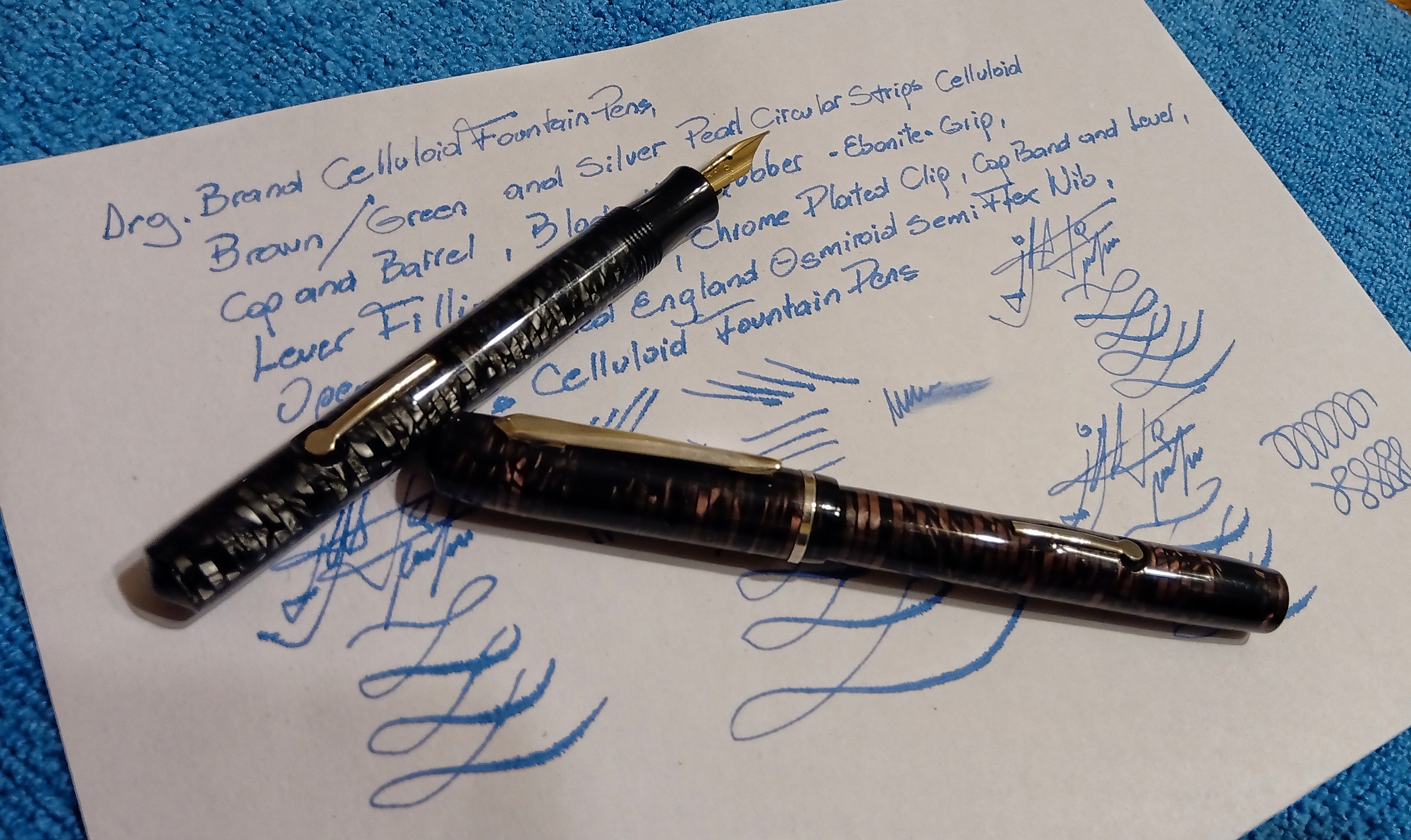 oppure queste due stilografiche marca Escritor (sottomarca della Artcraft) degli anni 40 circa, con sistema di caricamento a leva, pennino aperto non originale Osmiroid placcato oro, impugnatura in ebanite, corpo e cappuccio in celluloide laminata in astuccio con anelli in perlato argento e verde e nell'altro caso in argento perlato e rame, e clip a leva e anello cappuccio cromato...