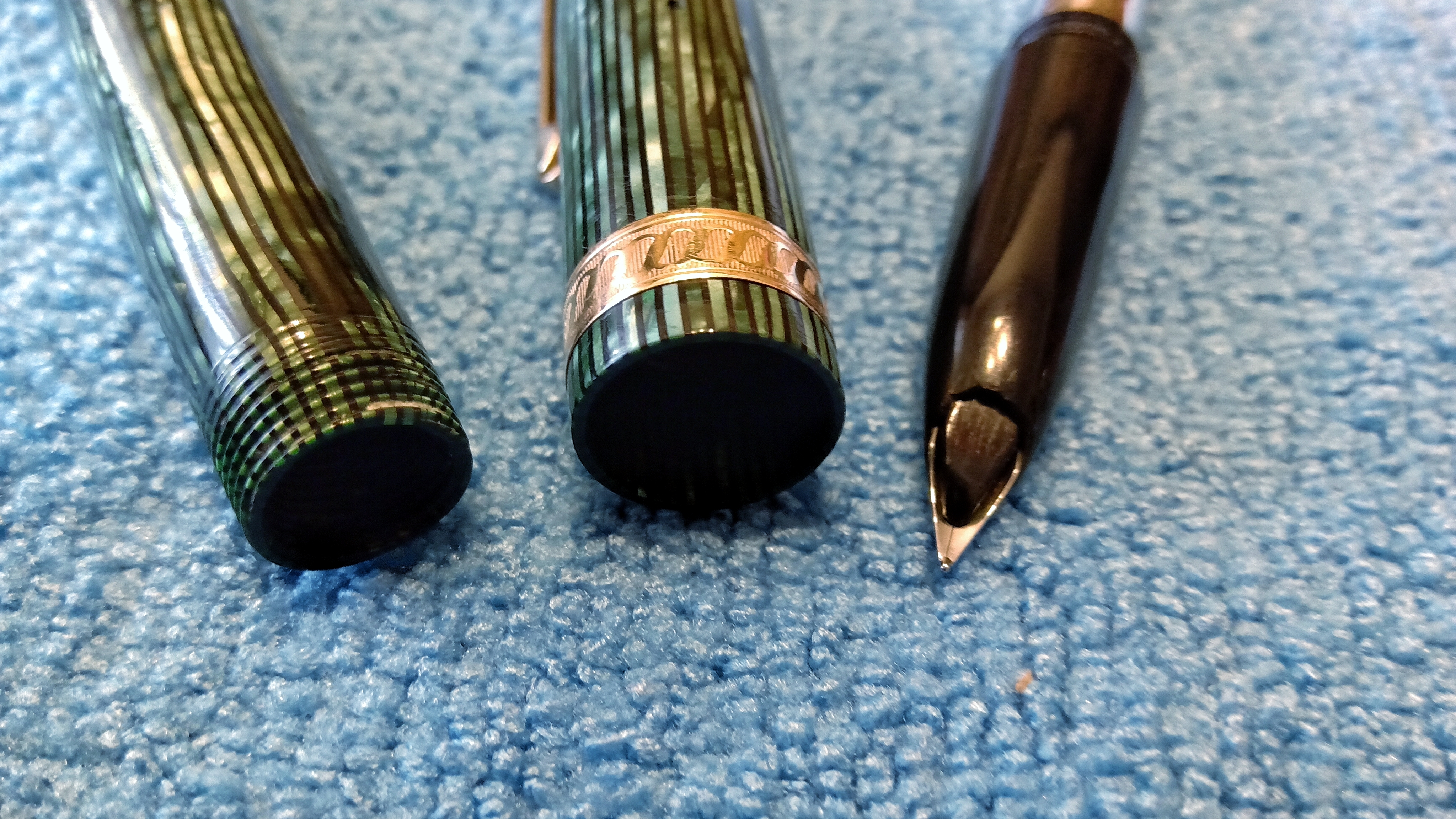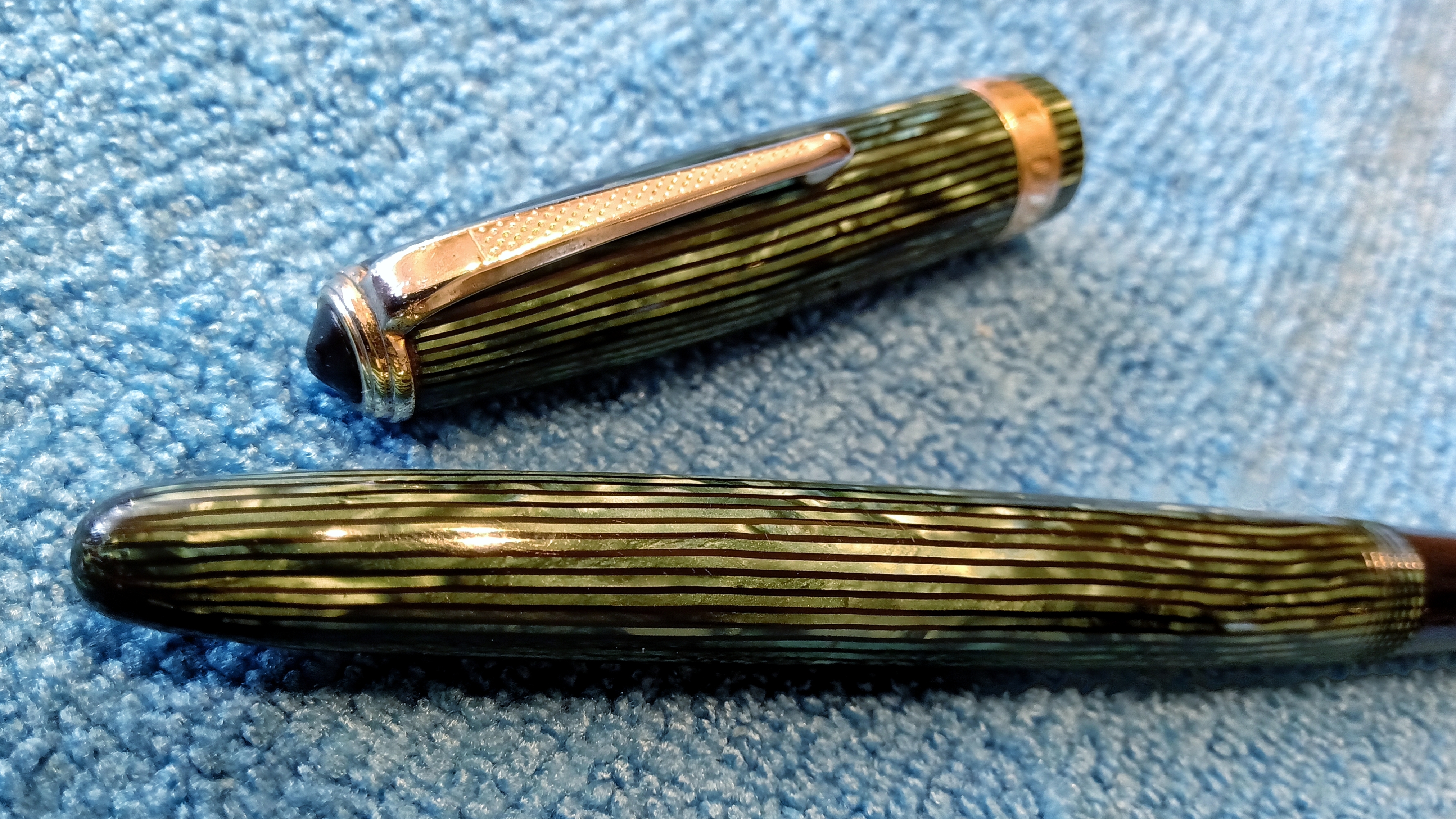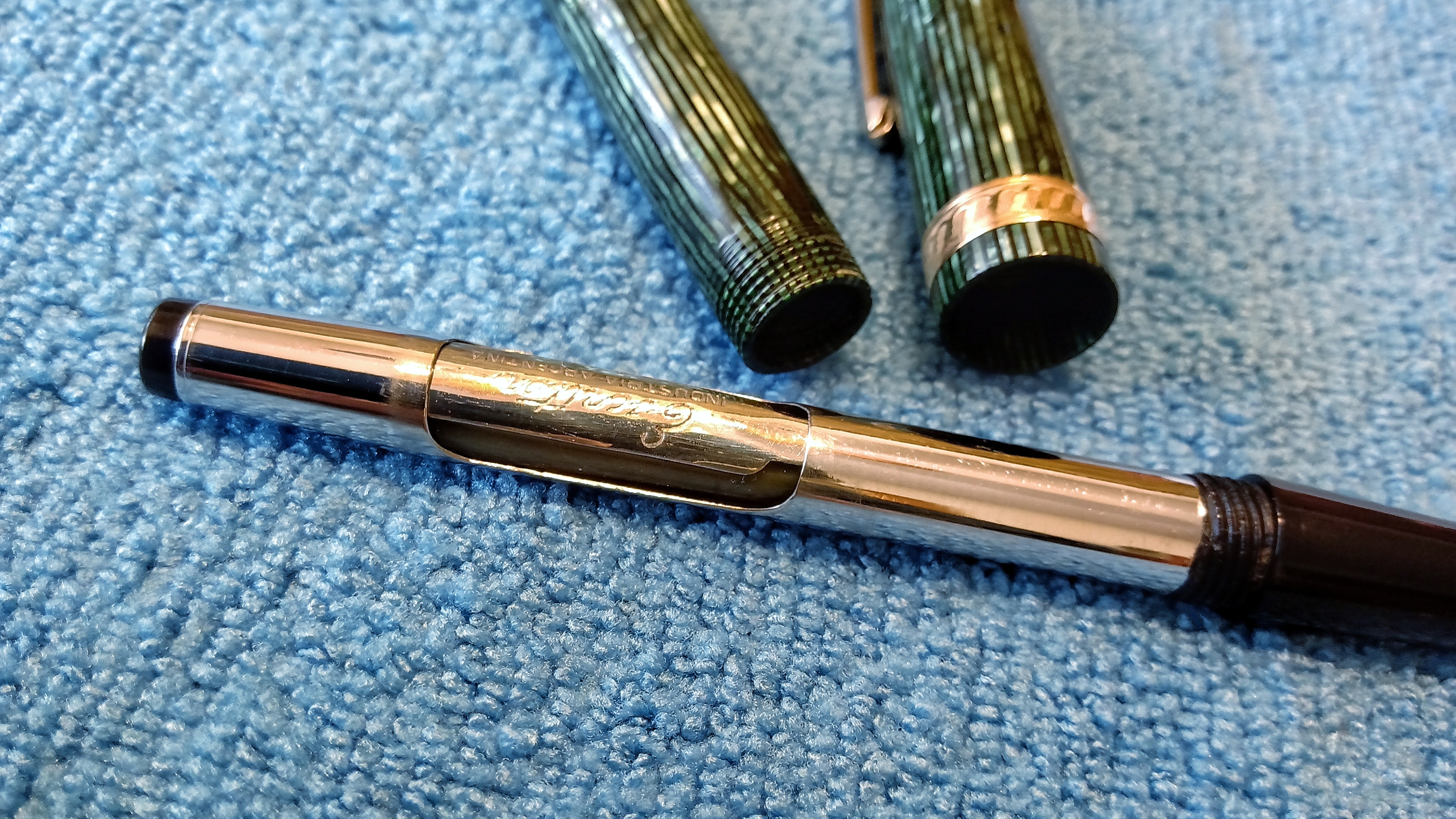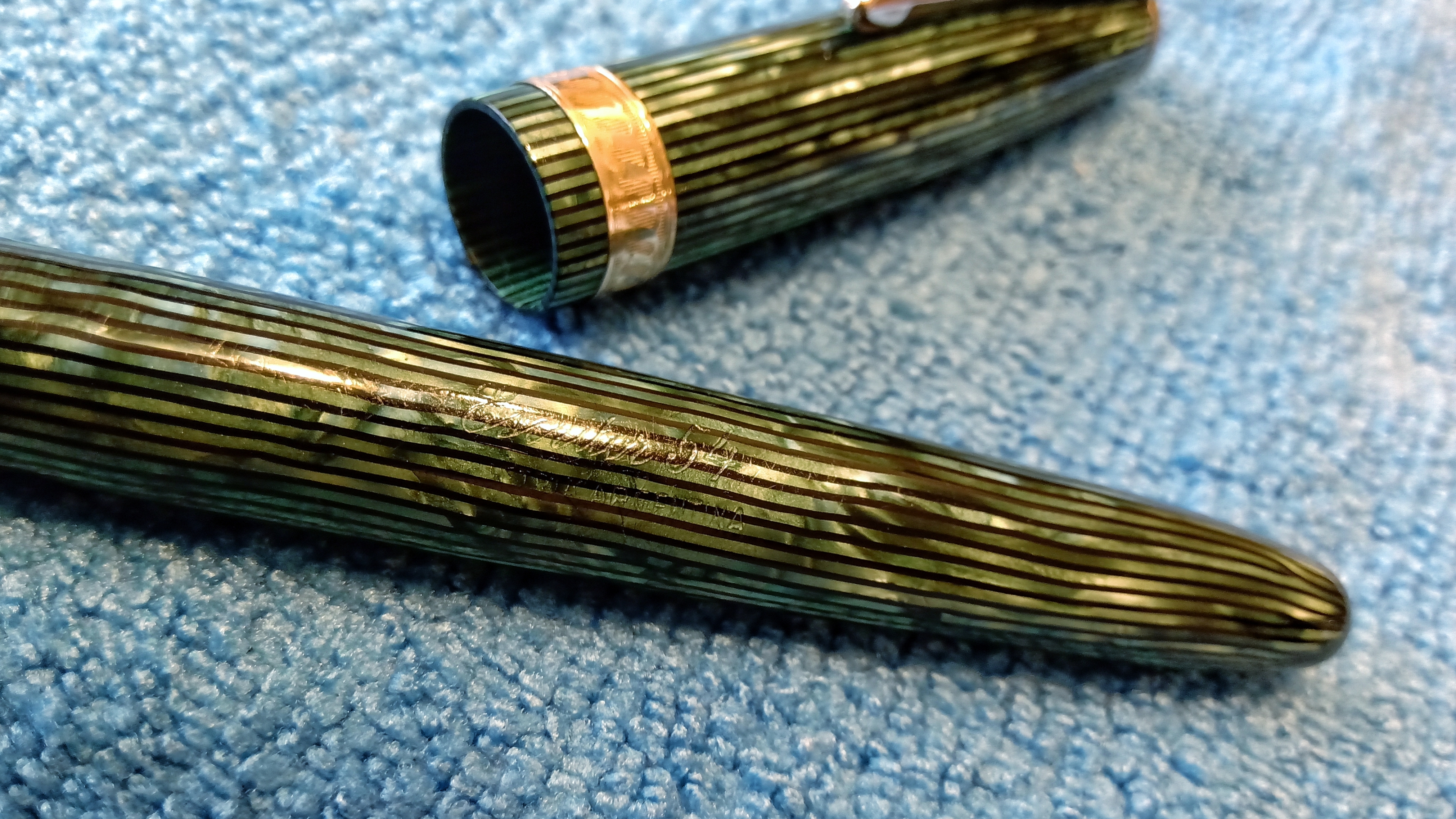 Altro marchio made in Argentina, Federal..., anni 40, con sistema di caricamento a leva, pennino aperto Signature non originale placcato oro, impugnatura in ebanite, corpo e cappuccio in celluloide laminata argento perlescente marmorizzato e un bellissimo verde bosco, levetta, clip e ampia fascia sul cappuccio con incisione dell'orologiaio placcata in oro...