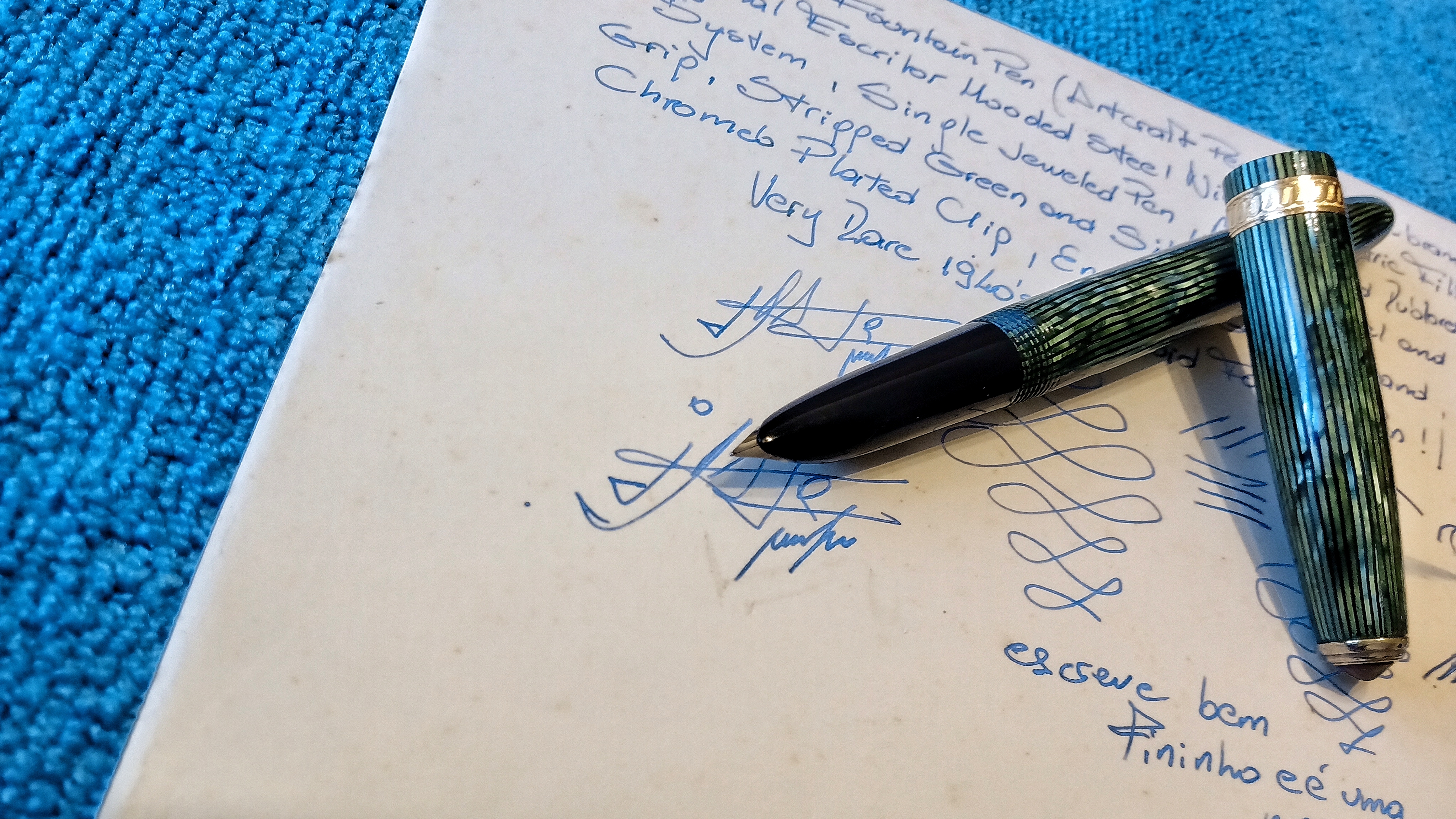 Veniamo ora a questa splendida penna stilografica, sempre della ditta Artcraft, intorno agli anni 40/50, creata per competere come seconda opzione alla Parker 51, la Escritor 54, con sistema di caricamento aerometrico, gioiello nero, impugnatura in ebanite, corpo e cappuccio in celluloide laminata con scanalature longitudinali in argento perlato e verde, clip placcata oro, fascia incisa in oro sul cappuccio, e penna cilindrica semicoperta originale in acciaio marca Escritor, che continua a scrivere meravigliosamente...!!!